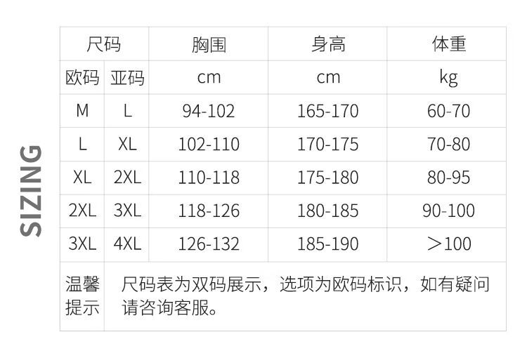 China (cm) 165 / 88-90 170 / 96-98 175 / 108-110 180 / 118-122 185 / 126-130