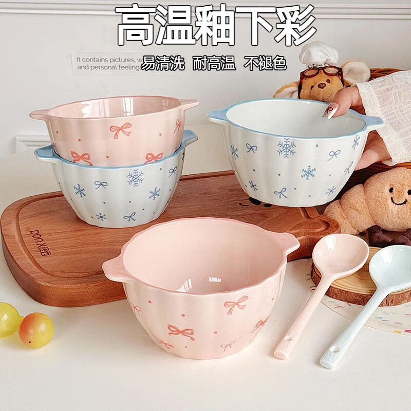High-looking snowflake bow ceramic double-ear soup bowl yogurt bowl underglaze color household tableware microwave instant noodle bowl Chuxue blue pumpkin double-ear bowl 1 high-temperature underglaze color material