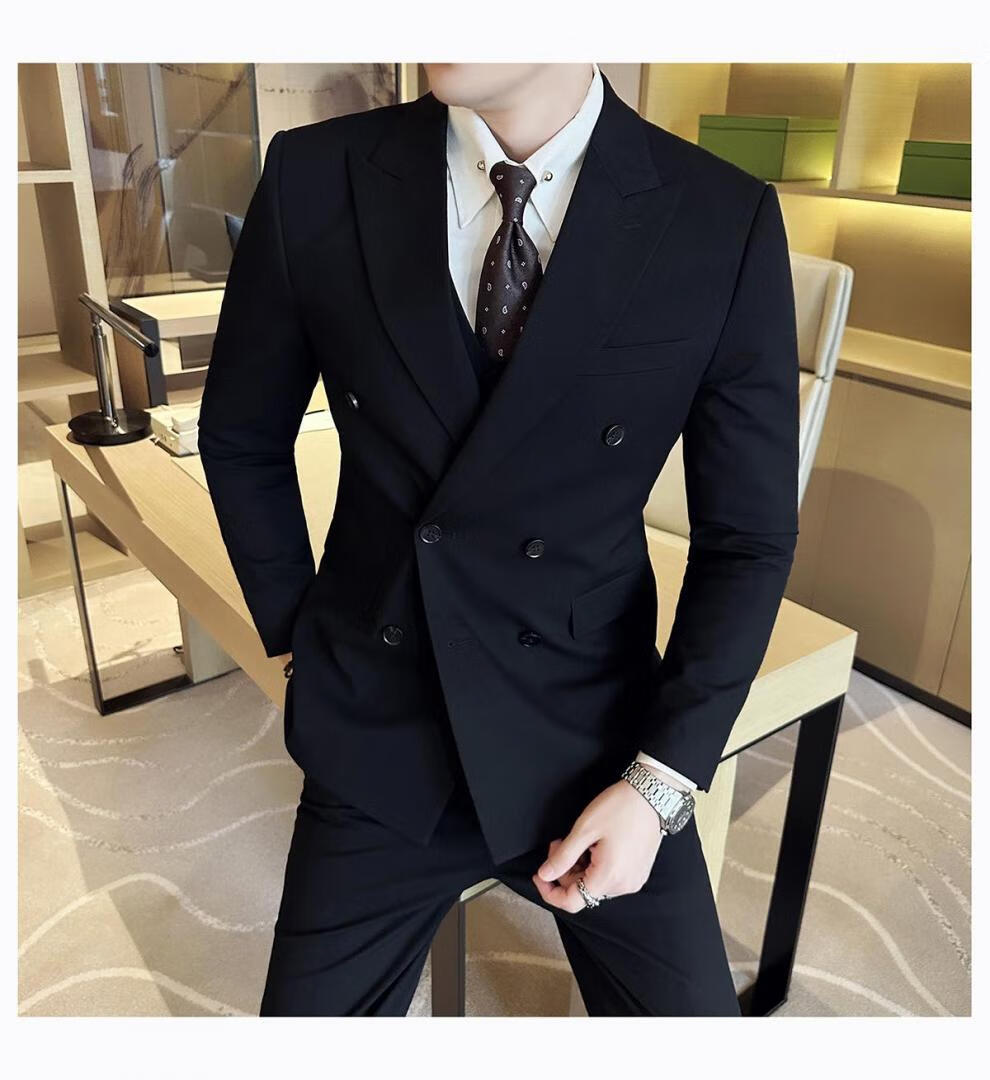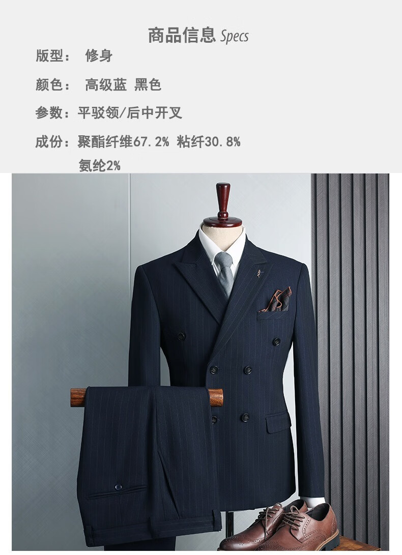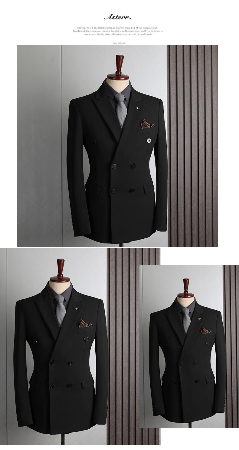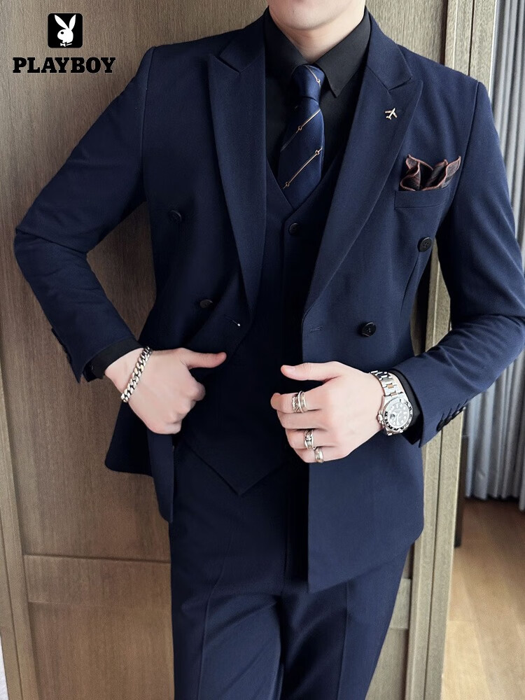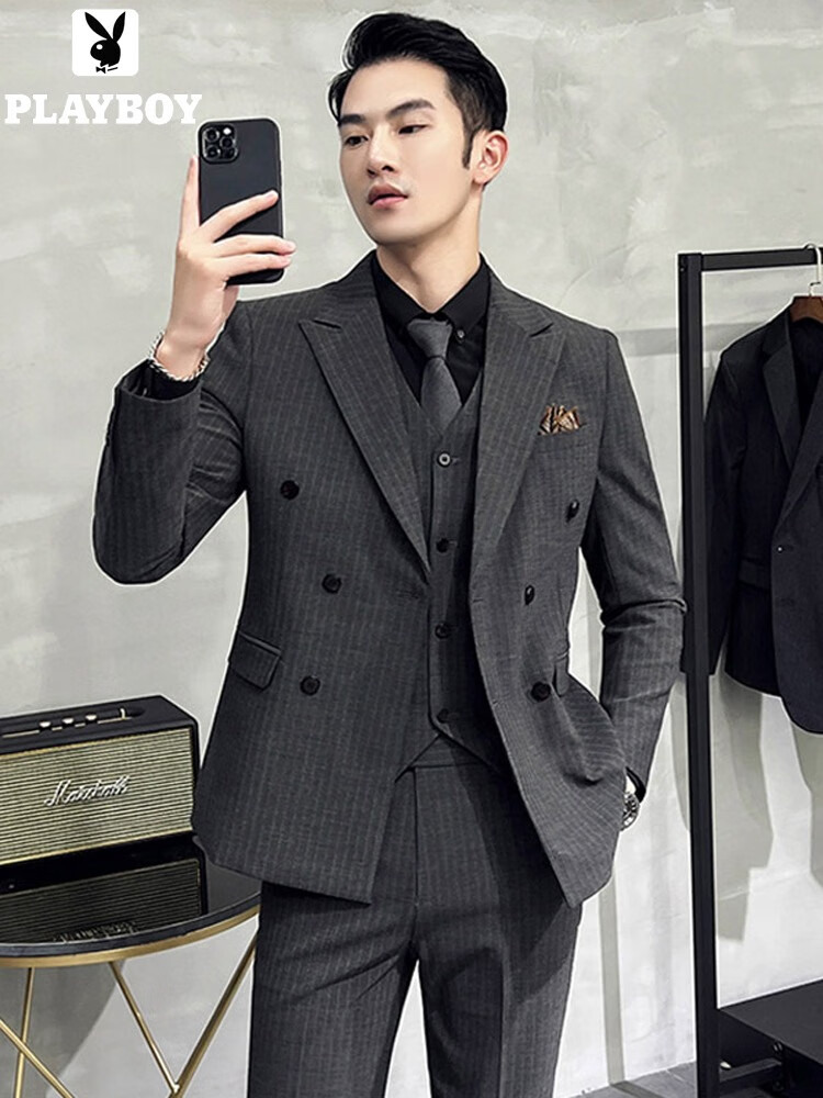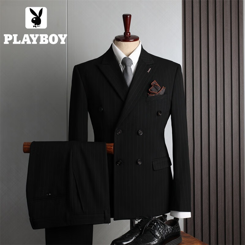 Playboy Suit Men's Double Breasted Business Casual Stretch Suit Three Piece Groom Wedding Dress Double Striped Black (Top + Pants + Vest) Free Shirt + Tie + Leather 2XL Weight (153-165Jin Jin is equal to 0.5kg)