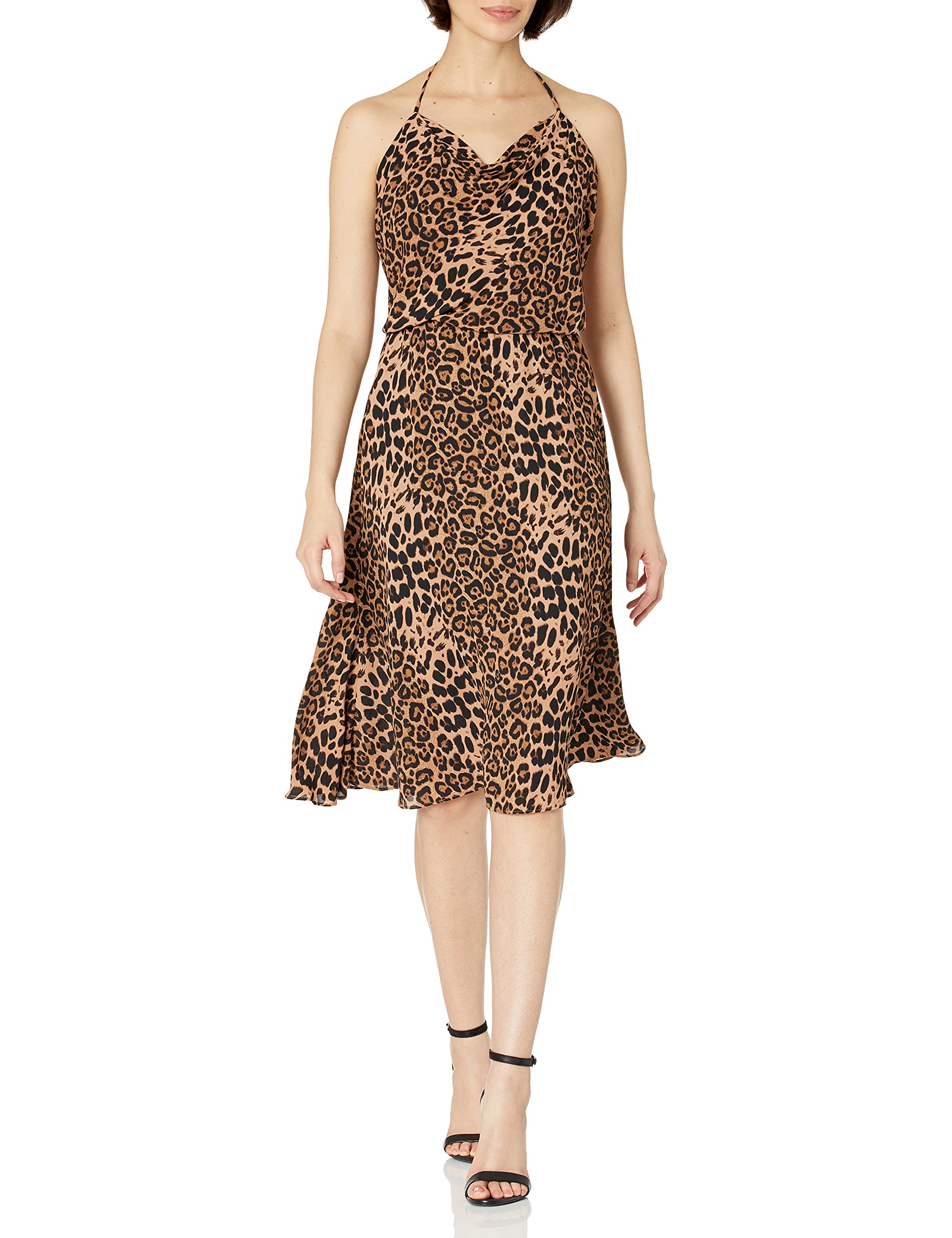 Dress the Population Women's Leopard Sequin Dress Knee Length Party Style Adult Halter Collar Taupe Leopard Medium