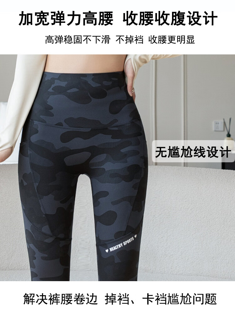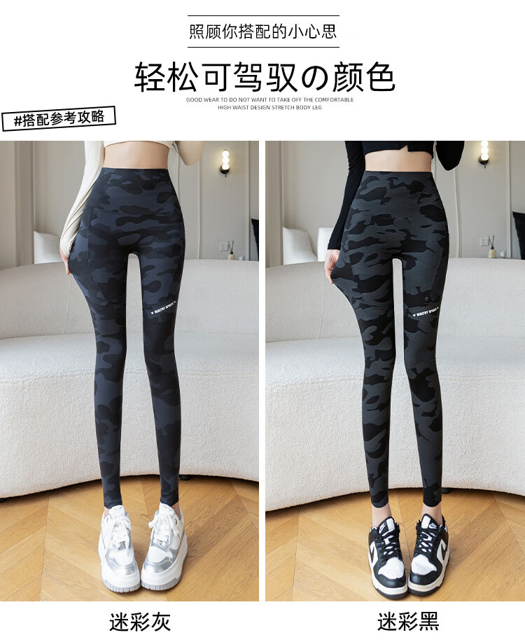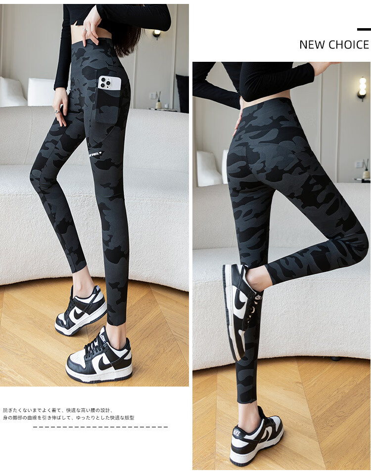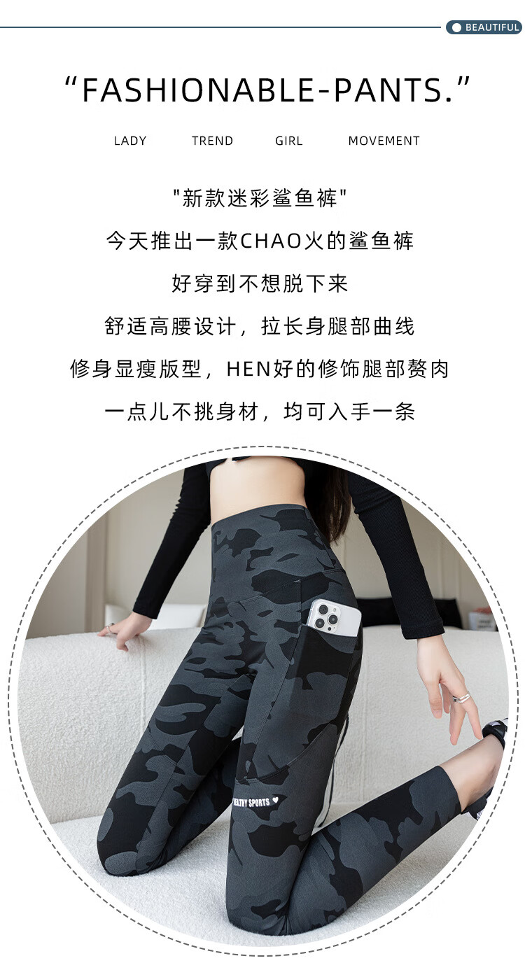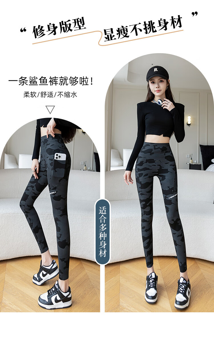 Camouflage double pocket shark pants plus velvet leggings for women's outer wear 2025 new autumn and winter large size tummy control pants yoga pants black - sherpa - double pocket style thickened velvet 2XL suitable for 130-150Jin Jin equals 0.5 kg
