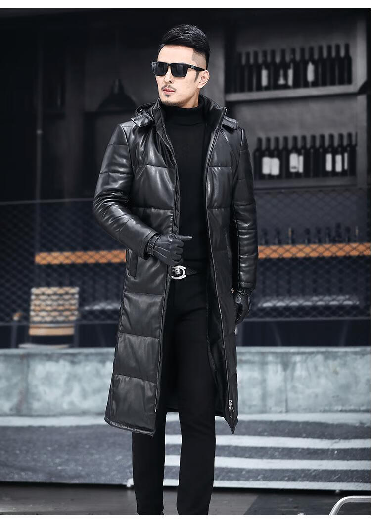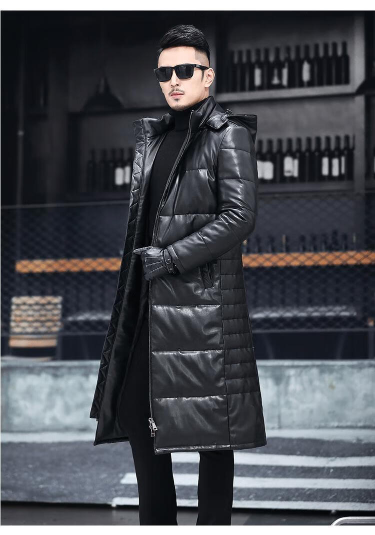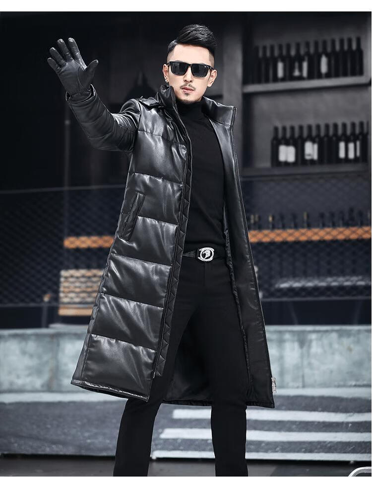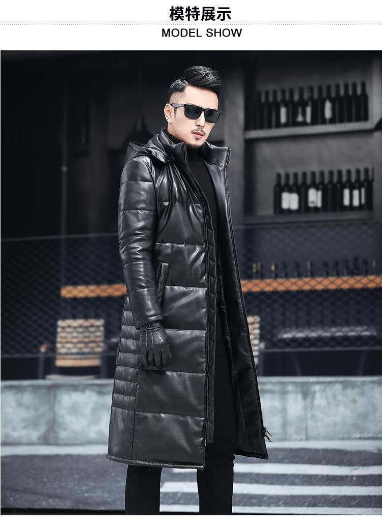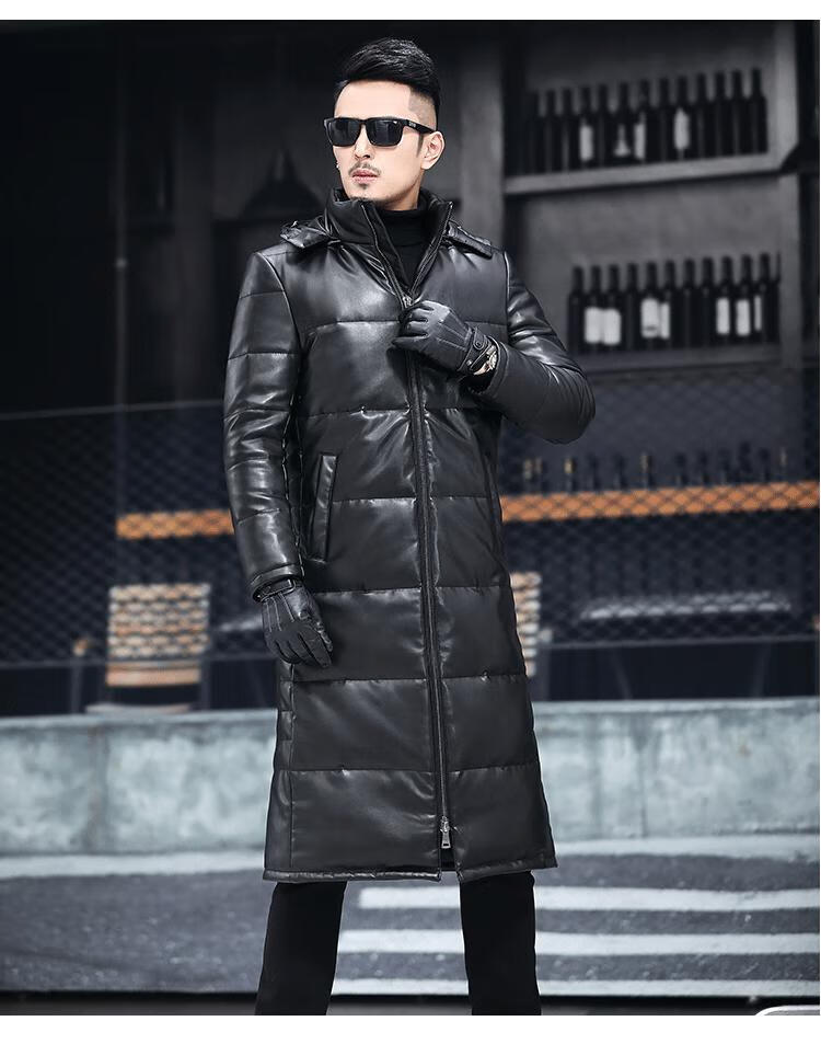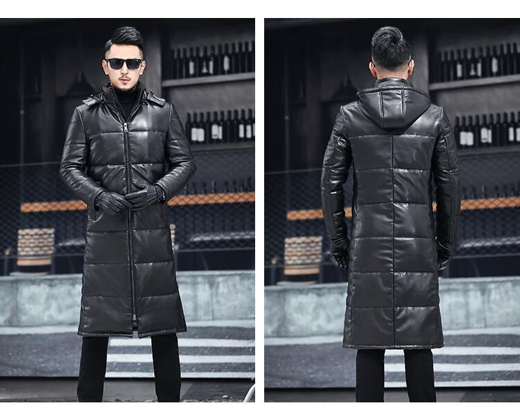 Matchstick's new over-the-knee extra-long leather jacket for men, sheepskin leather jacket, hooded leather windbreaker, thickened and warm men's jacket, trendy black M