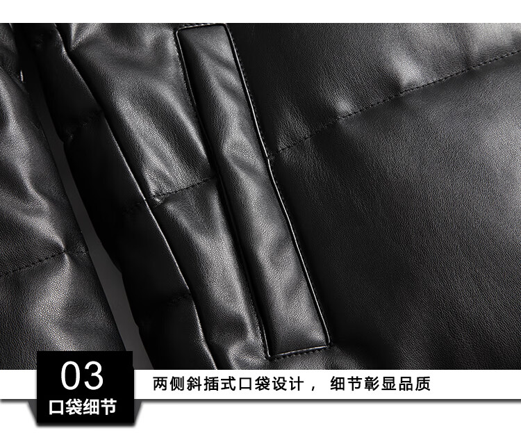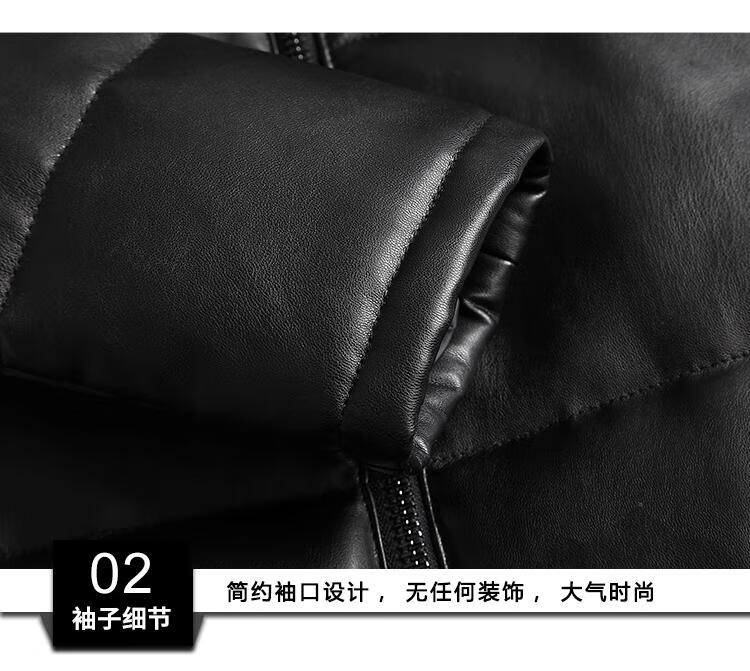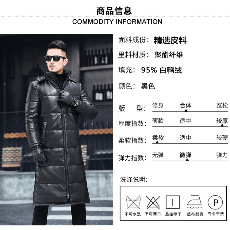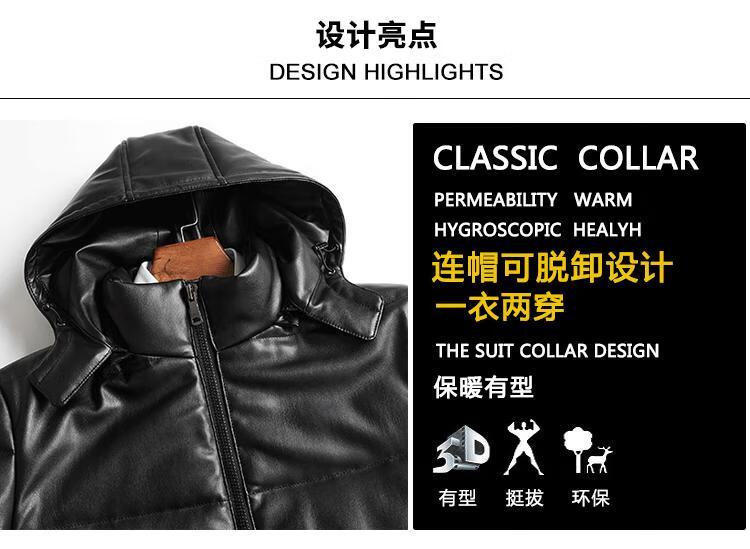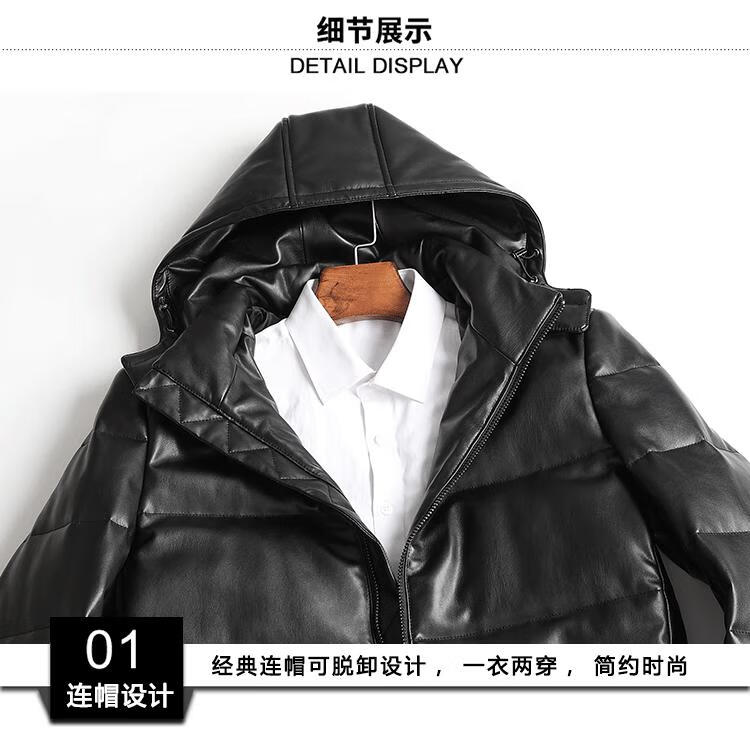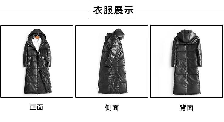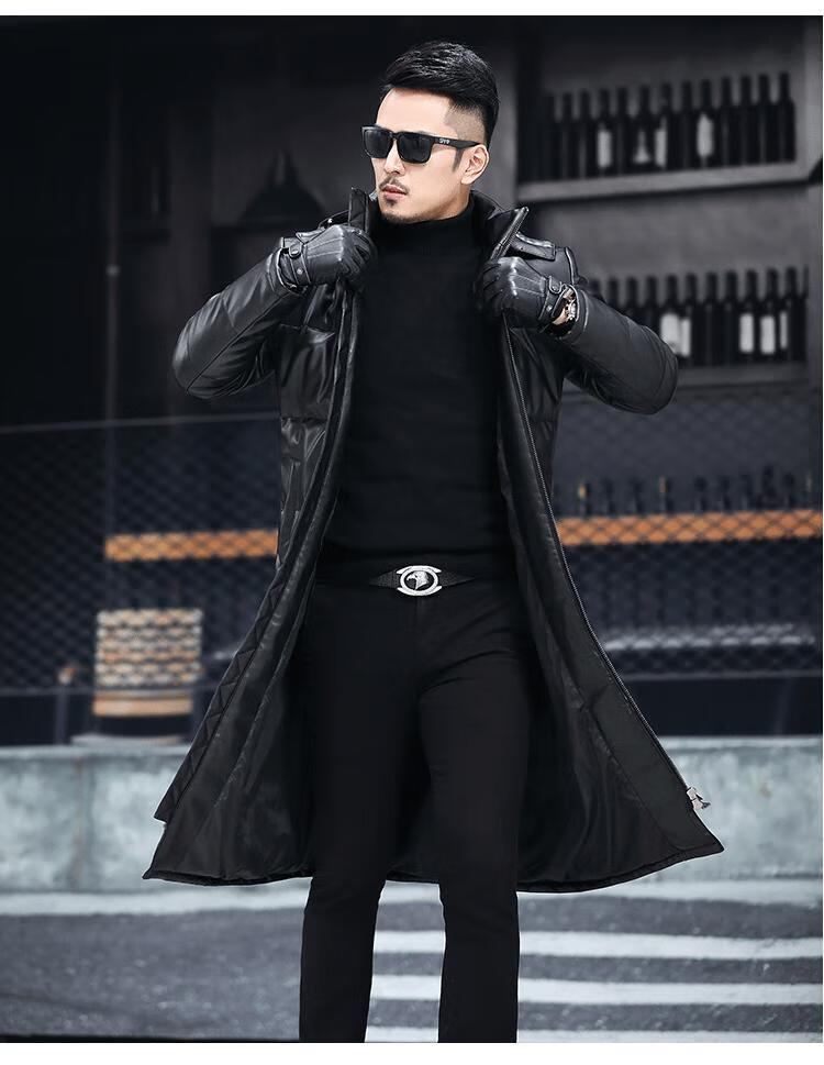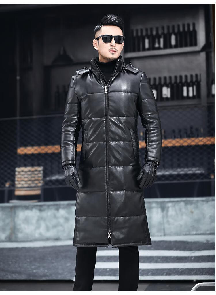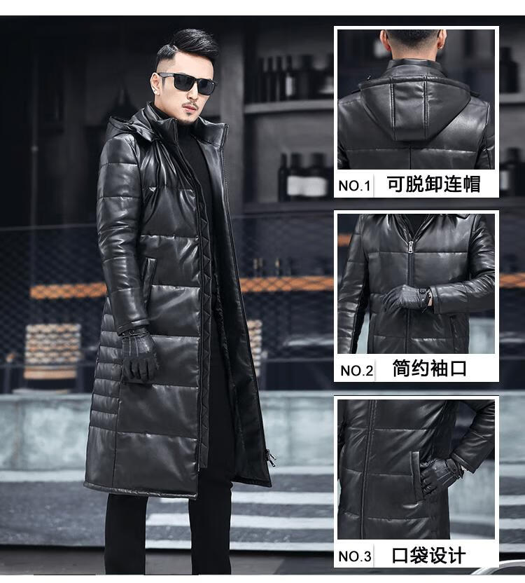 Matchstick's new over-the-knee extra-long leather jacket for men, sheepskin leather jacket, hooded leather windbreaker, thickened and warm men's jacket, trendy black M