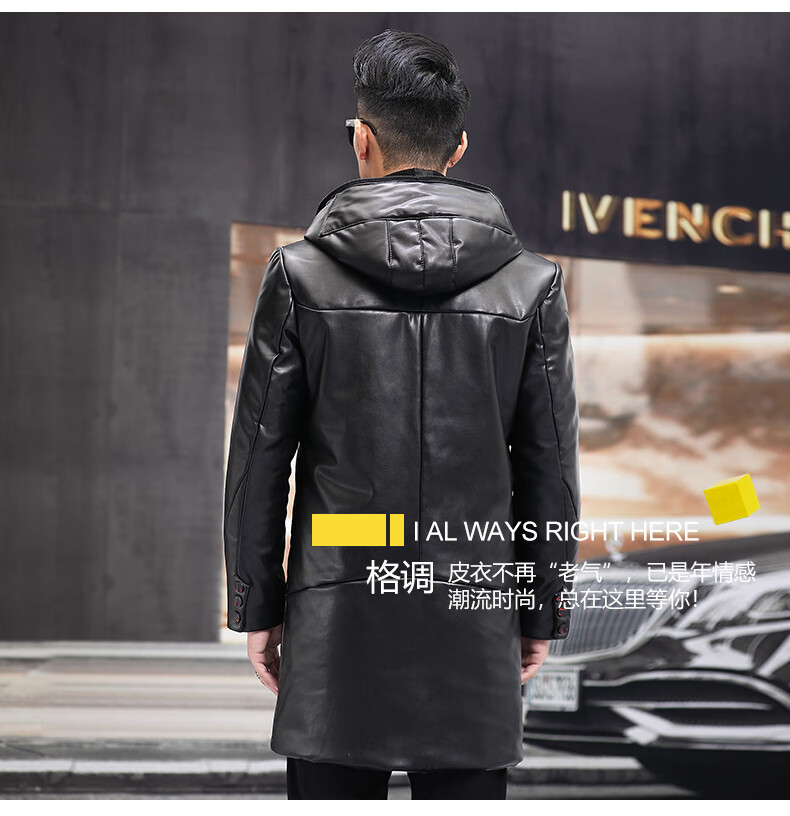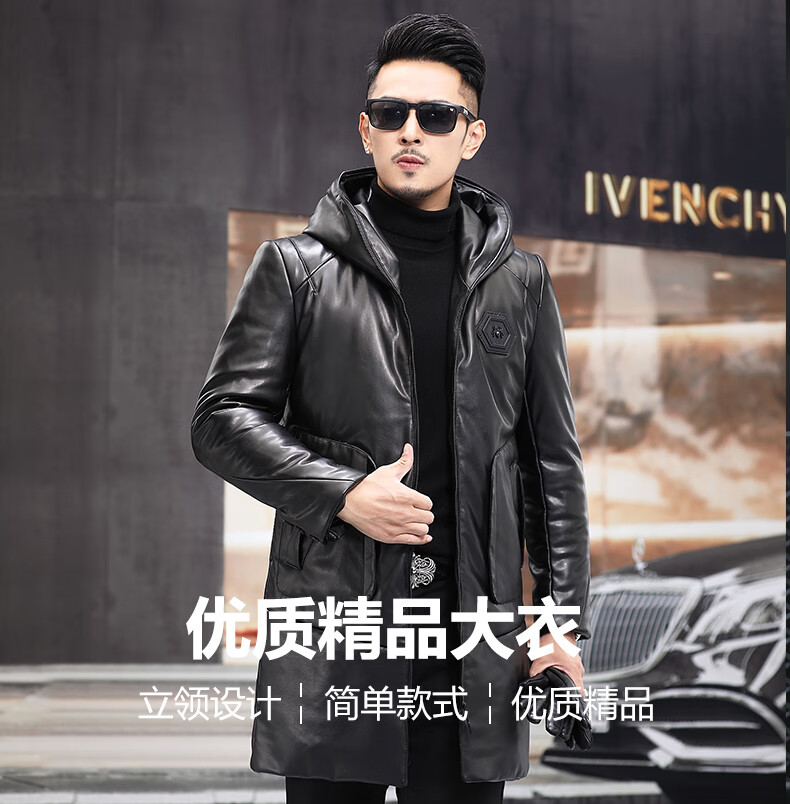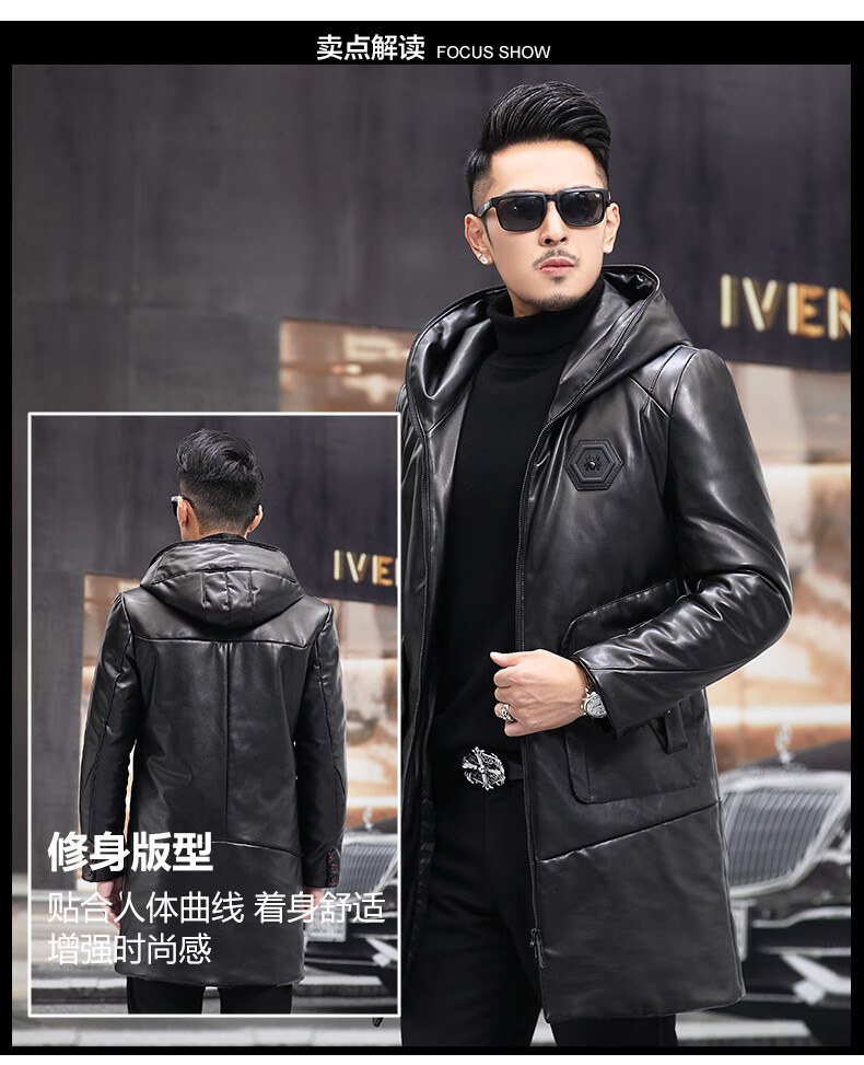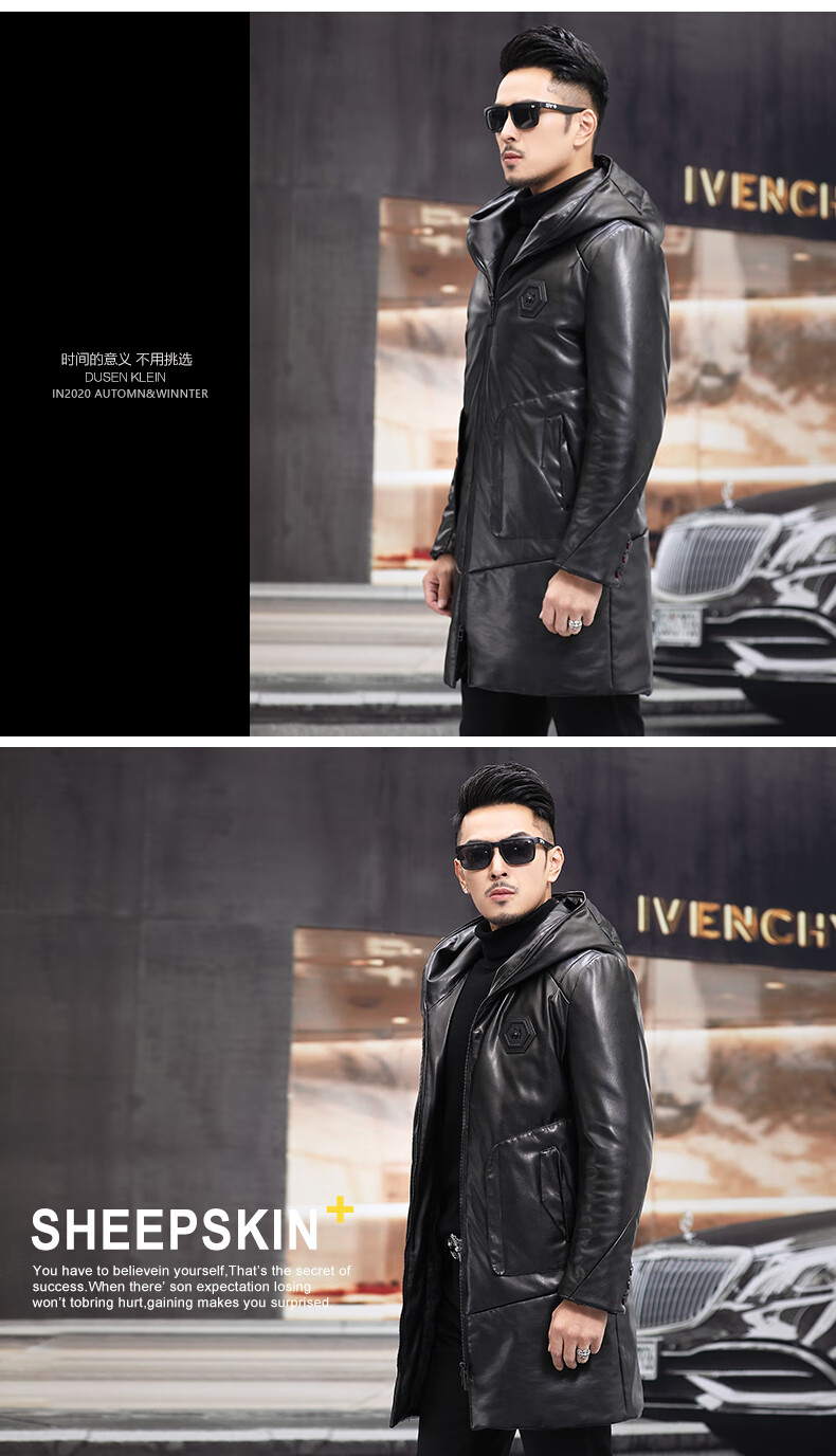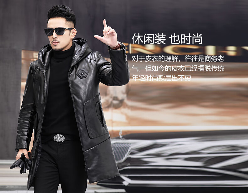 Matchstick Haining Leather Jacket Men's Sheepskin Mid-Length Casual Youth Hooded Leather Jacket Men's Trendy Jacket Winter Black M