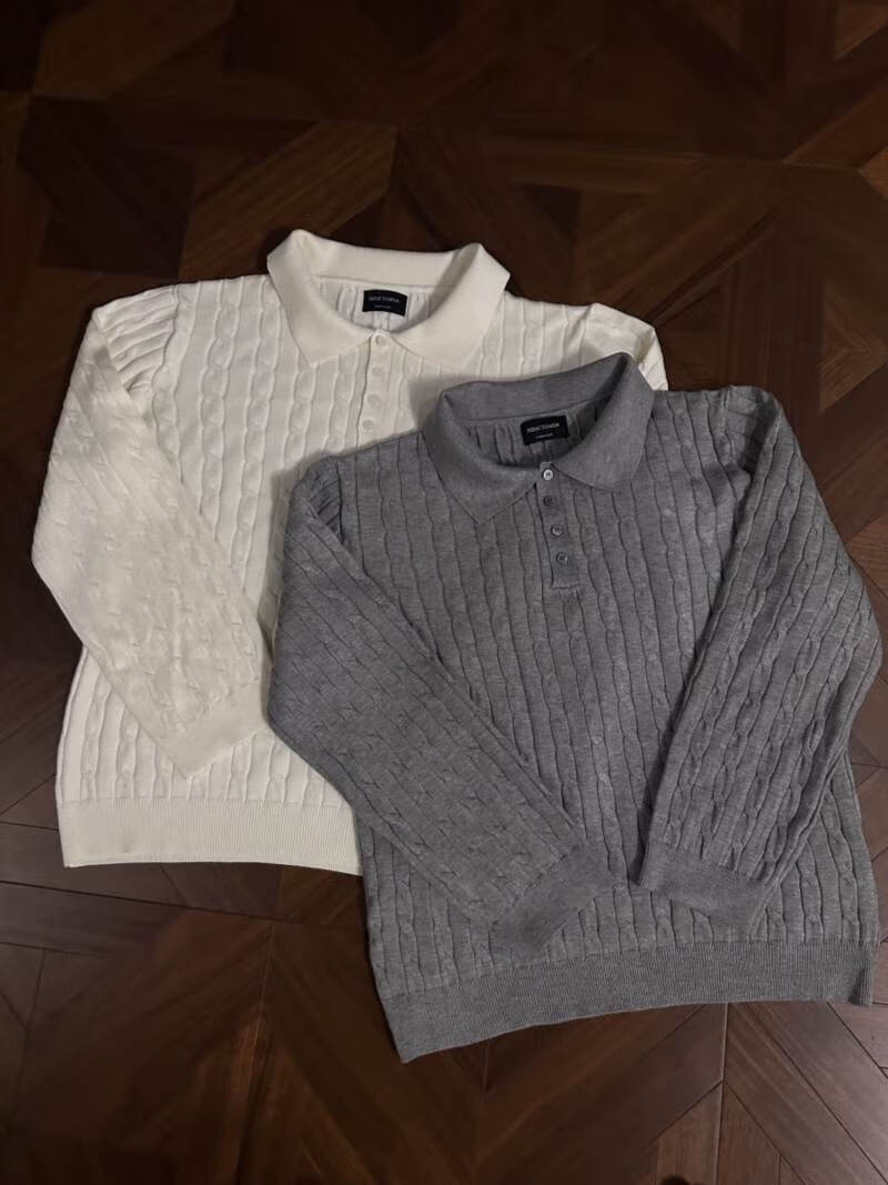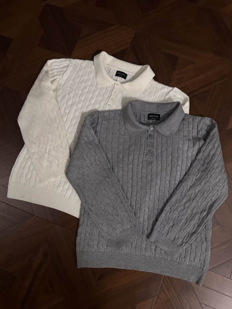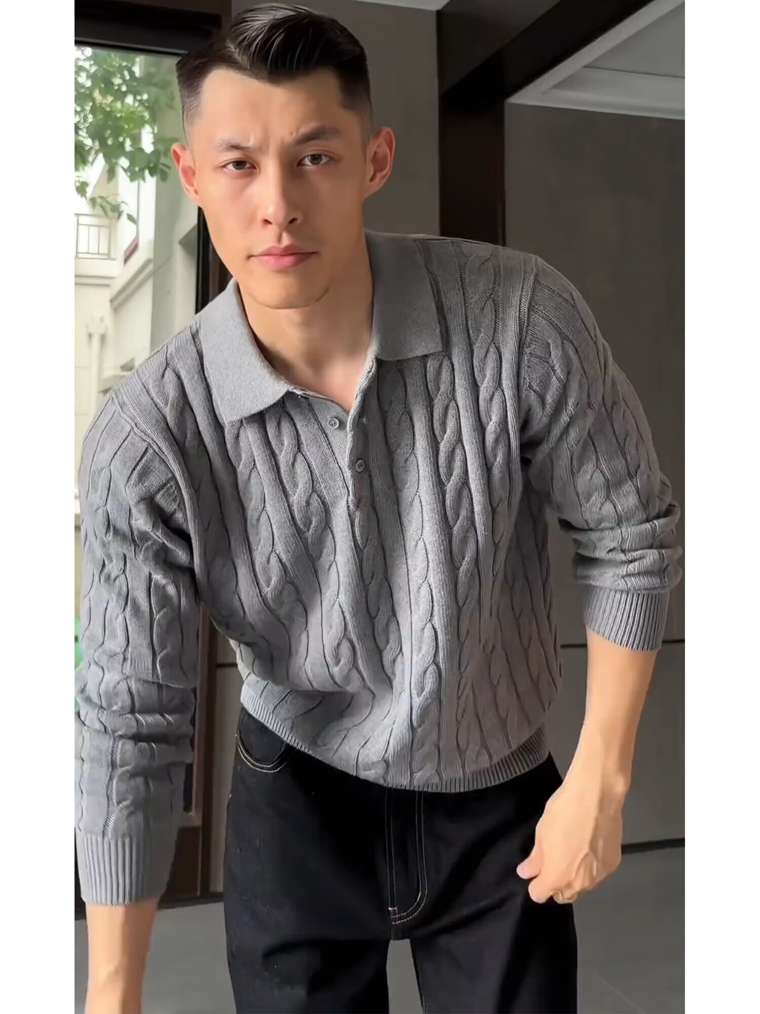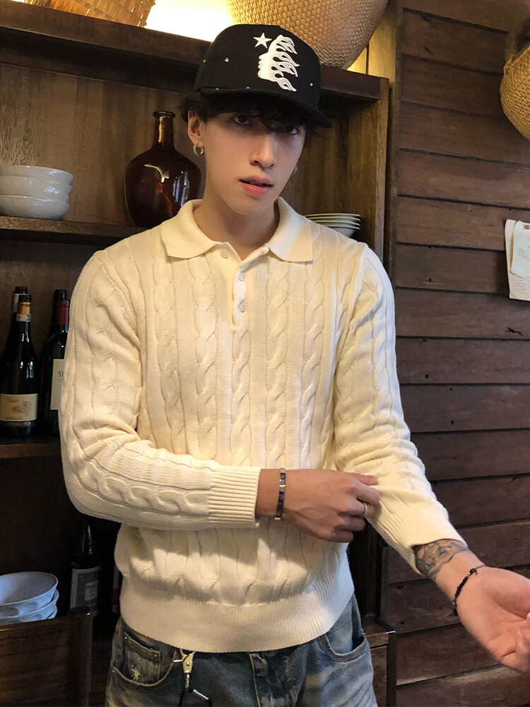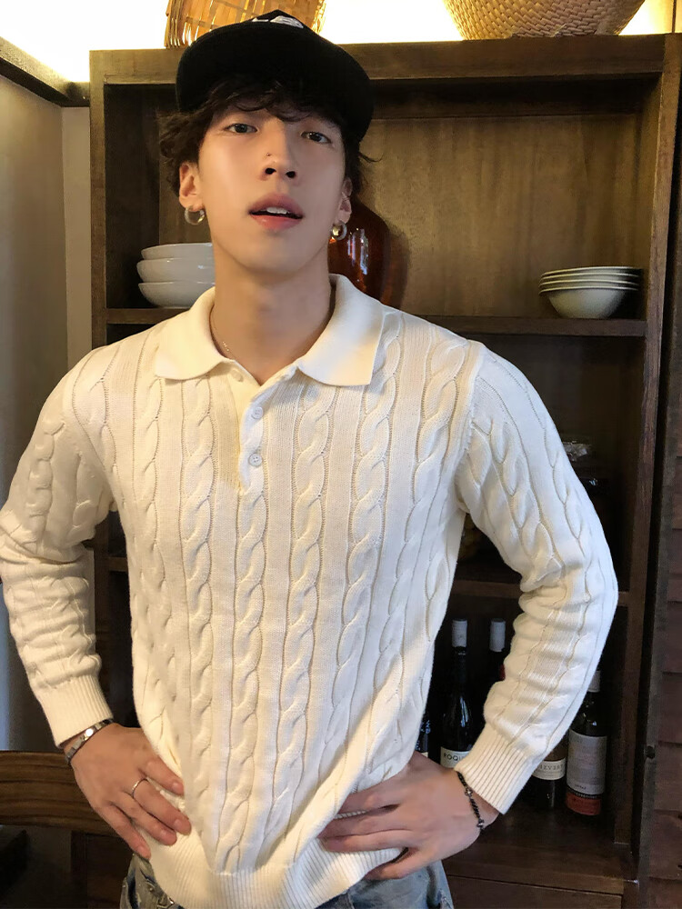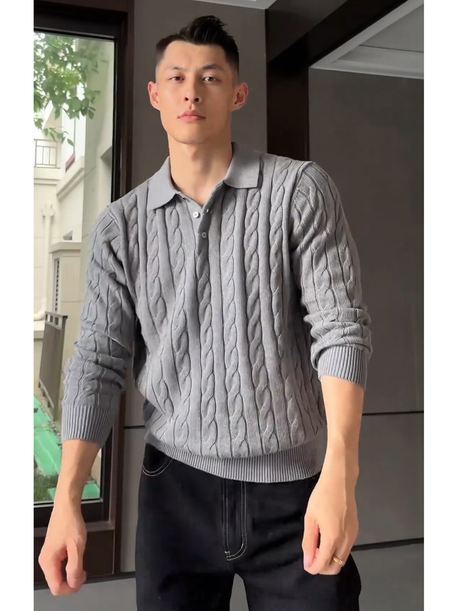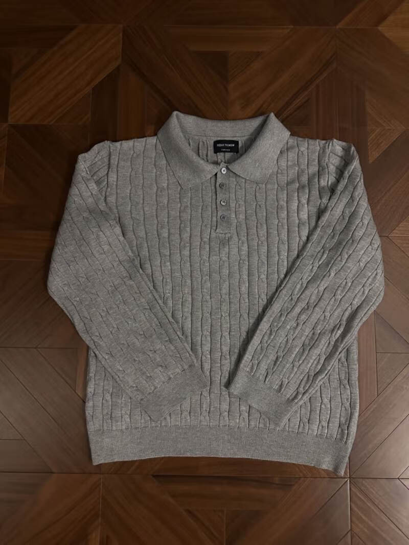 Muwei old money style Henry shoulder sweater men's autumn new retro polo collar cable knit bottoming top shirt gray XL recommended 130-150Jin Jin equals 0.5 kg