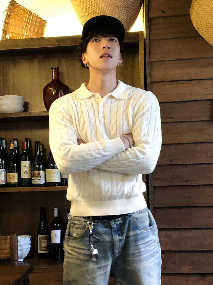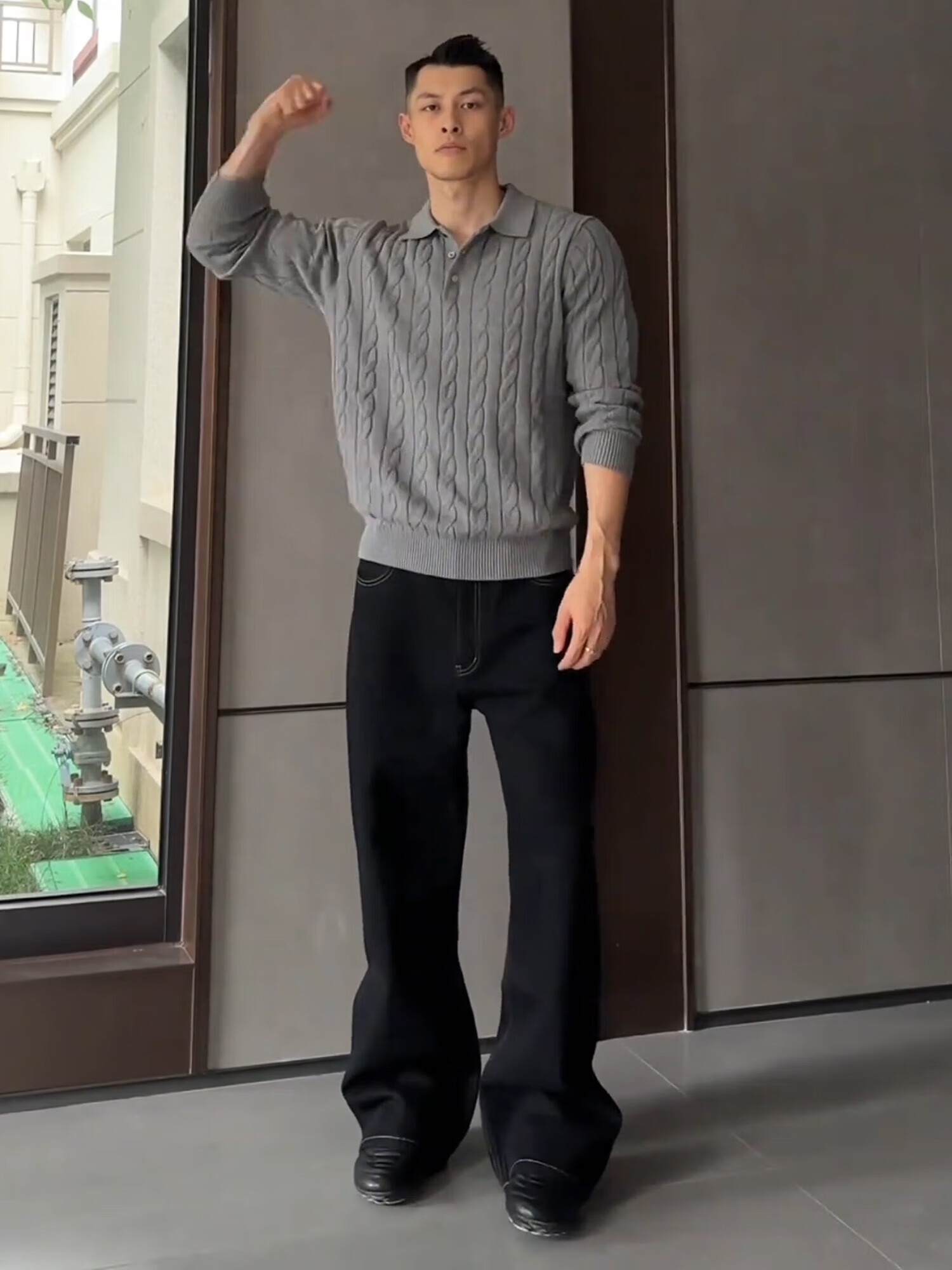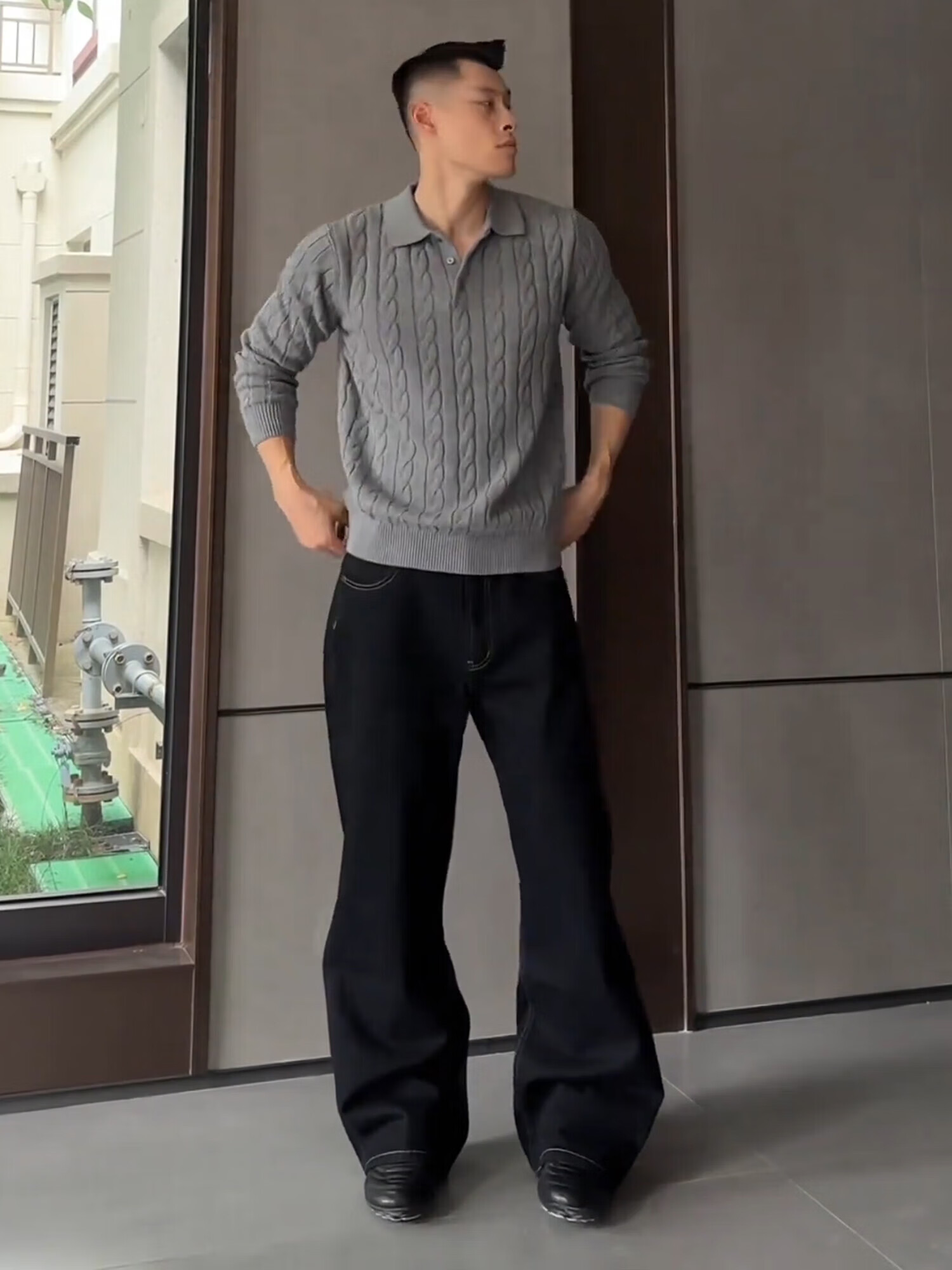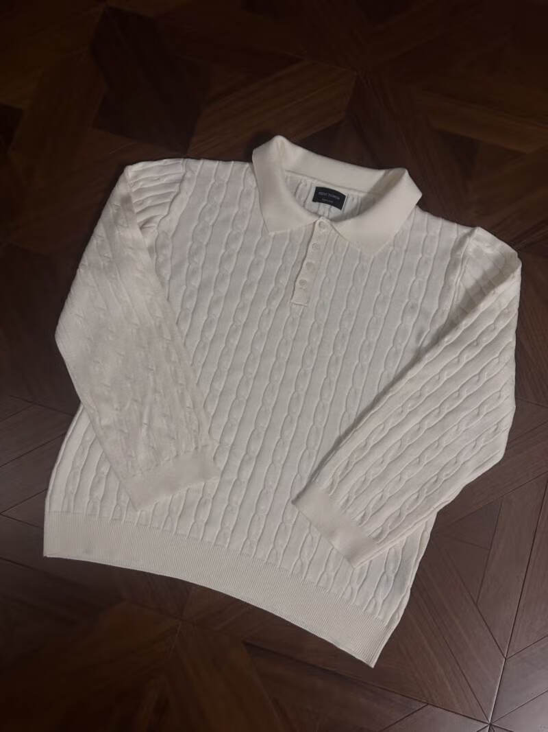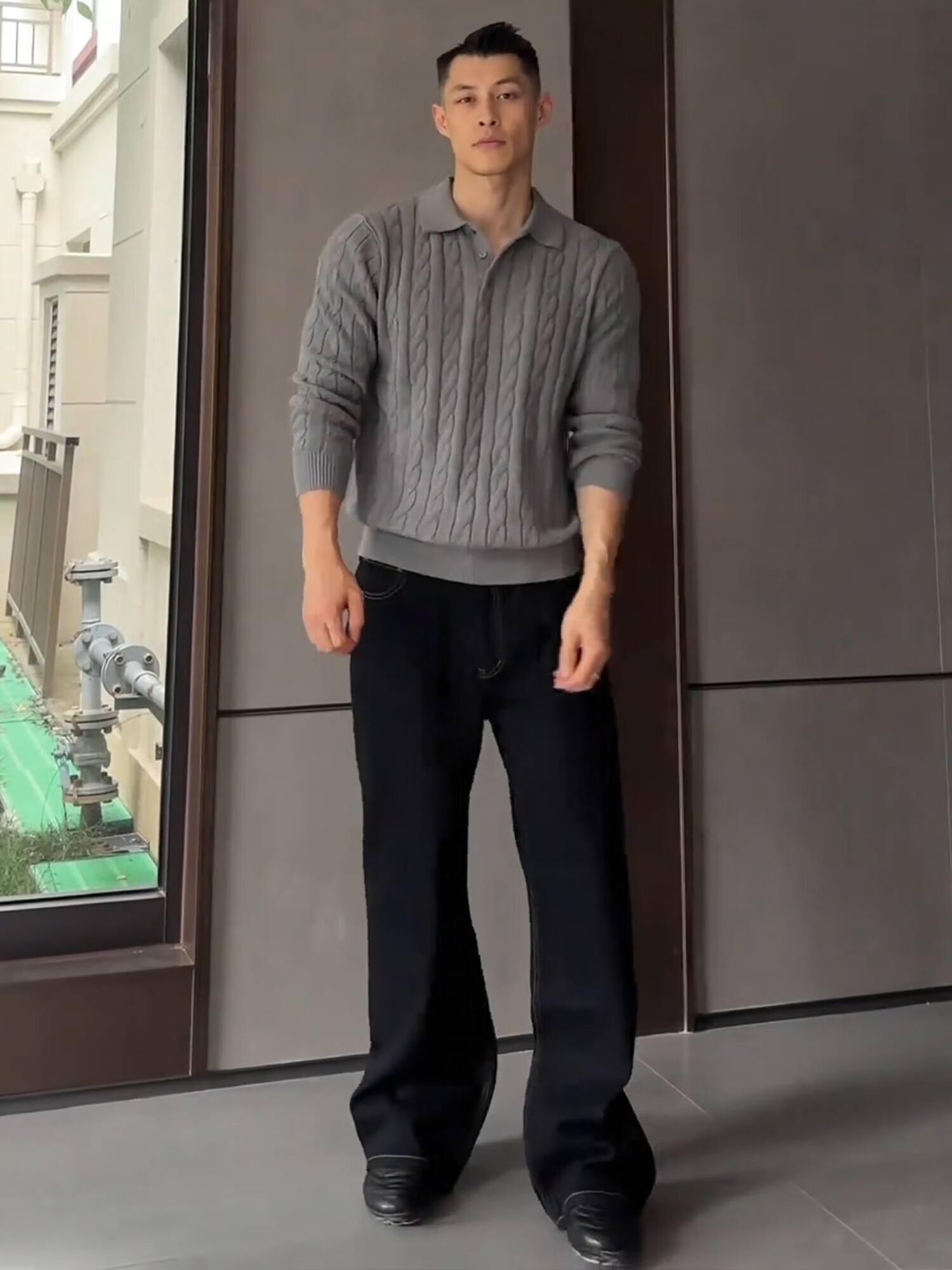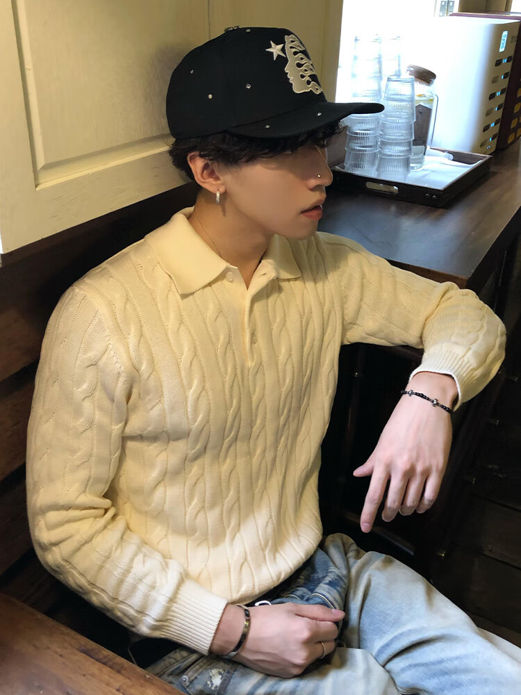 Muwei old money style Henry shoulder sweater men's autumn new retro polo collar cable knit bottoming top shirt gray XL recommended 130-150Jin Jin equals 0.5 kg