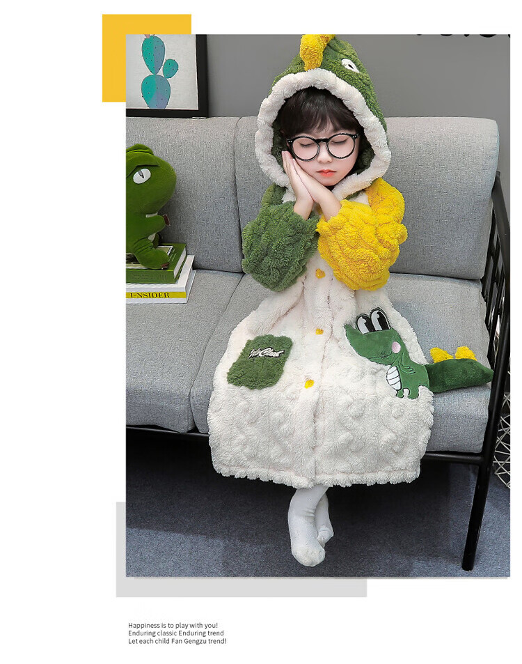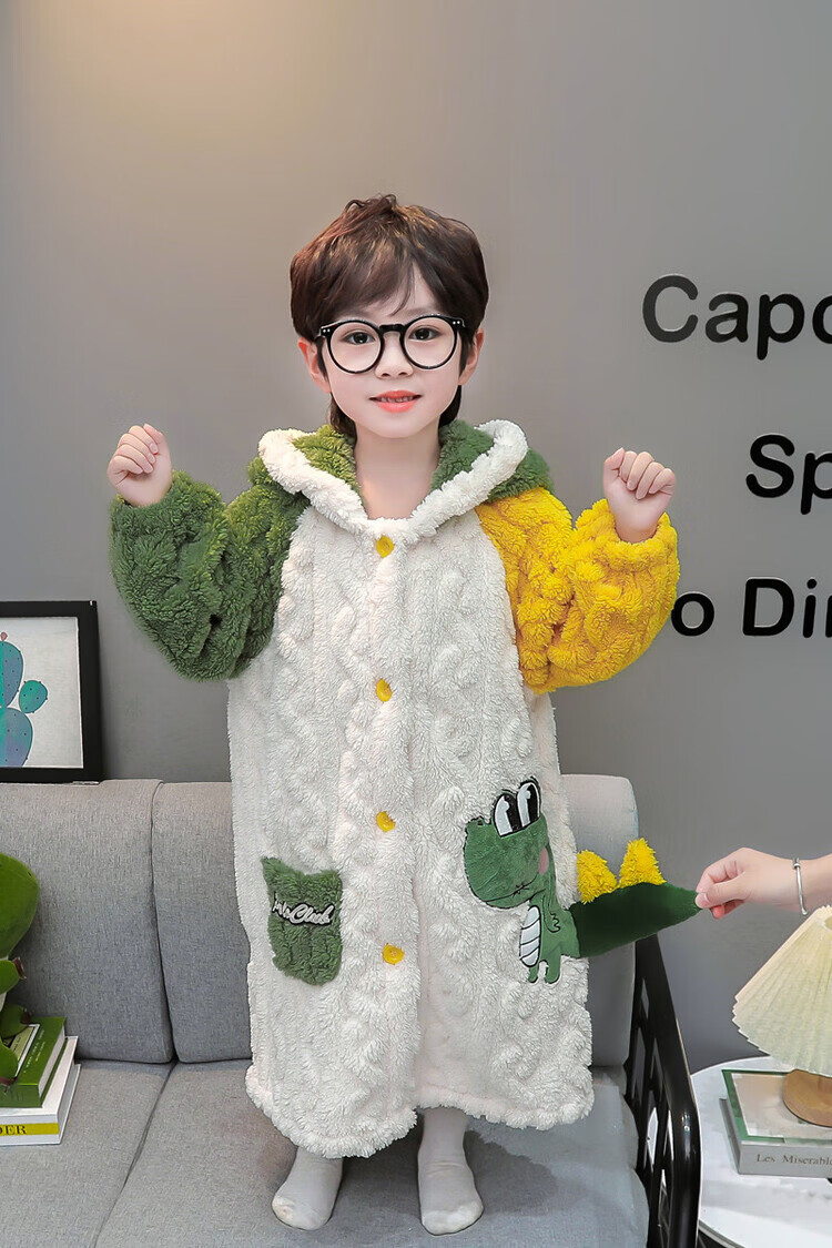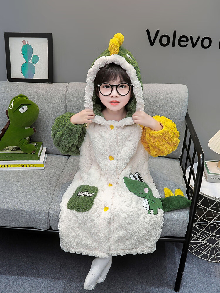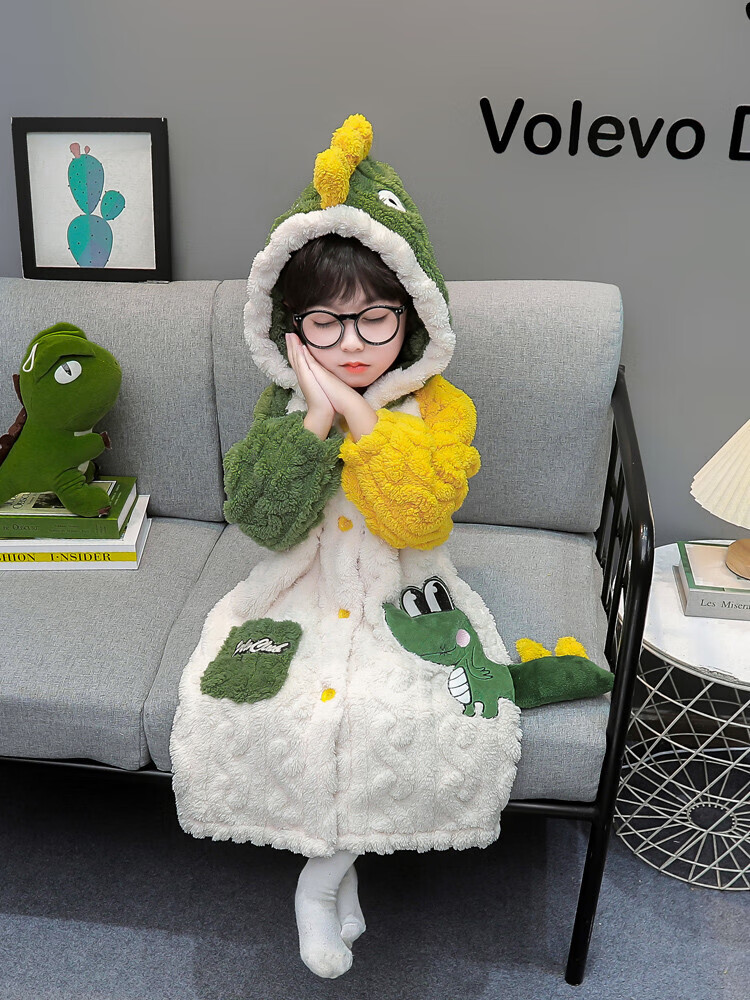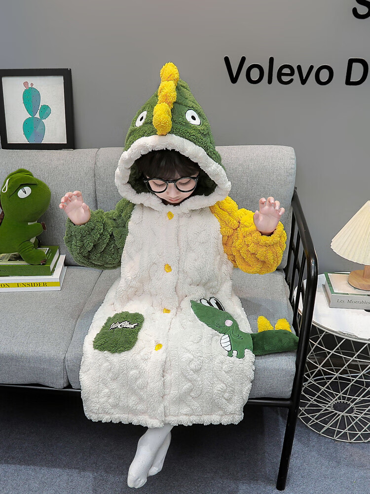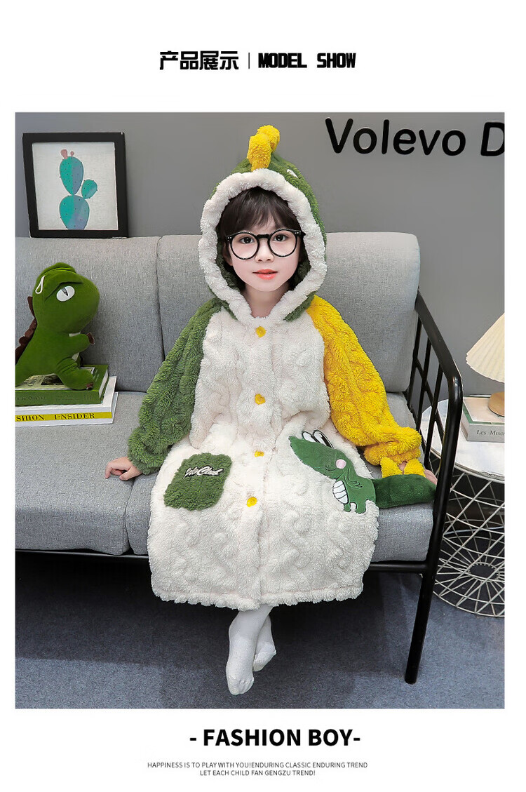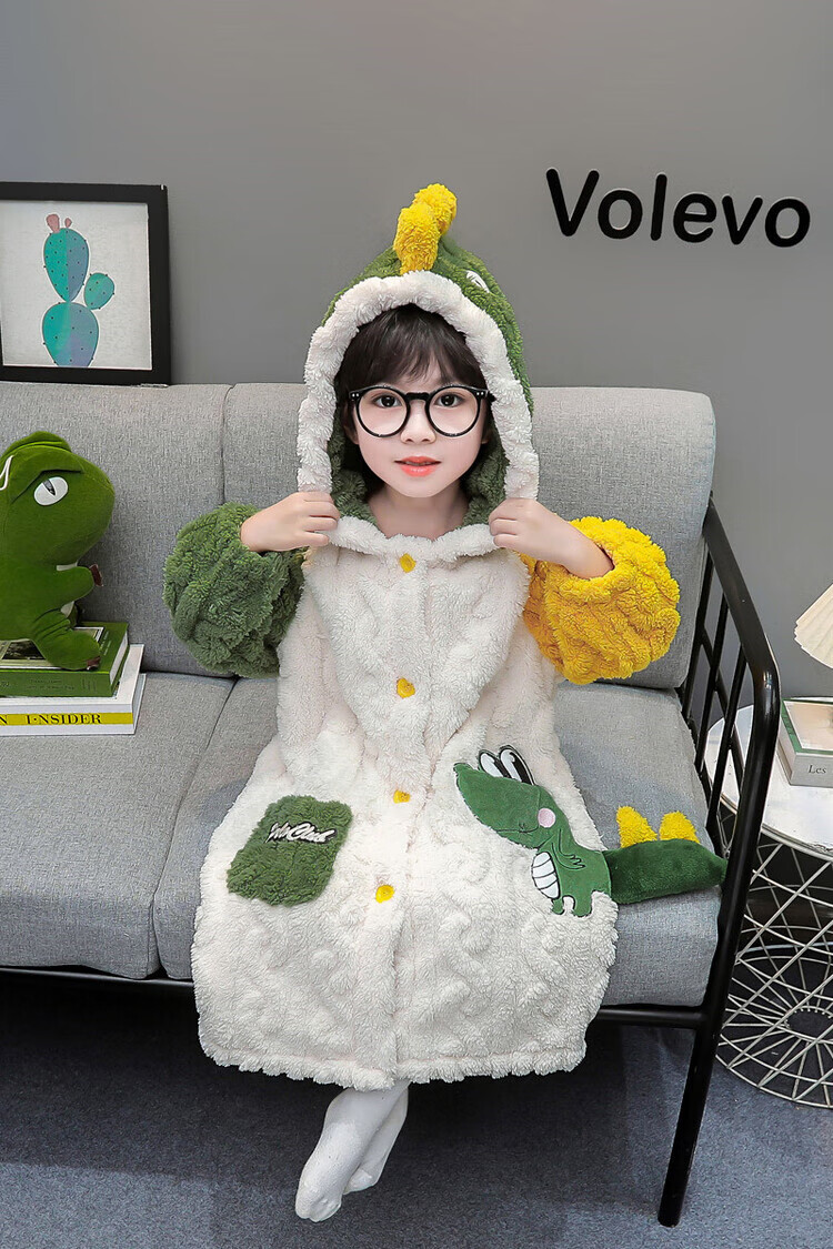 G.DUCKKIDS children's pajamas boys' winter flannel pajamas baby long hooded anti-cold bathrobe dinosaur home bathrobe beige 90 cm