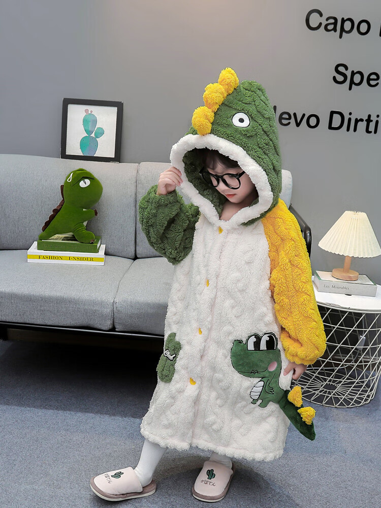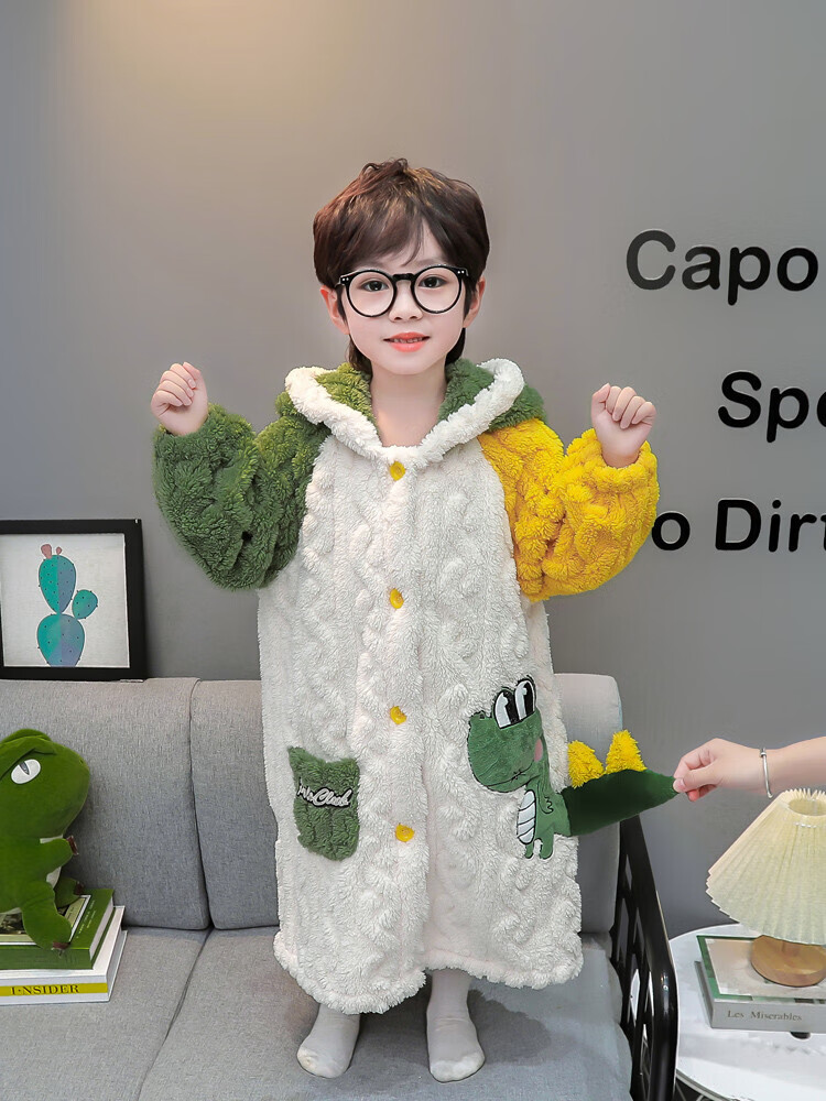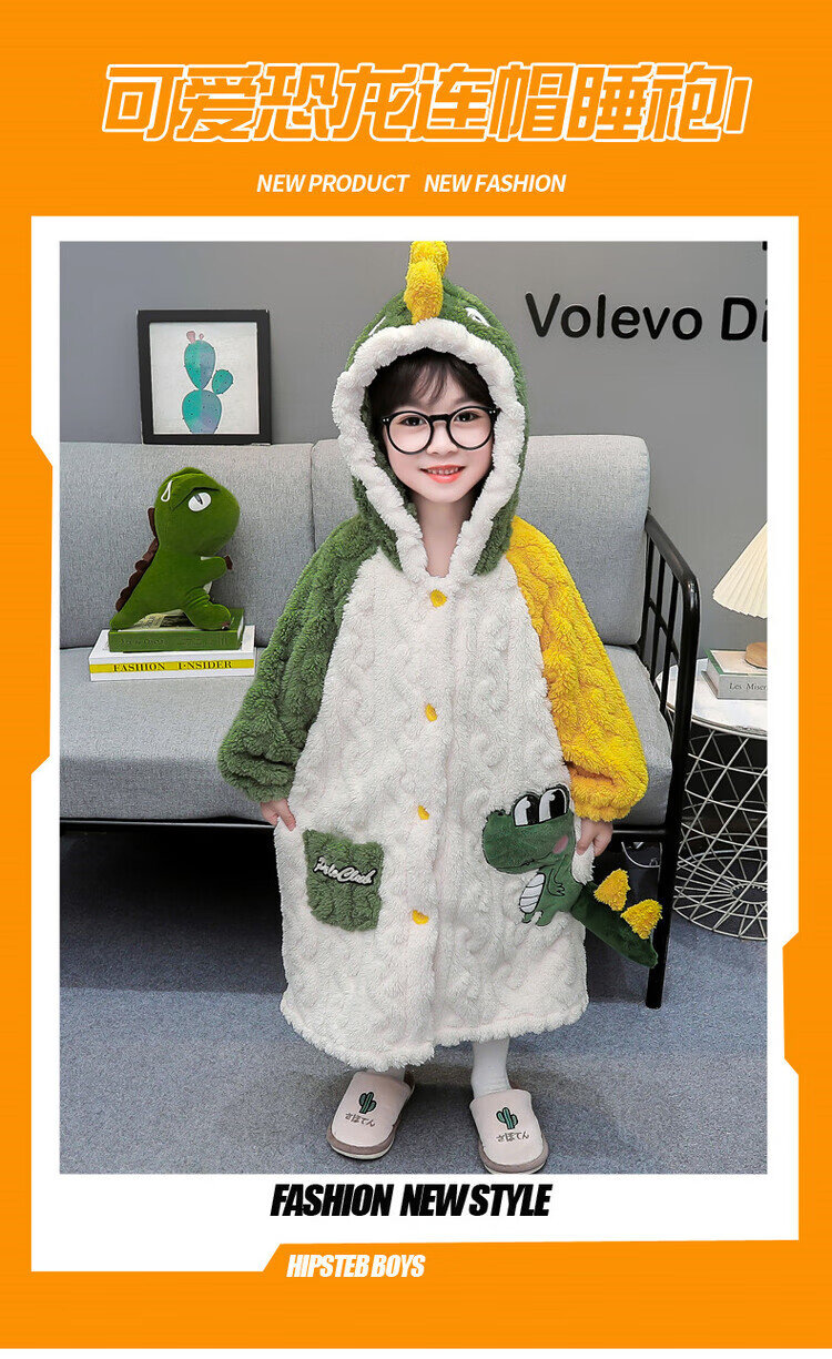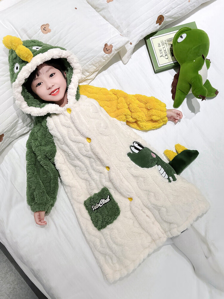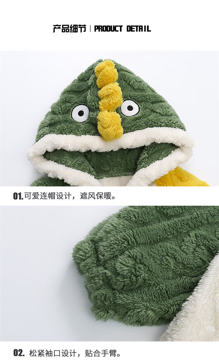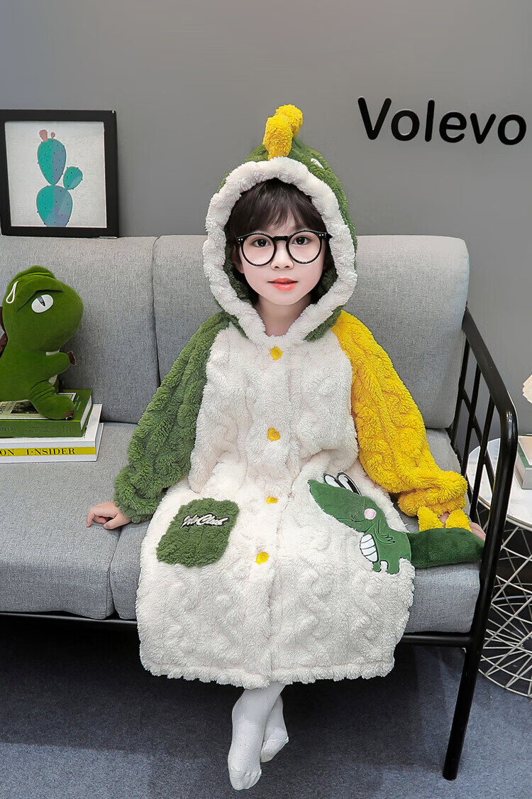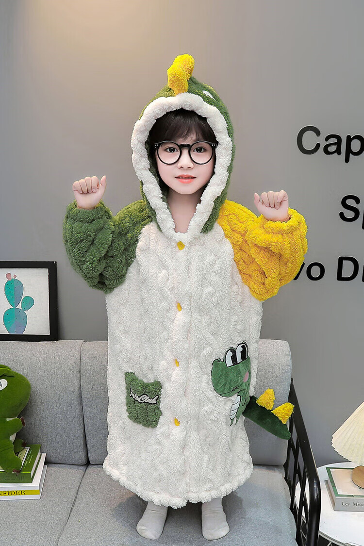 G.DUCKKIDS children's pajamas boys' winter flannel pajamas baby long hooded anti-cold bathrobe dinosaur home bathrobe beige 90 cm
