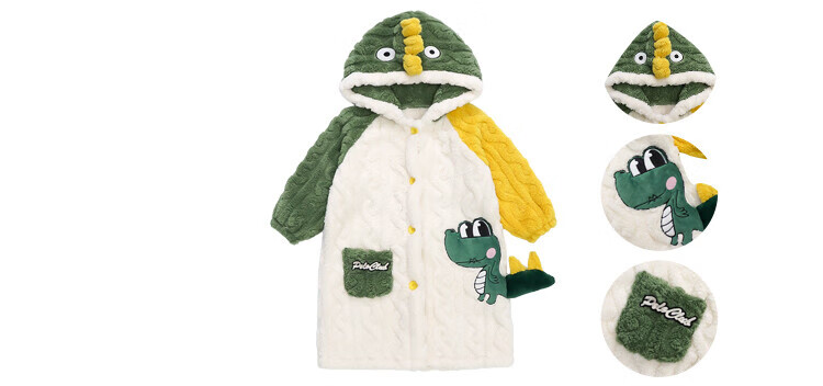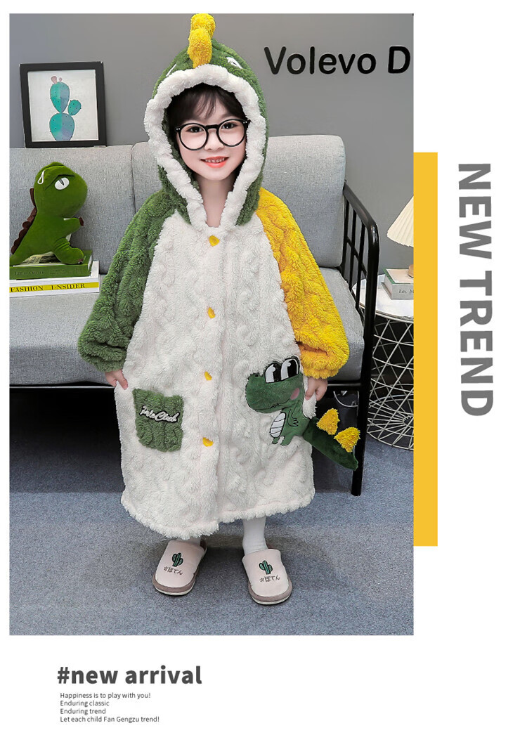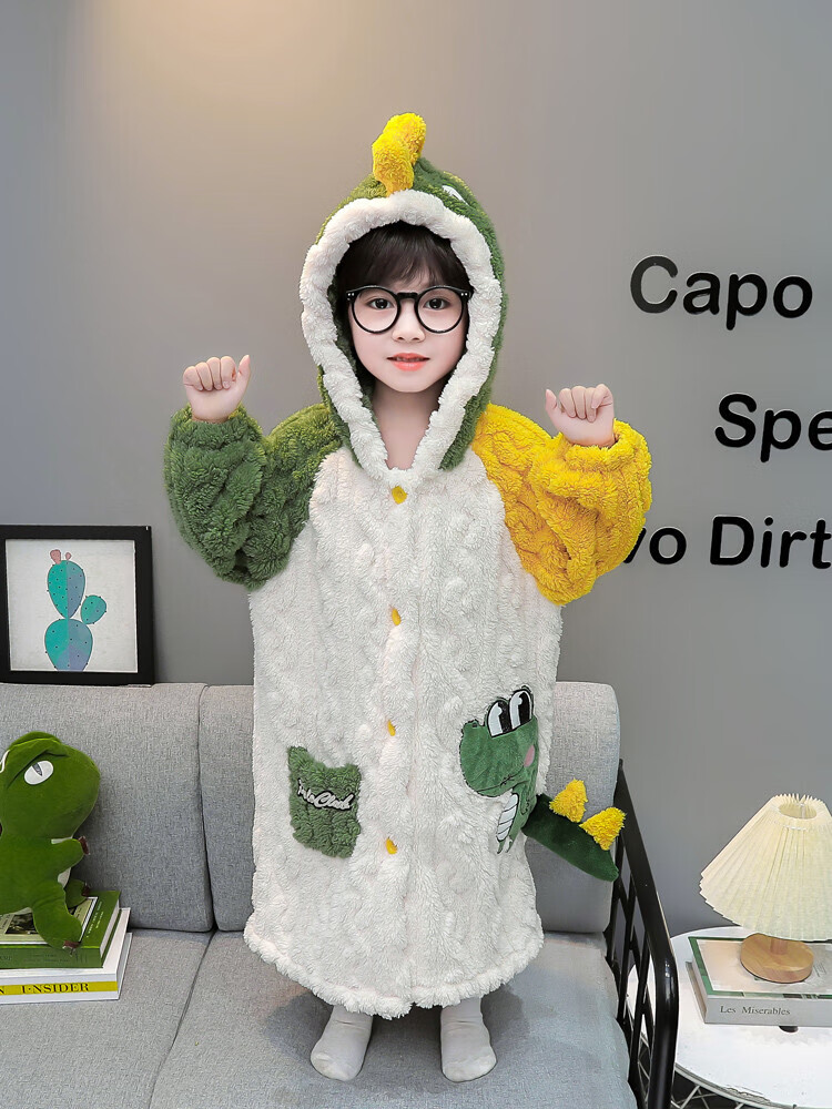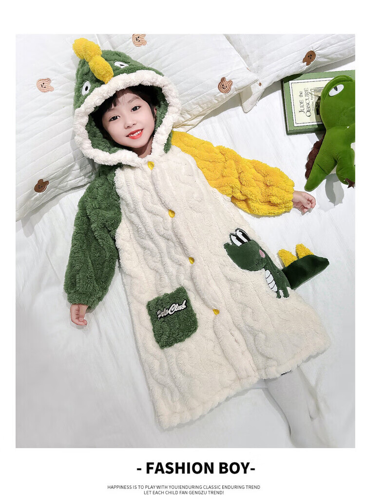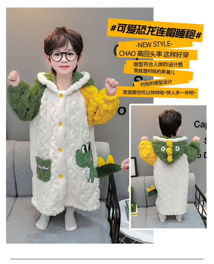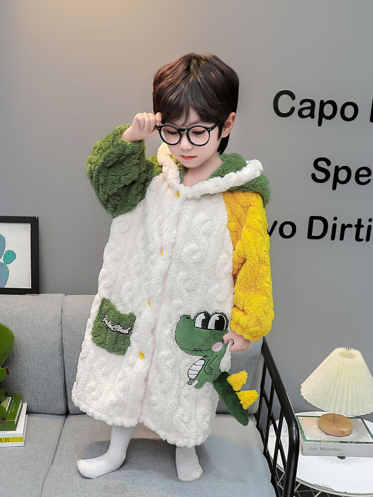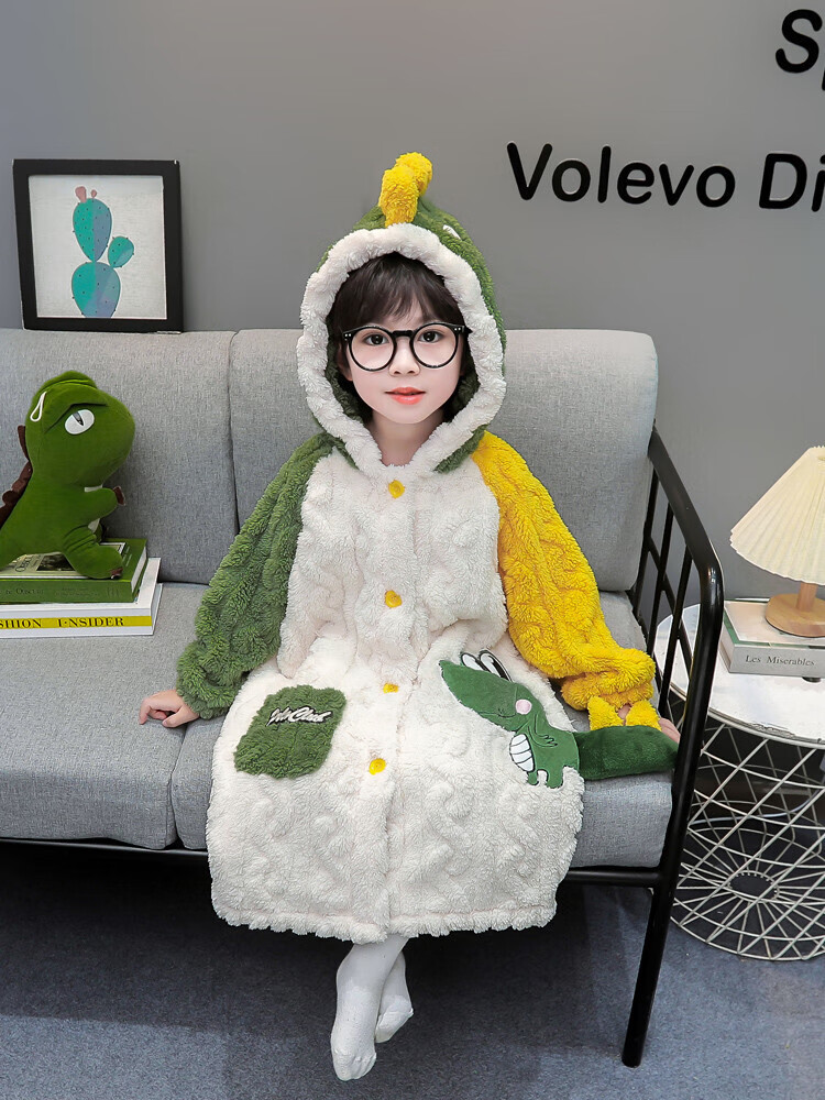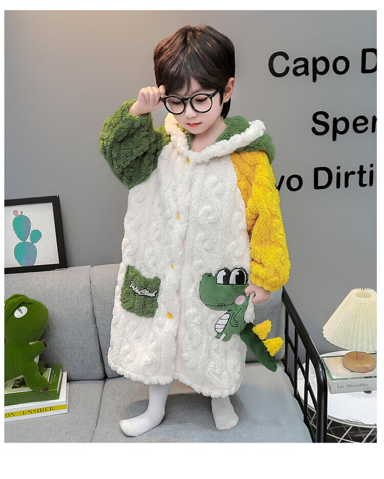 G.DUCKKIDS children's pajamas boys' winter flannel pajamas baby long hooded anti-cold bathrobe dinosaur home bathrobe beige 90 cm