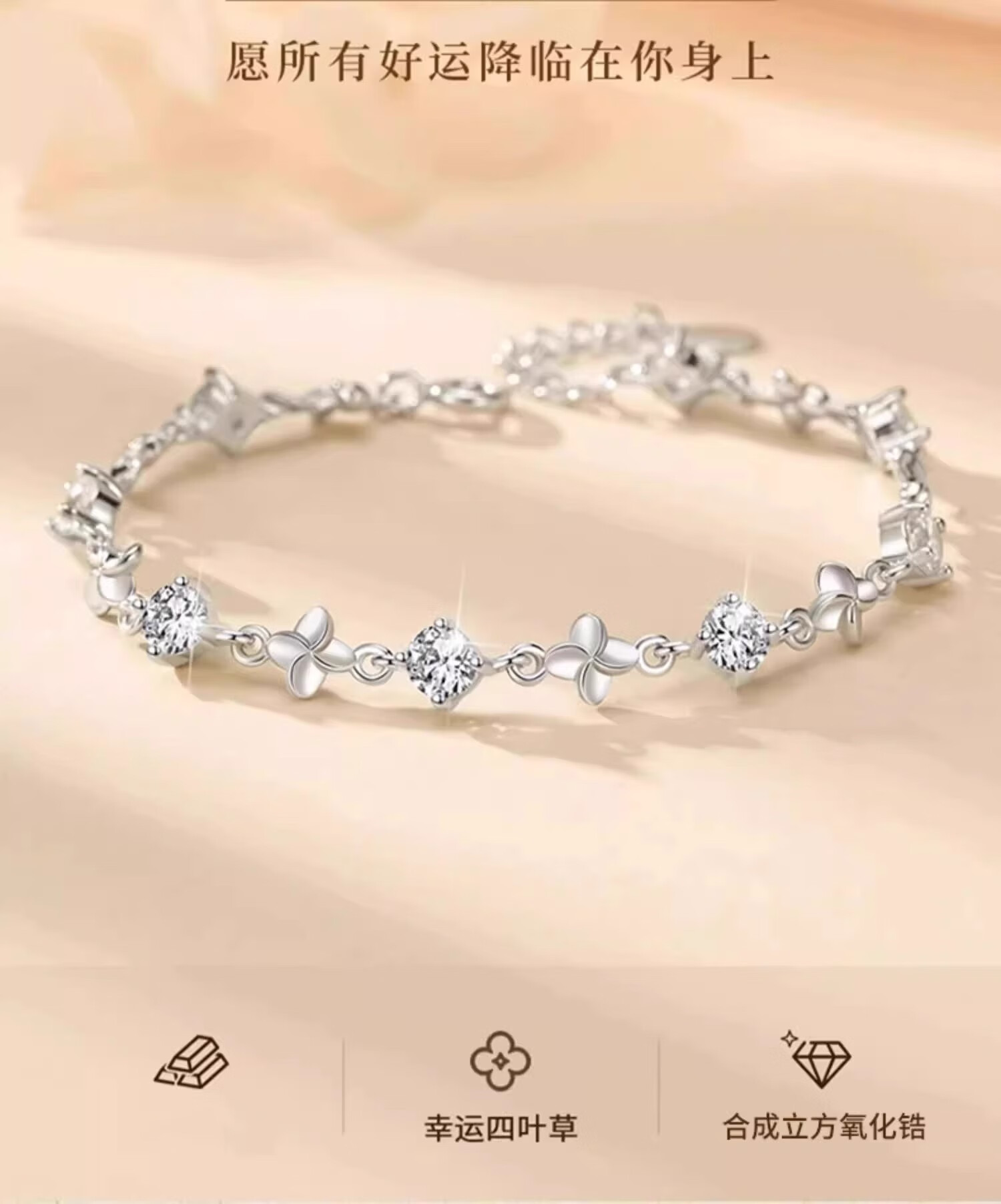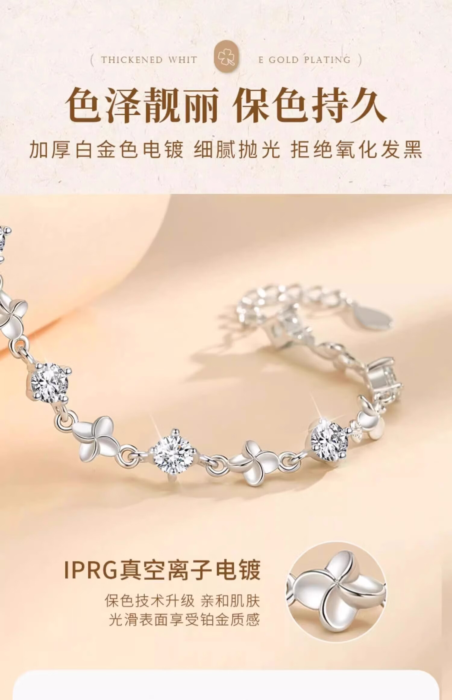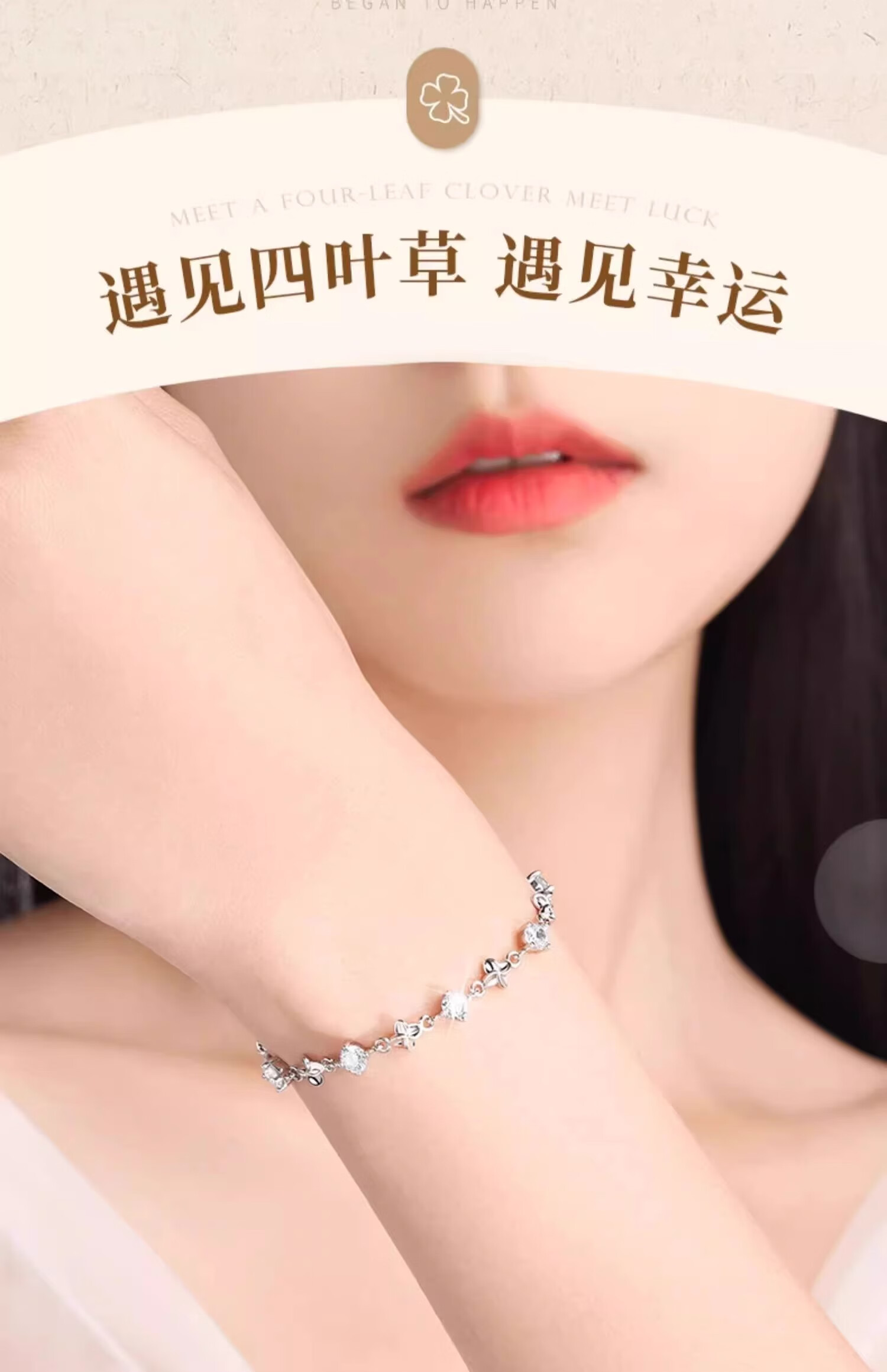 Four-leaf clover bracelet for women, light luxury niche birthday, Chinese Valentine's Day gift for girlfriend, sterling silver, platinum plated pt950, light luxury model - four-leaf clover bracelet, white diamond + rose gift box