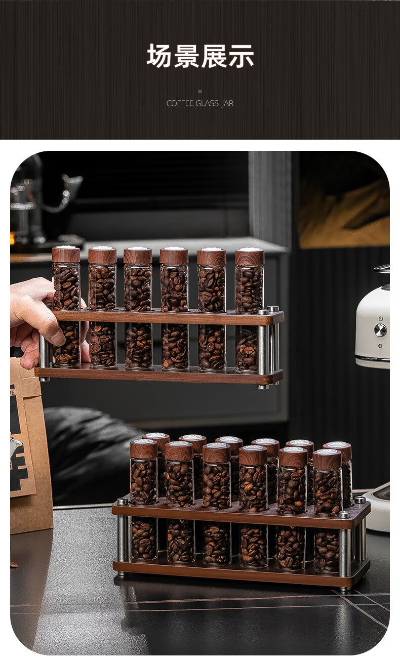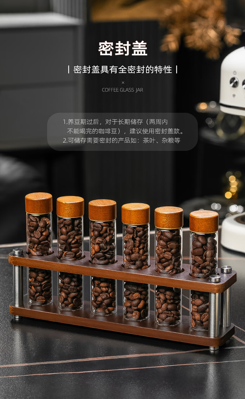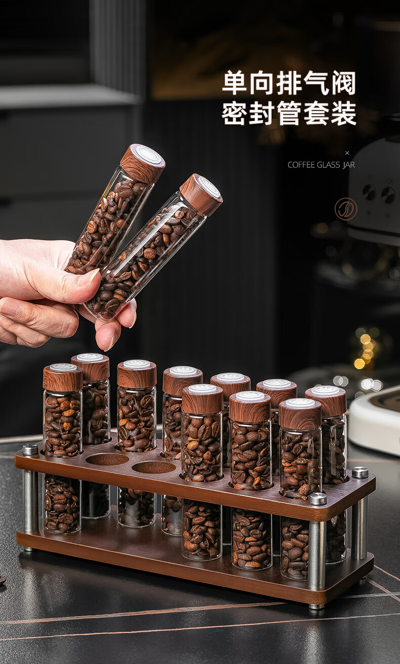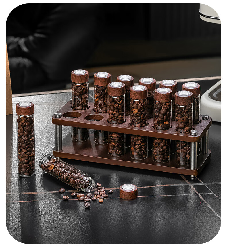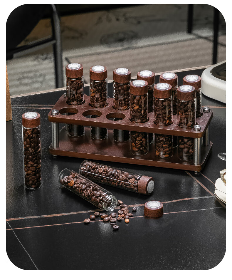 CRISTALGLASS Coffee Bean Dispensing Test Tube Sealed Bottle Single Dispensing Bottle Sealed Storage Can Coffee Can Display Rack Smell Bottle Automatic Venting Cap Bottle 6 Pack + Storage Rack