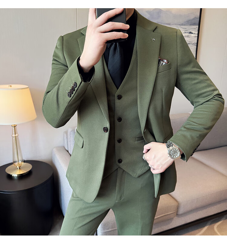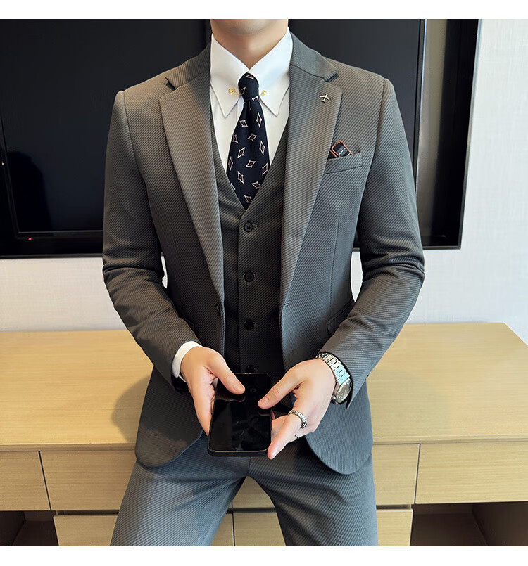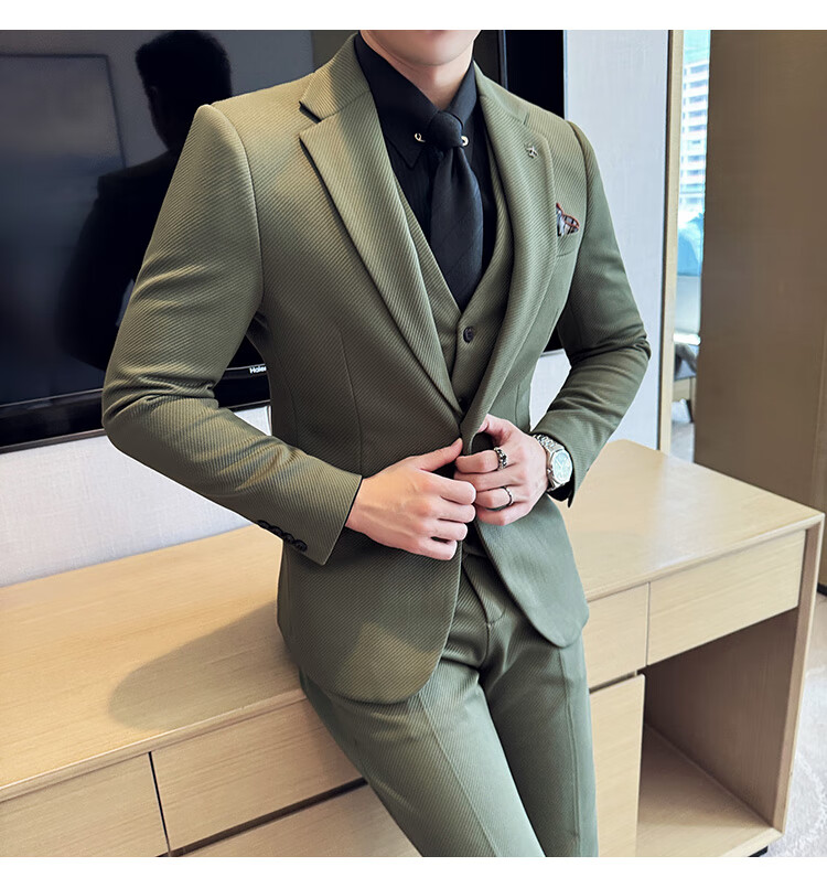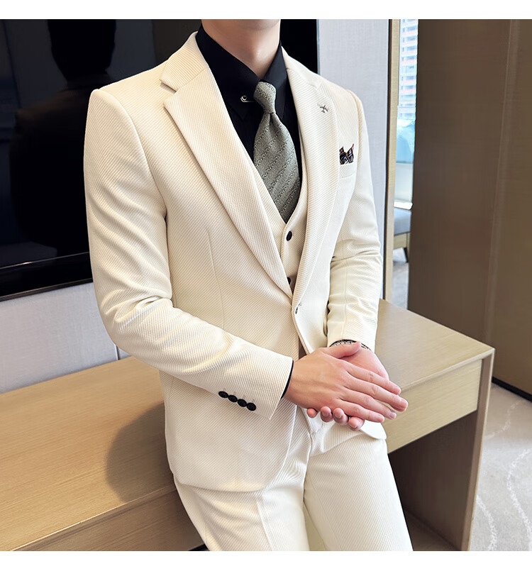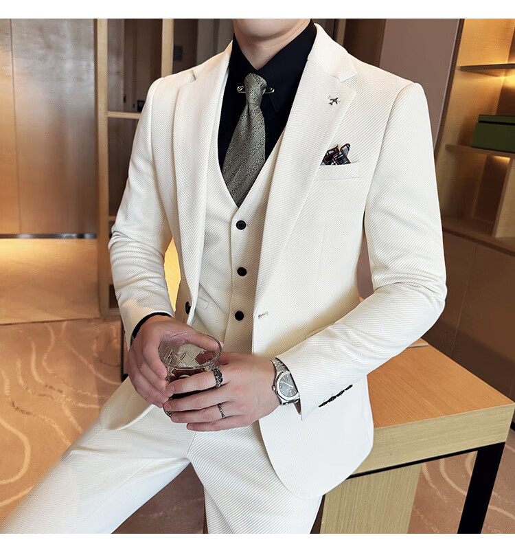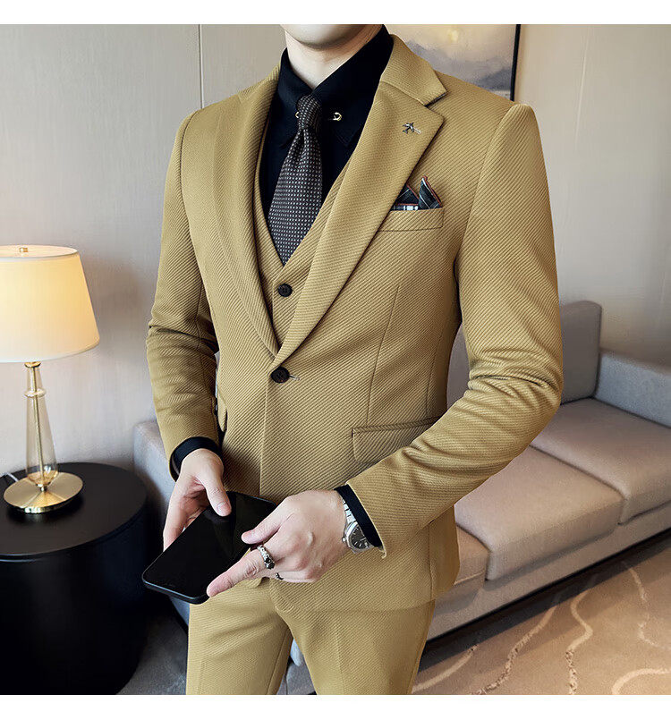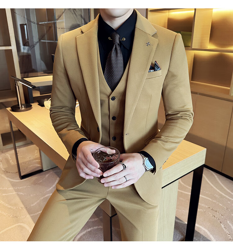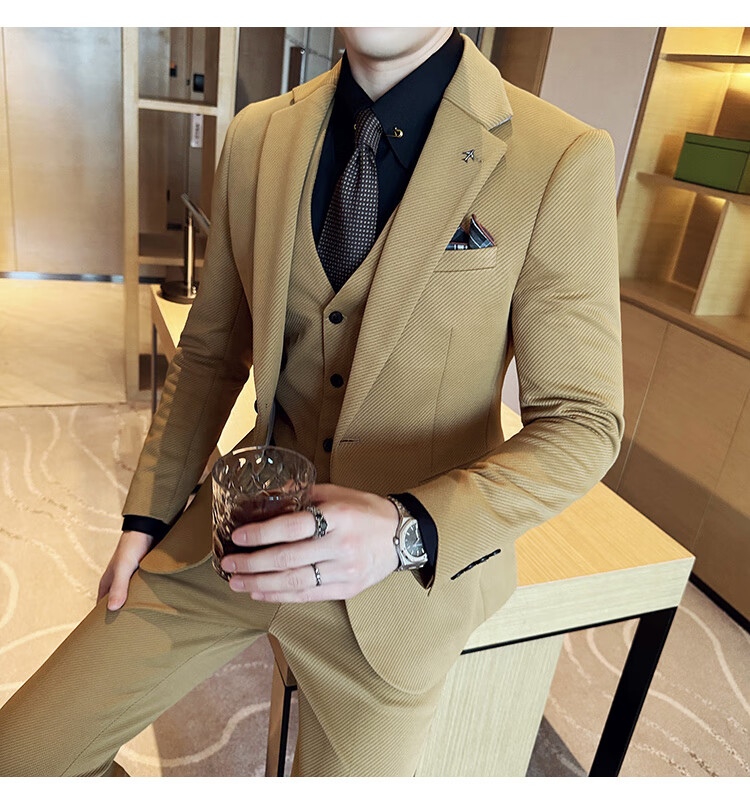 Pierre Cardin Suit Suit Men's Korean Style 2025 New Slim Fashion Brand Business Casual High-End Wedding Suit Three-piece Men's Khaki Suit + Vest + Pants XL