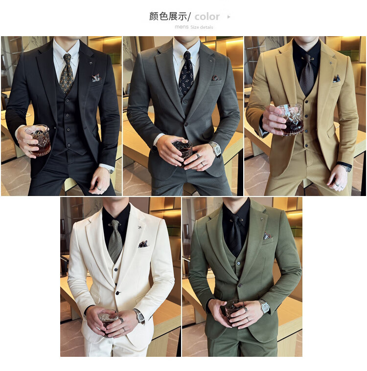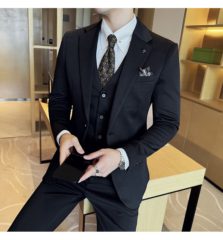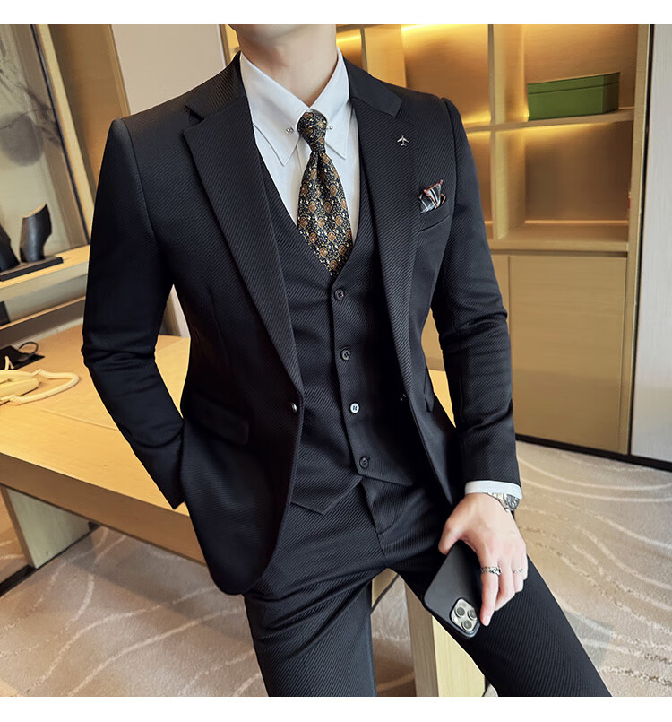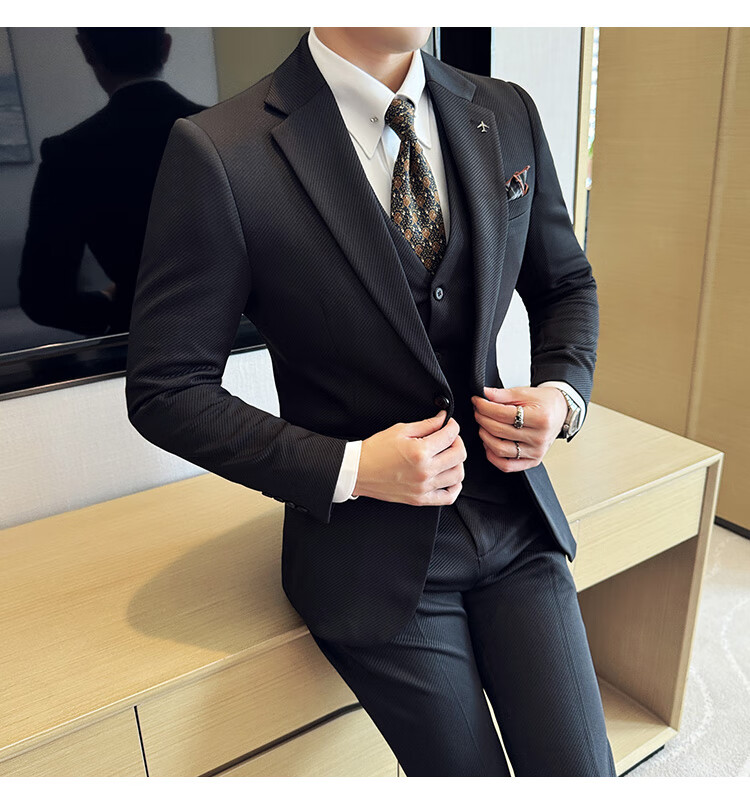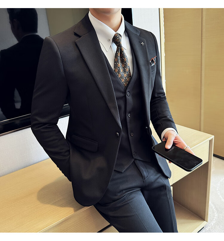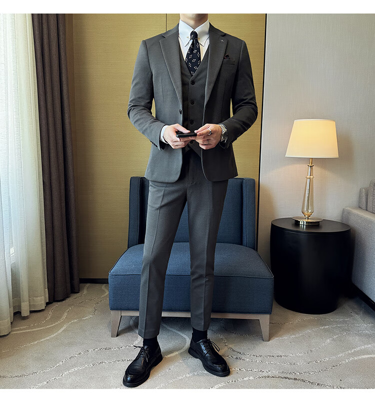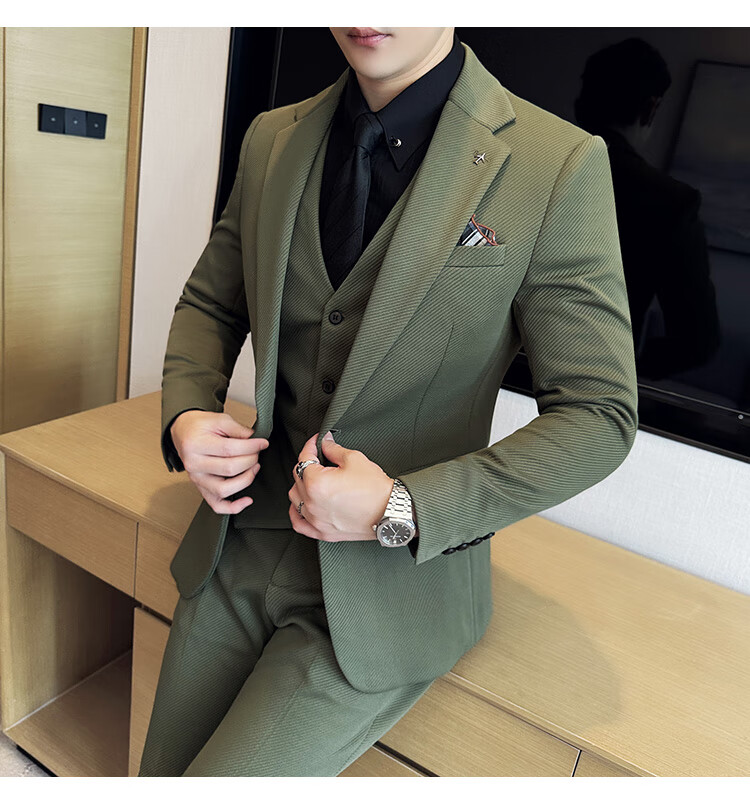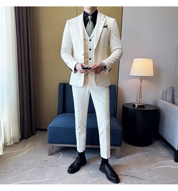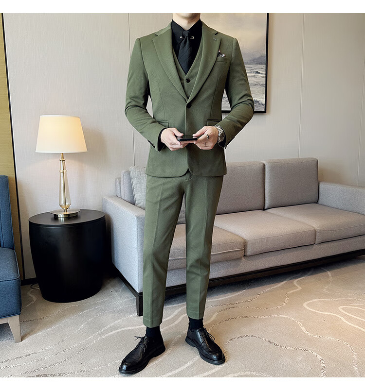 Pierre Cardin Suit Suit Men's Korean Style 2025 New Slim Fashion Brand Business Casual High-End Wedding Suit Three-piece Men's Khaki Suit + Vest + Pants XL