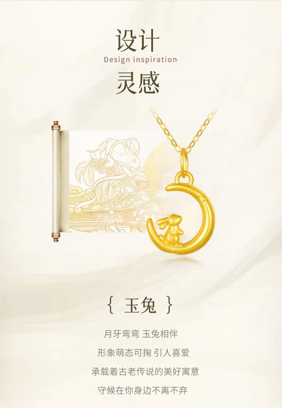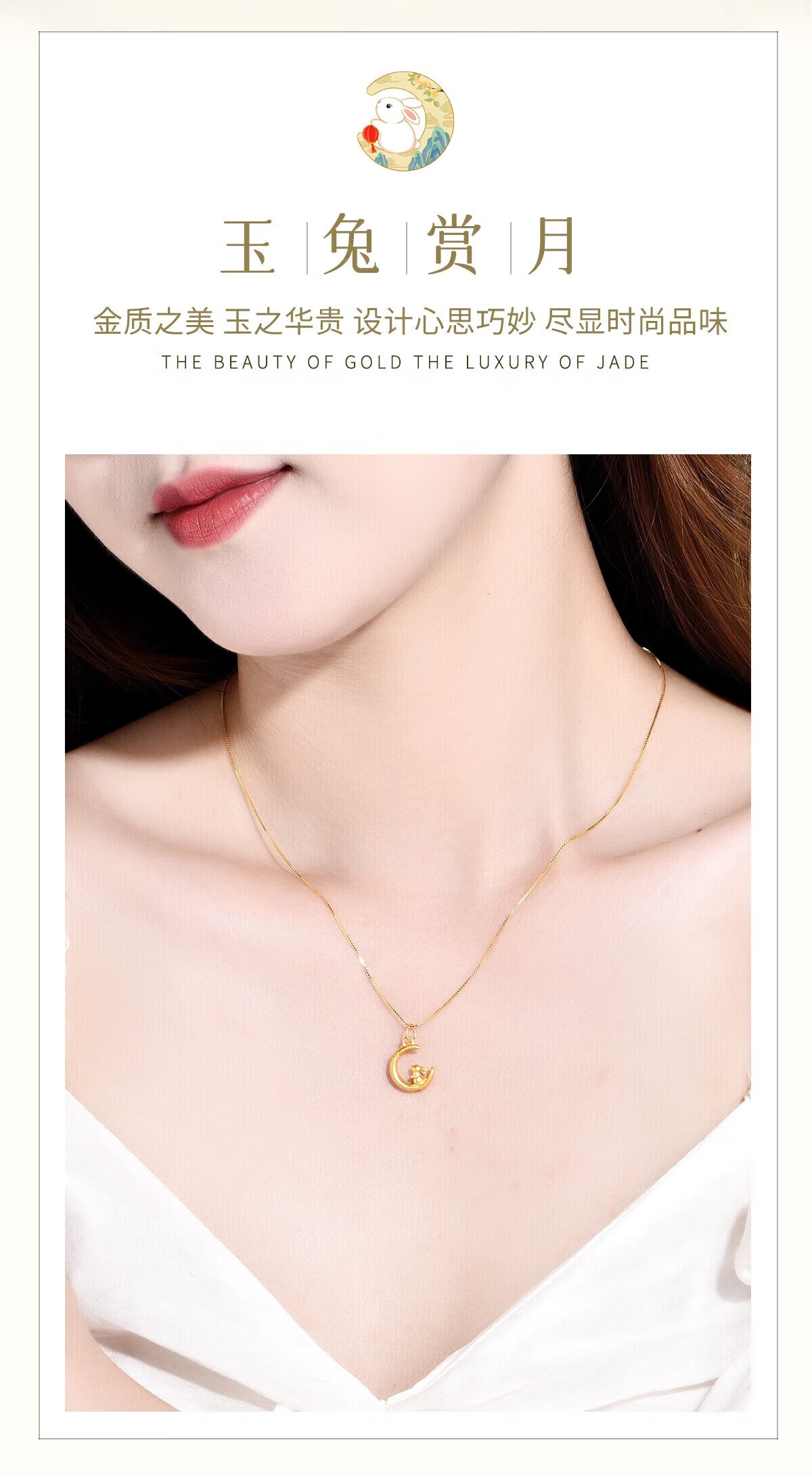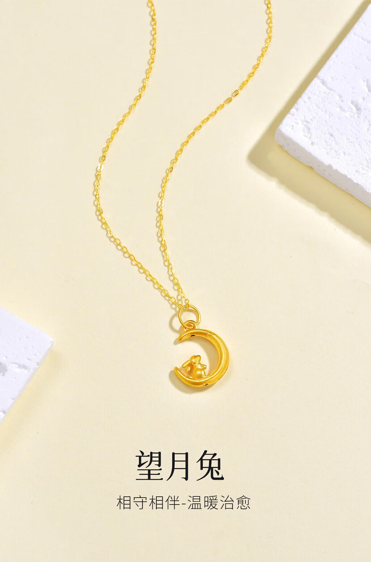 Chow Tai Fook Gold Necklace Women's Hard Gold Moon Rabbit Pendant Small Gold Rabbit Clavicle Chain Zodiac Rabbit Pure Gold Necklace National Day Gift Pure Gold Moon Rabbit Pendant Gold
