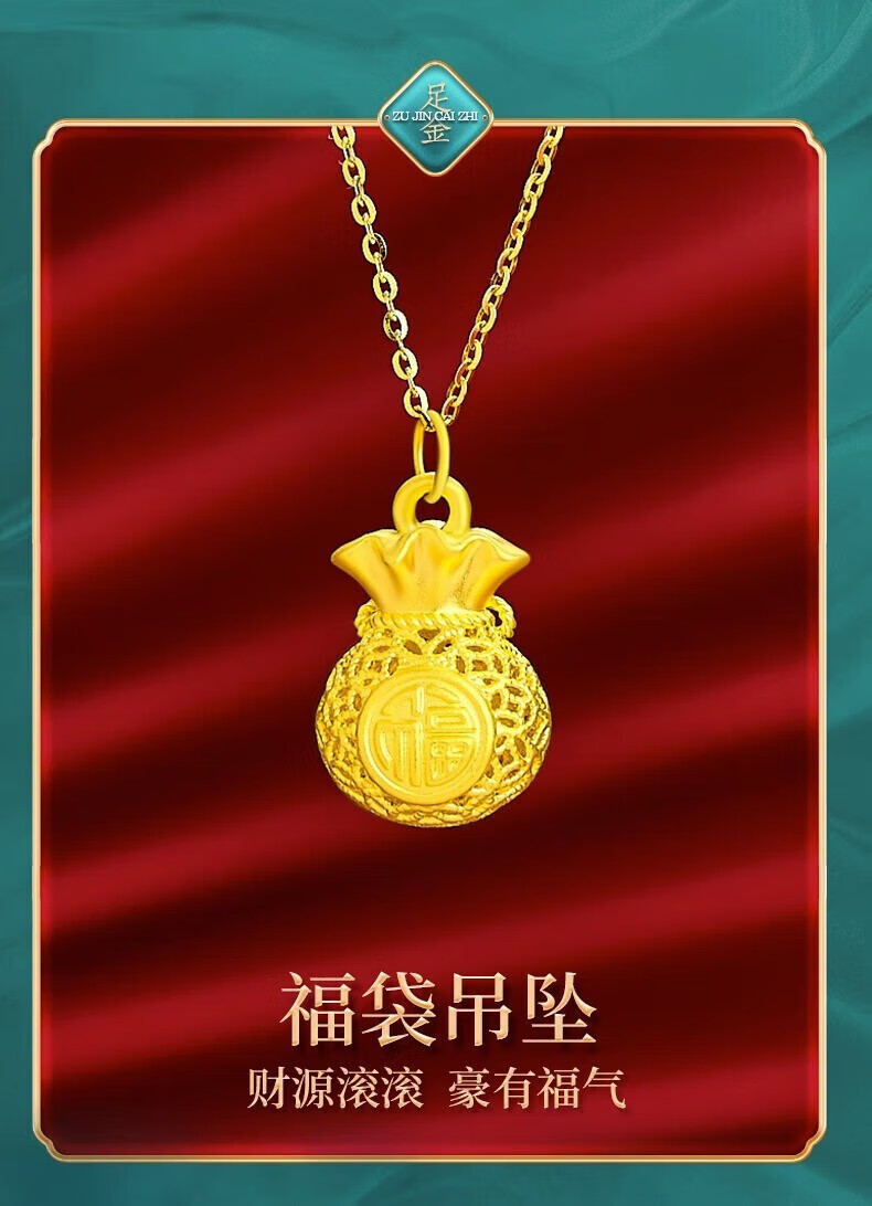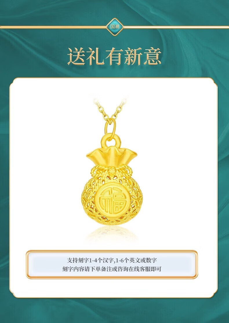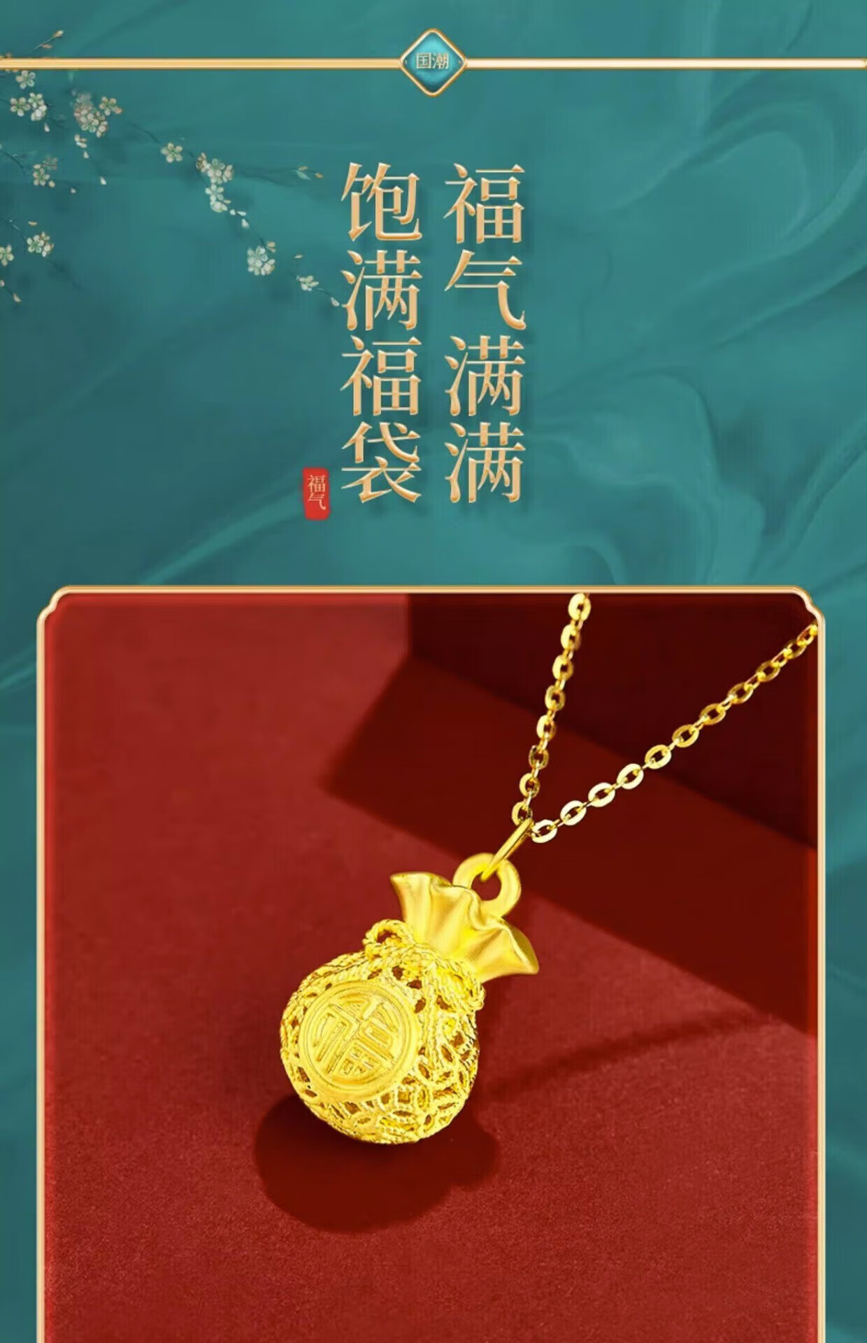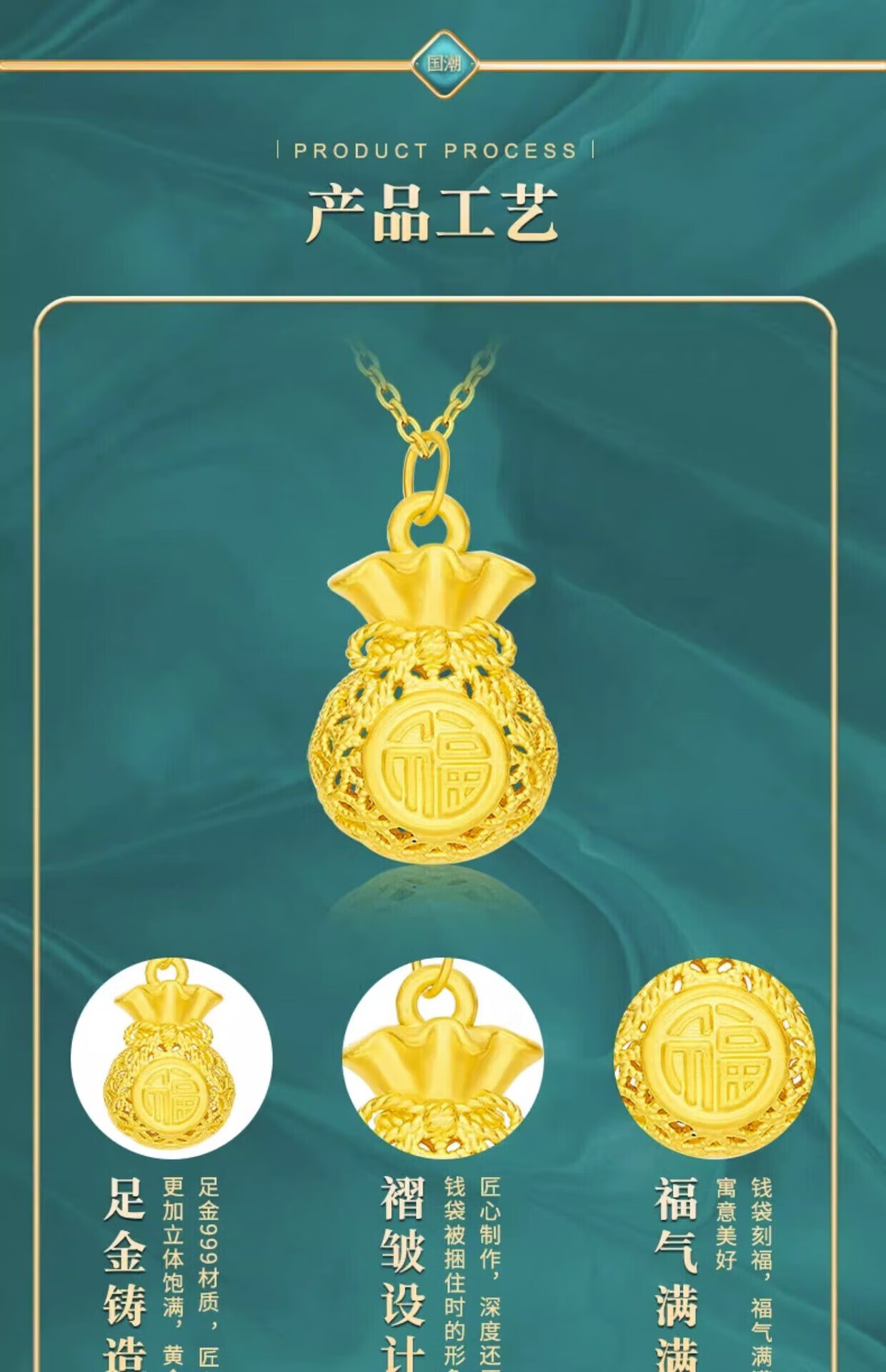 Chow Tai Fook gold pure gold 999 filigree blessing money bag pendant pure gold hollow word "Fu" women's clavicle necklace pure gold blessing bag with 18k titanium gold chain