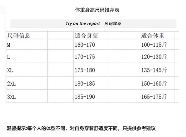 China (cm) 165 / 88-90 170 / 96-98 175 / 108-110 180 / 118-122 185 / 126-130