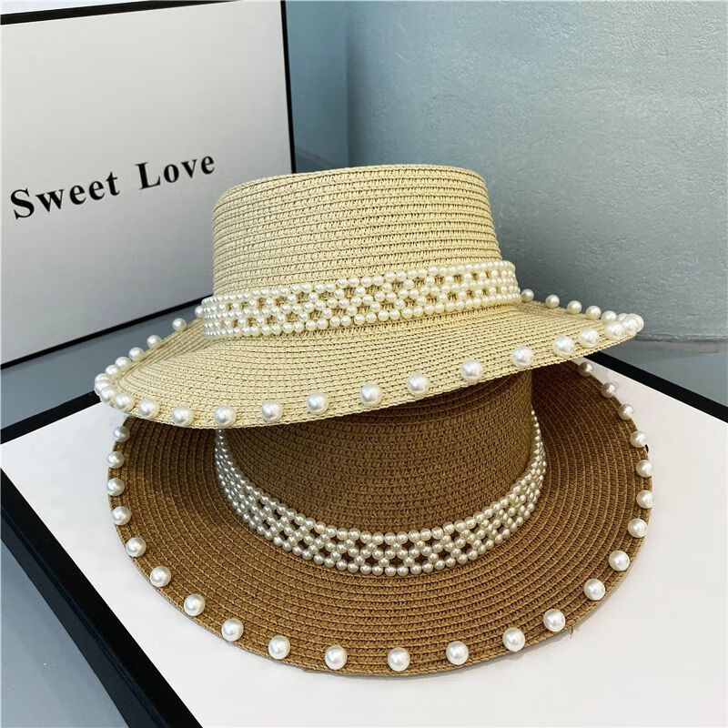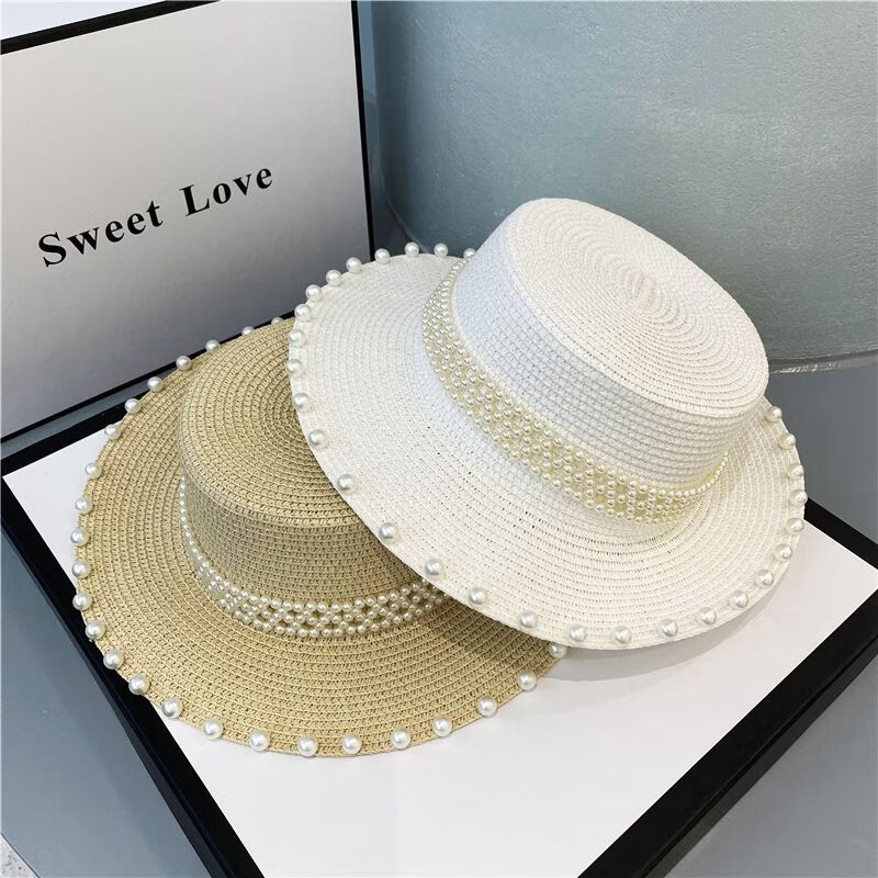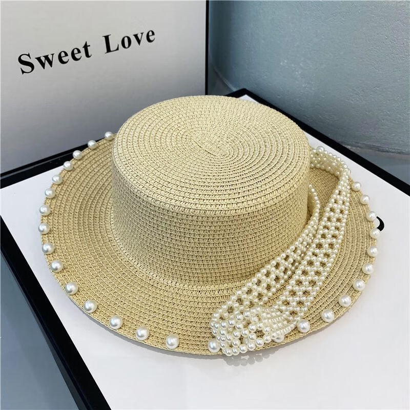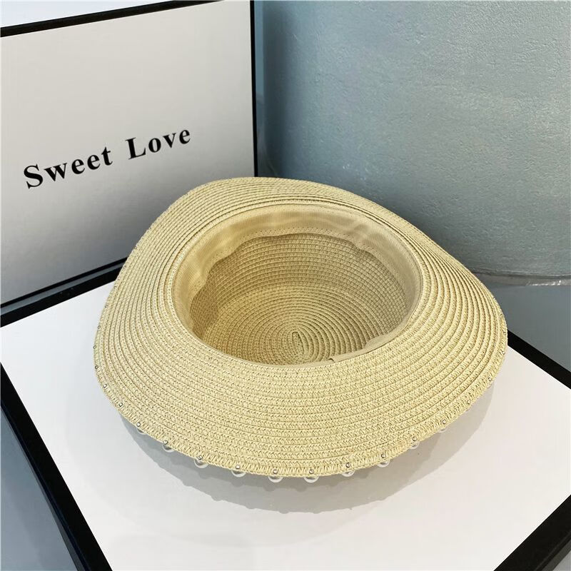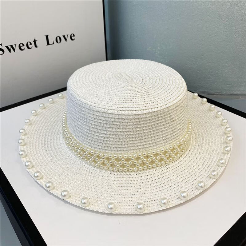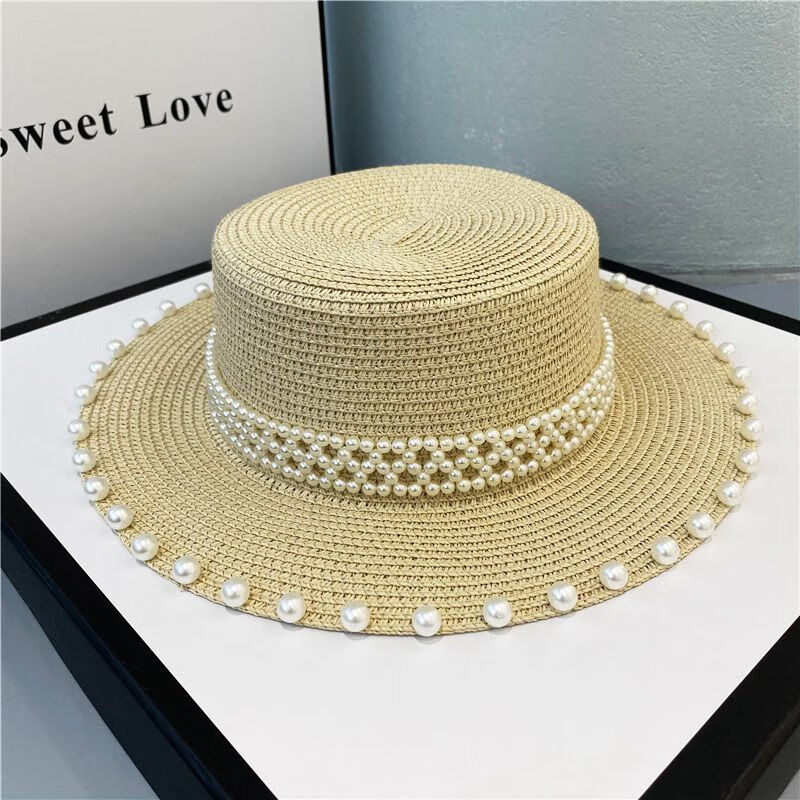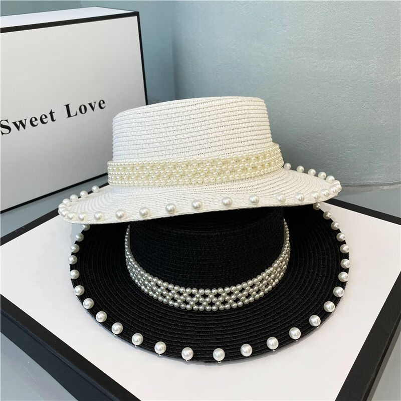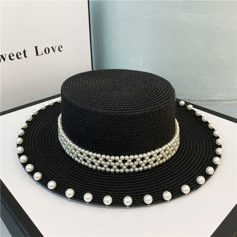 Ye Yu Hepburn style hat seaside beach hat pearl straw straw hat sun hat retro internet celebrity flat top hat summer black head circumference 55-58CM