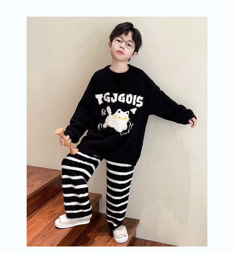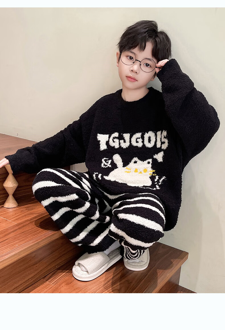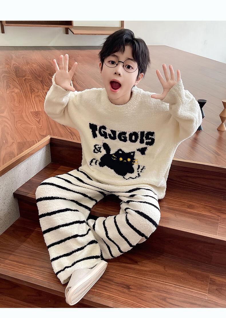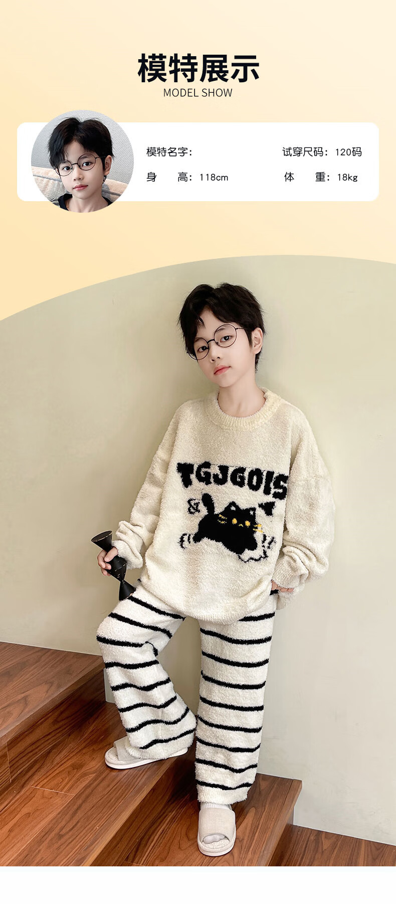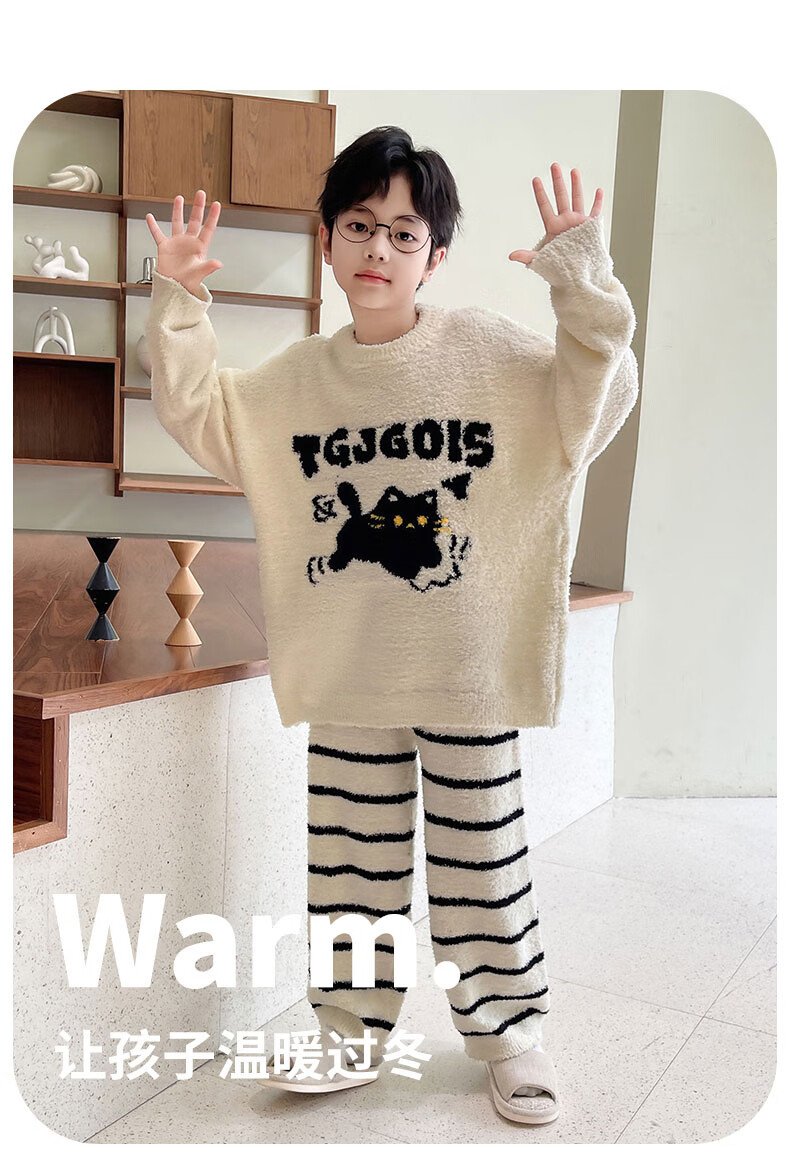 G.duck children's clothing boys' pajamas winter home clothes plus velvet autumn and winter big children thickened coral velvet boys' flannel trendy white 120 m