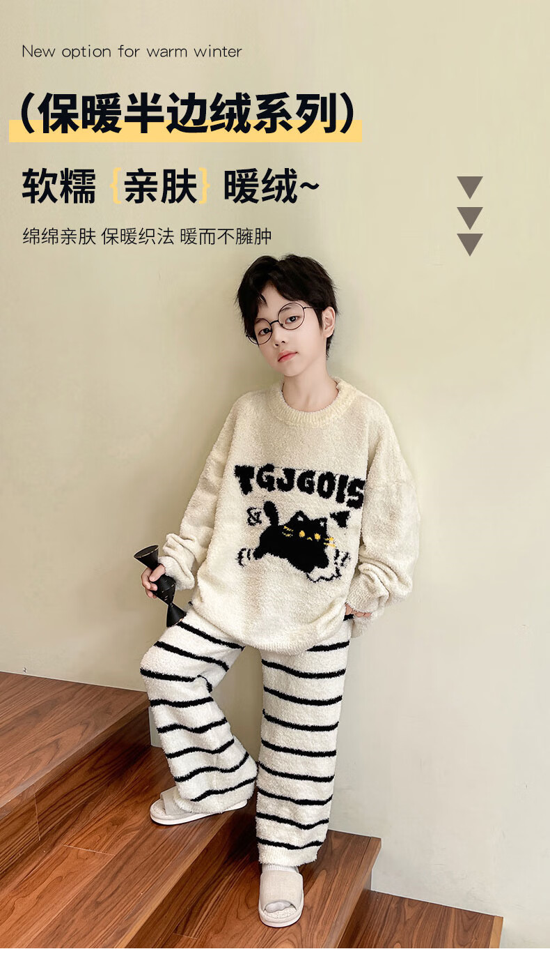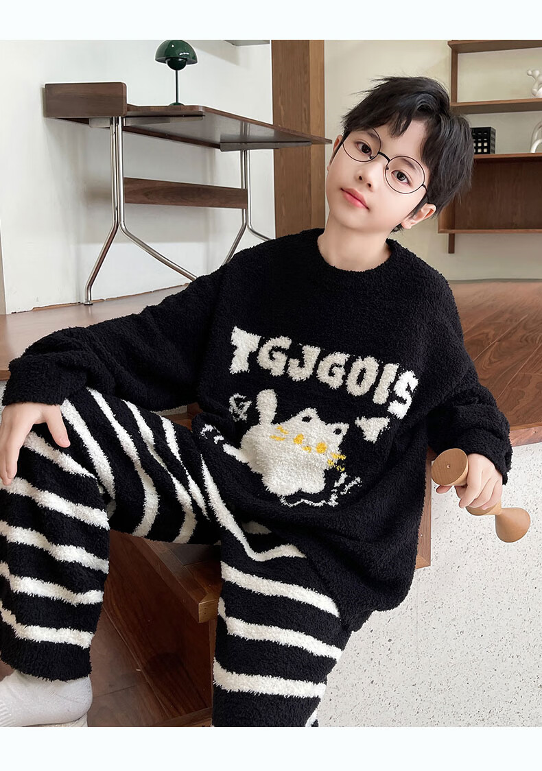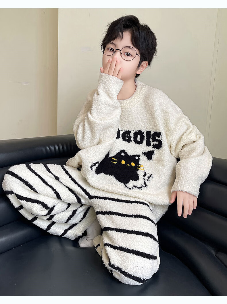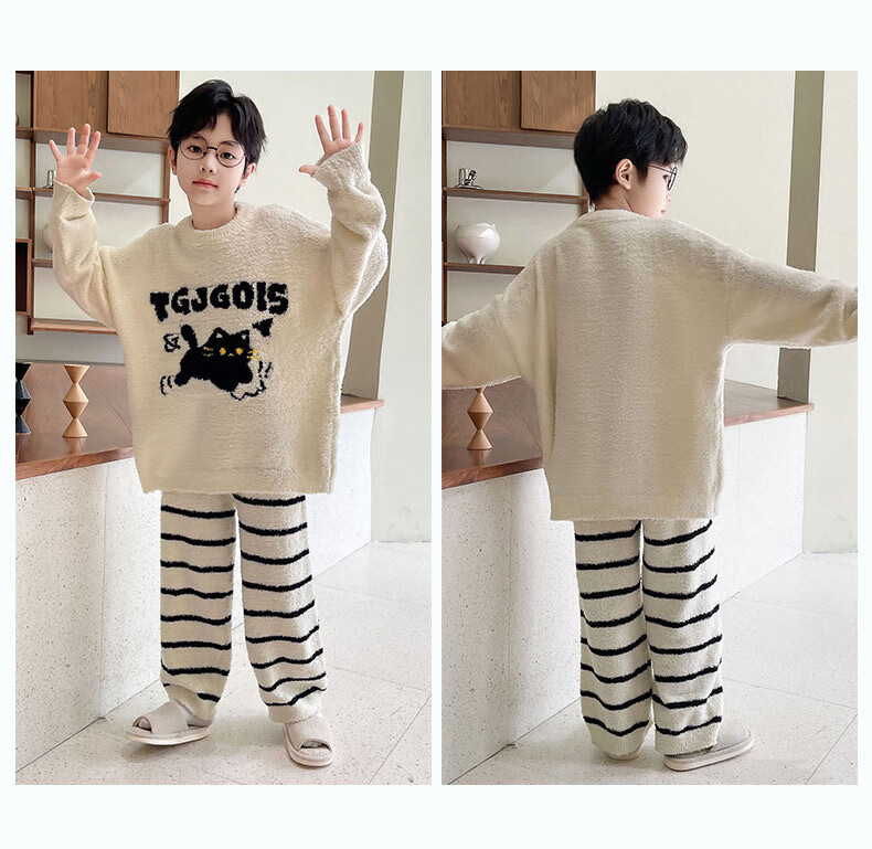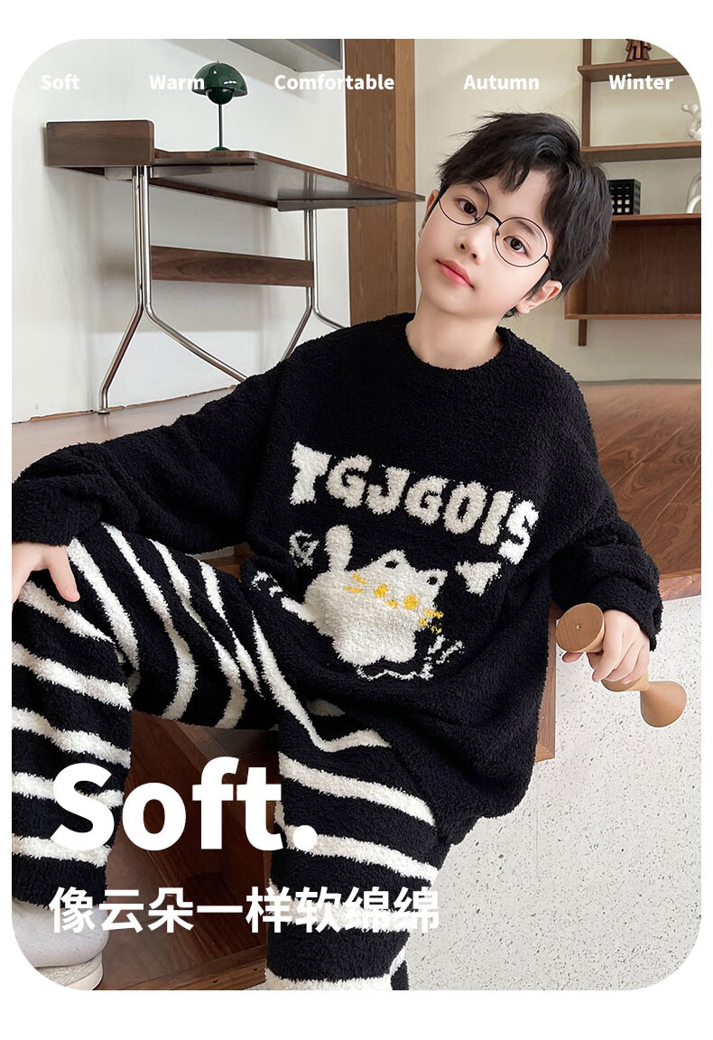G.duck children's clothing boys' pajamas winter home clothes plus velvet autumn and winter big children thickened coral velvet boys' flannel trendy white 120 m