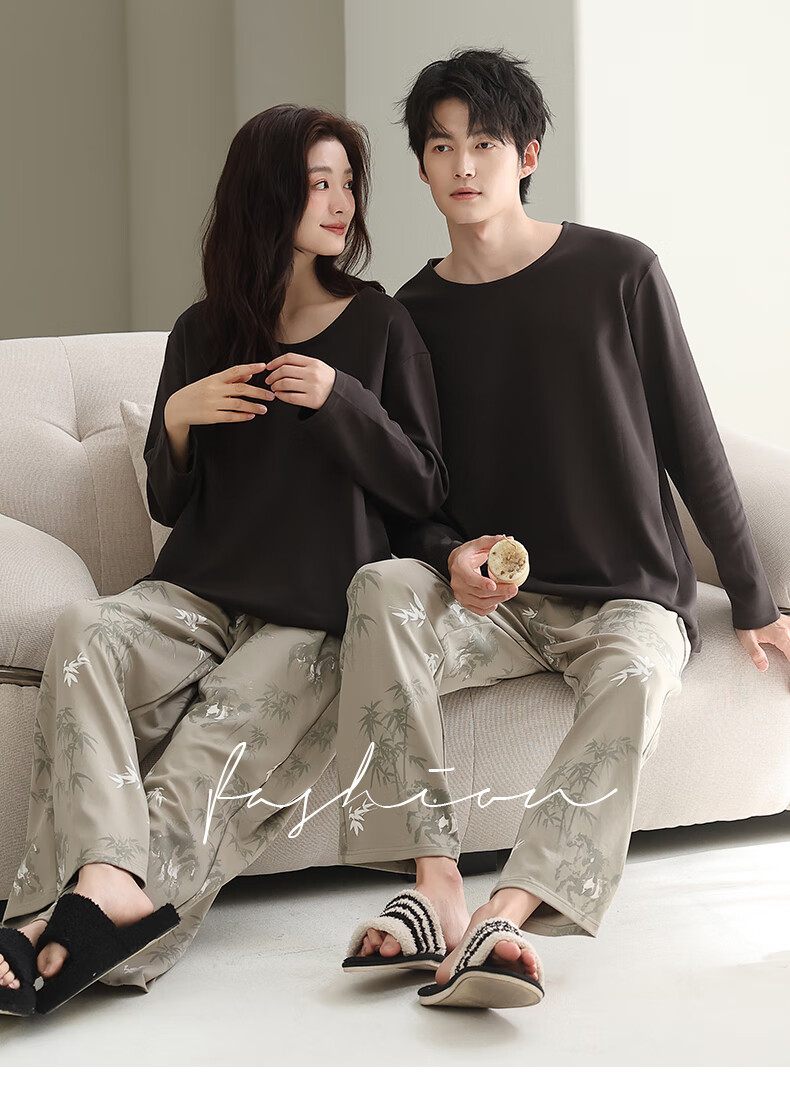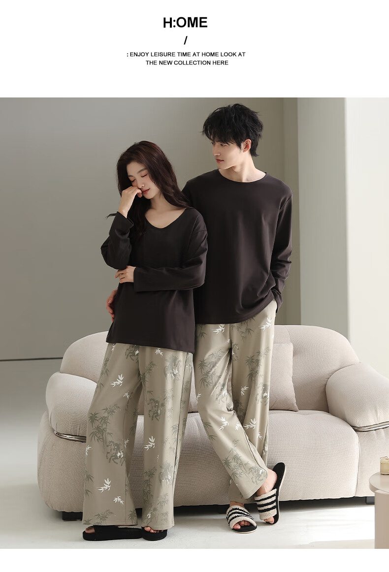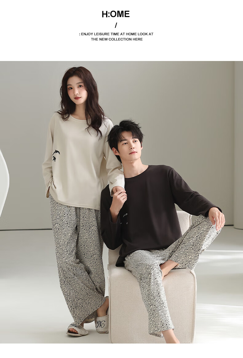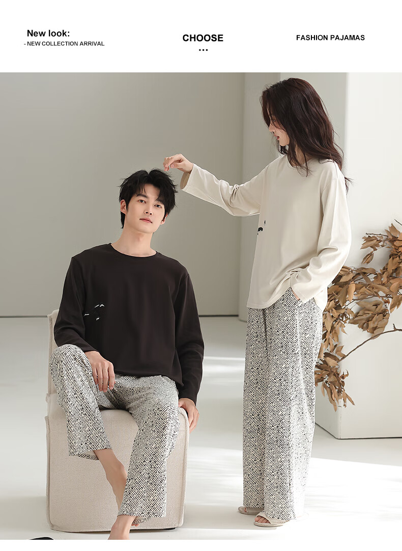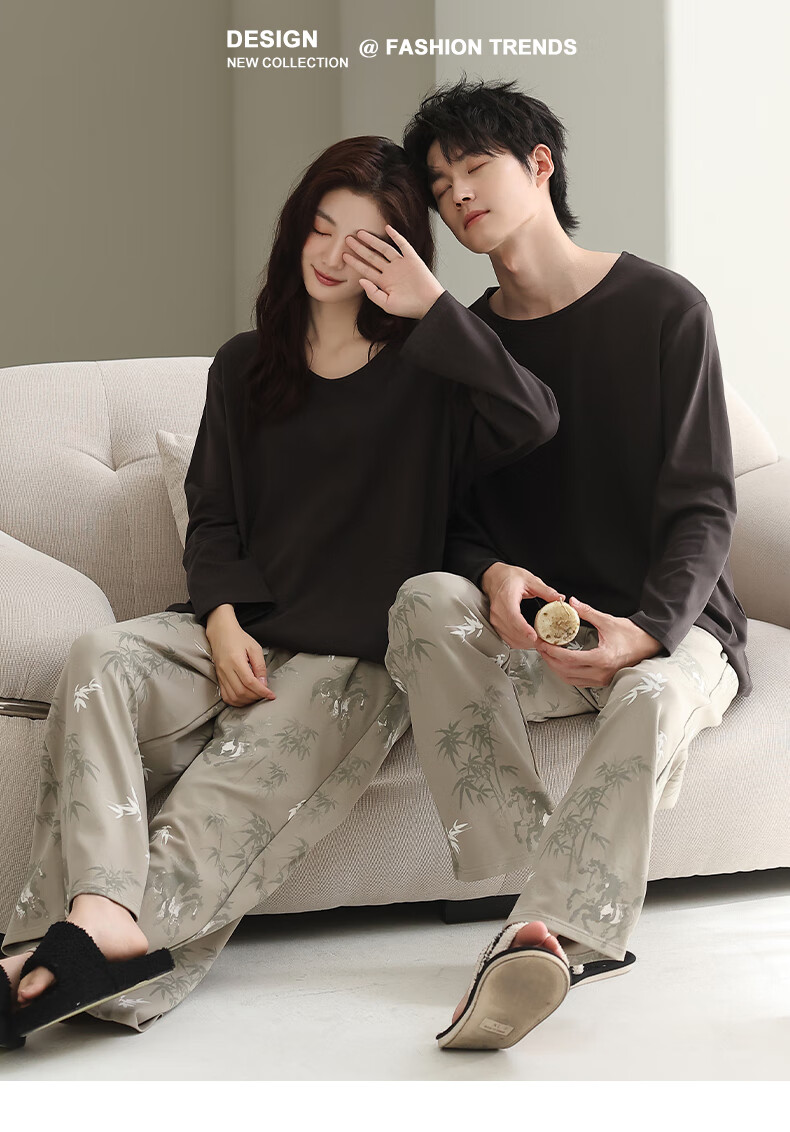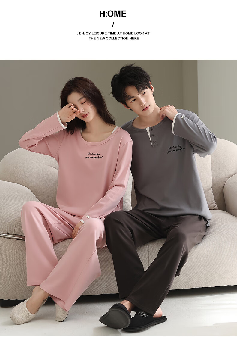 LangSha 7A Antibacterial Couple Pajamas for One Man and One Woman Autumn Pure Cotton Round Neck Cartoon Casual Wearable Spring and Autumn Home Clothing 32506 Couple M Female + XL Male