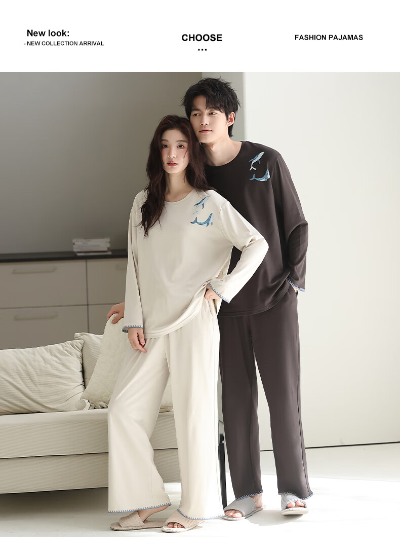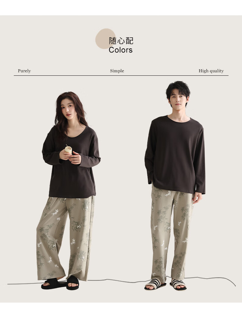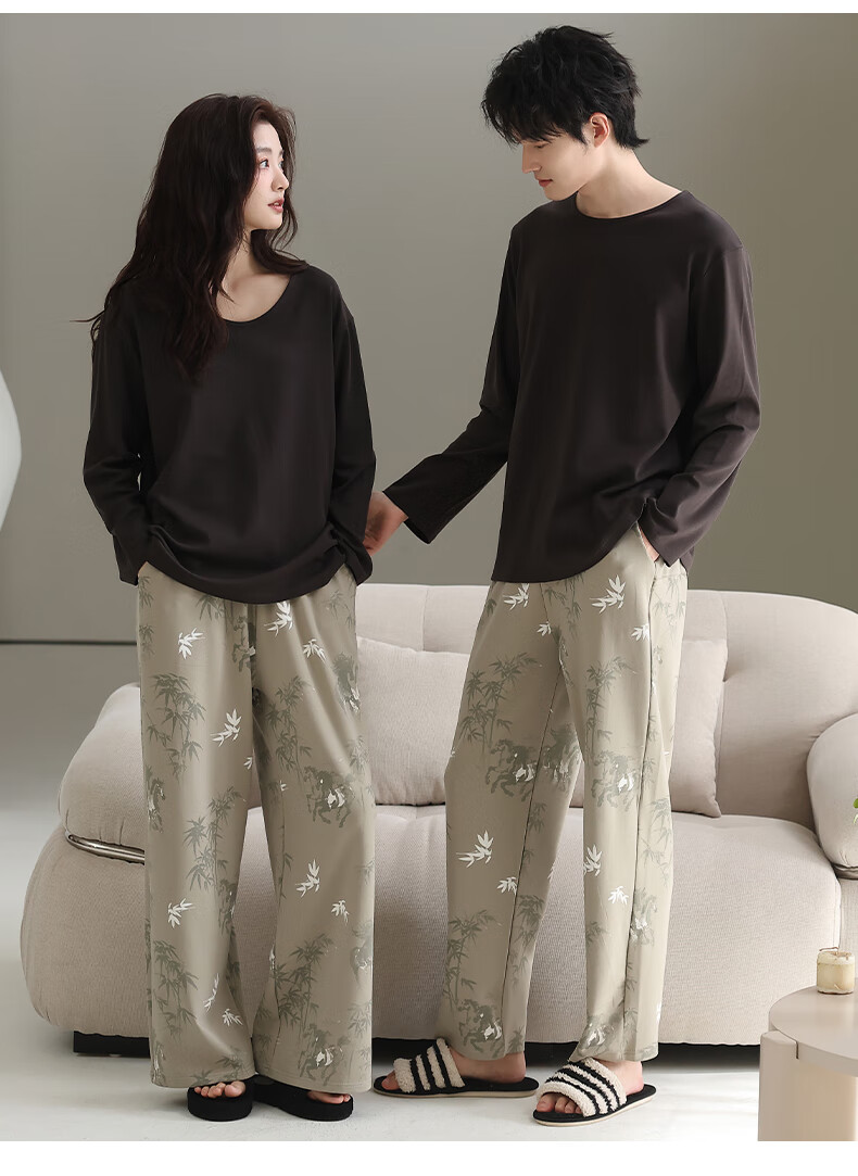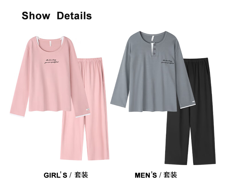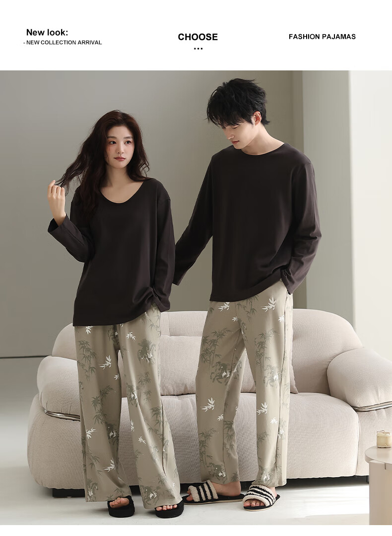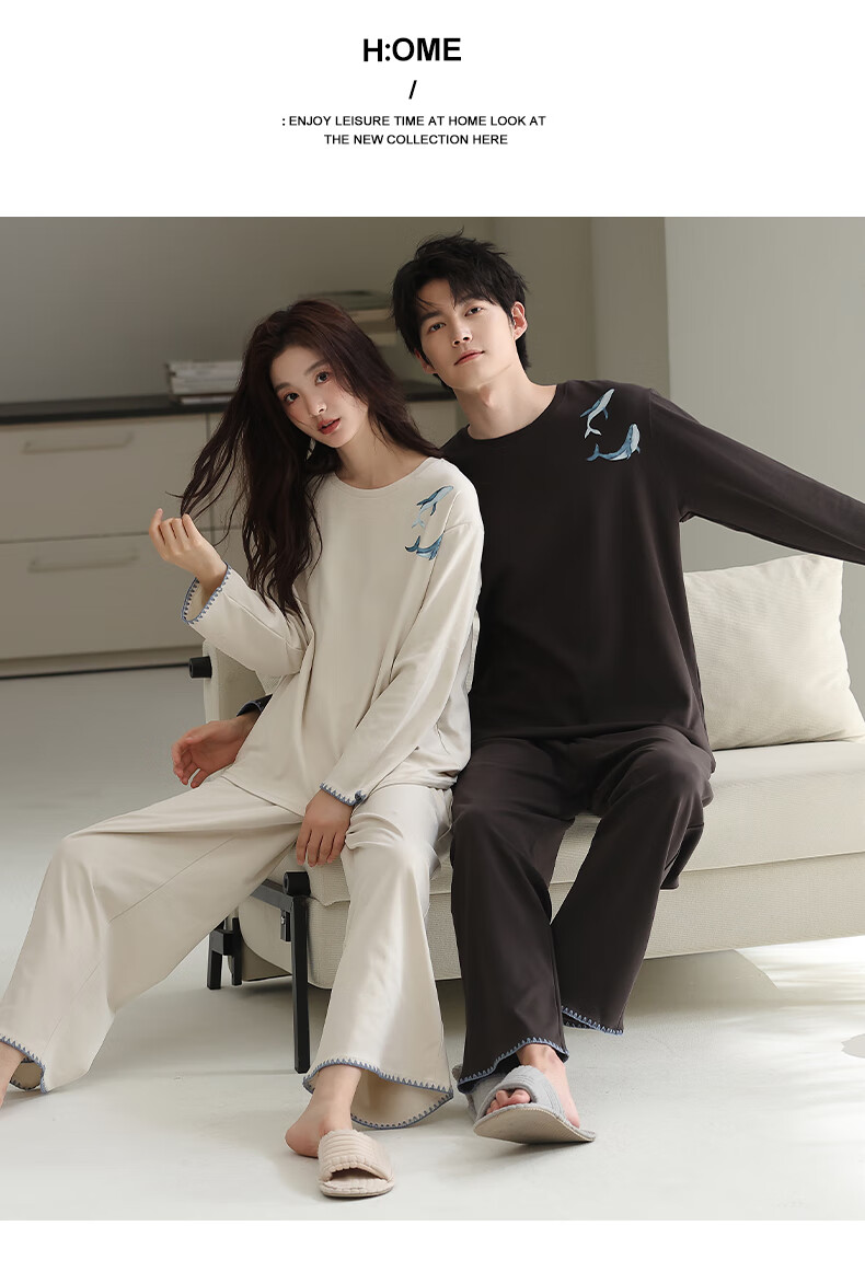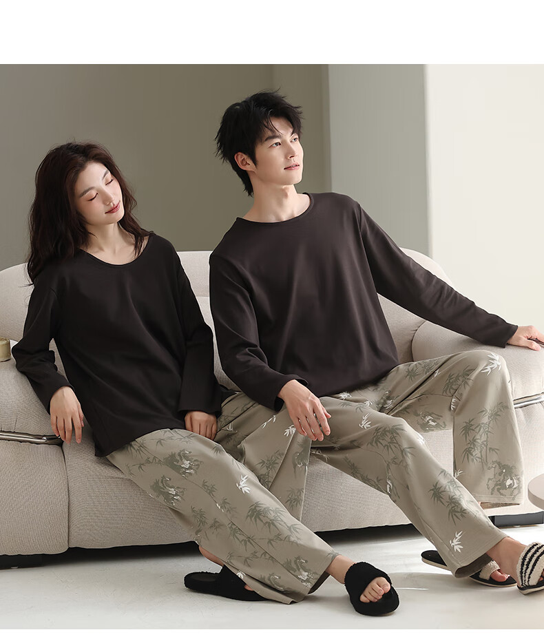 LangSha 7A Antibacterial Couple Pajamas for One Man and One Woman Autumn Pure Cotton Round Neck Cartoon Casual Wearable Spring and Autumn Home Clothing 32506 Couple M Female + XL Male