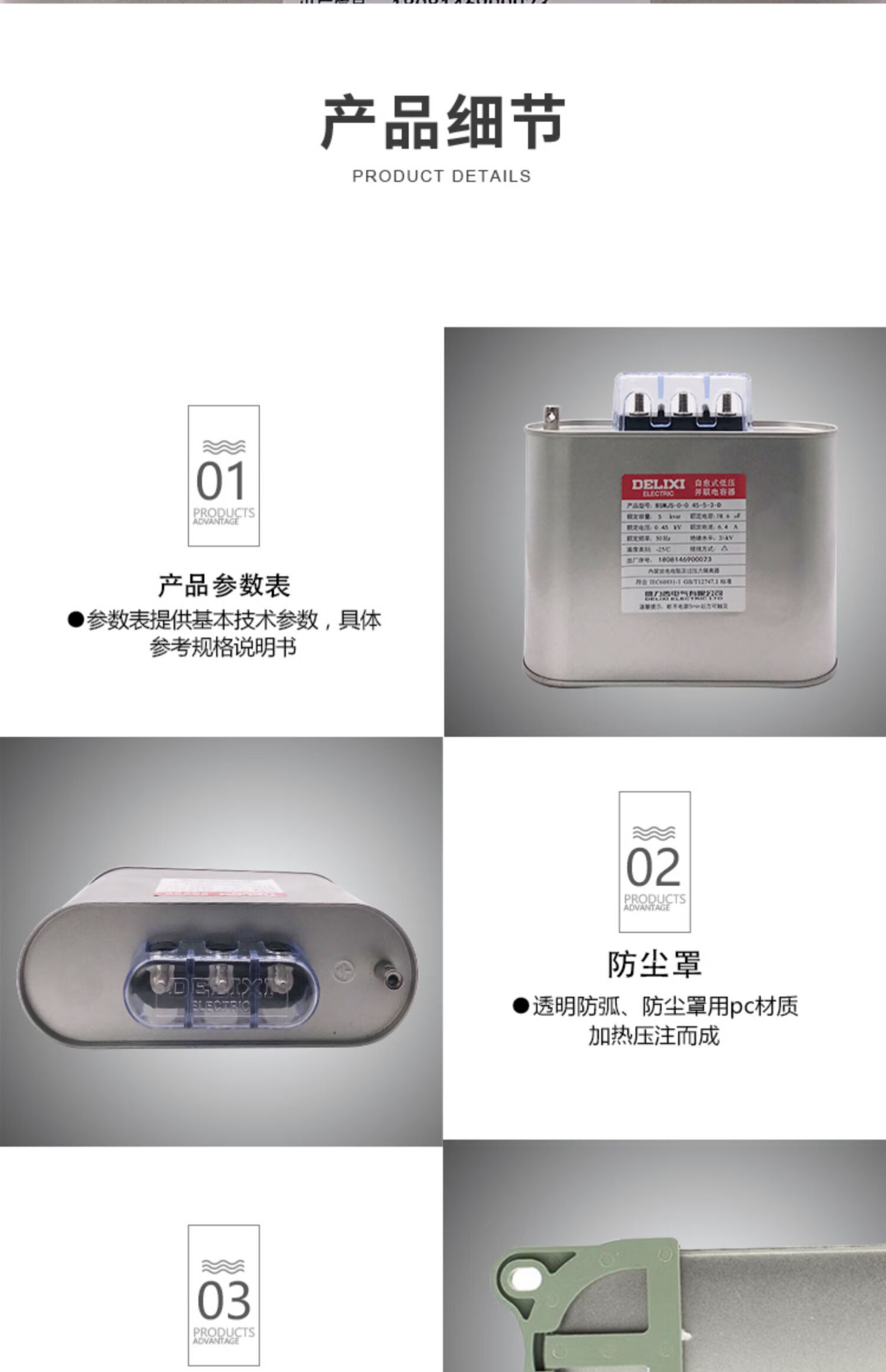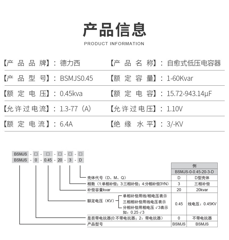 Delixi self-healing low-voltage parallel power capacitor BSMJS0.45 withstand voltage 450V reactive power compensation 20-3 20Kvar 450V