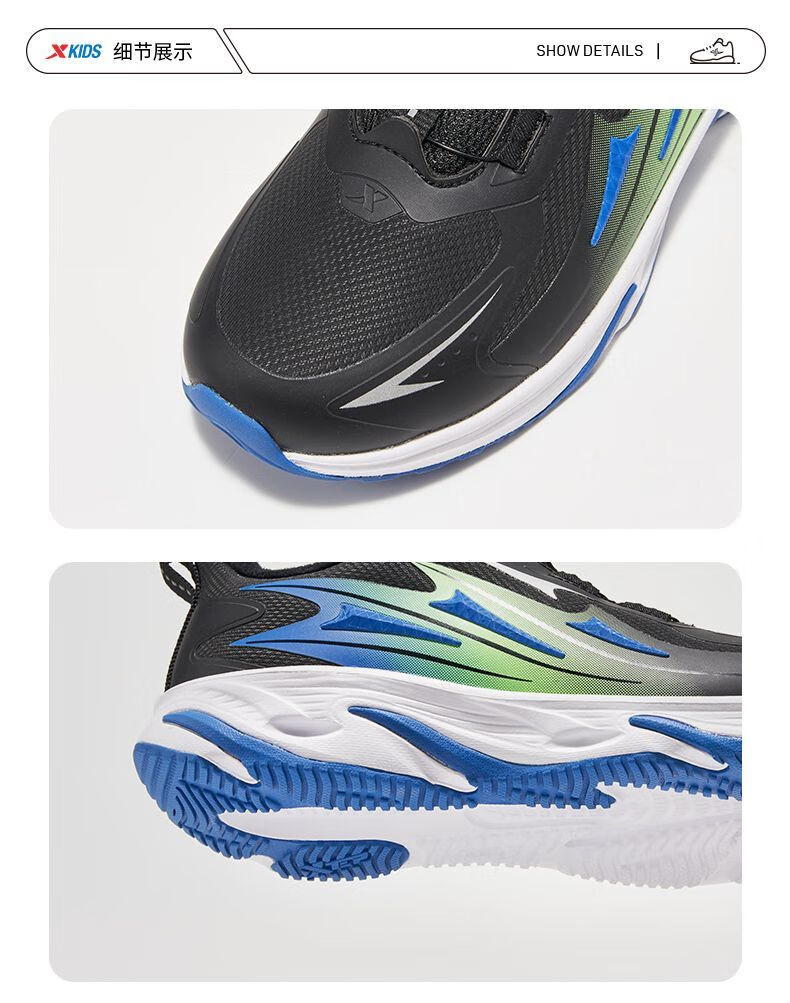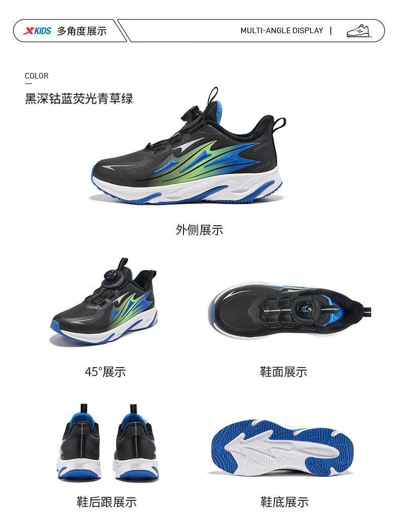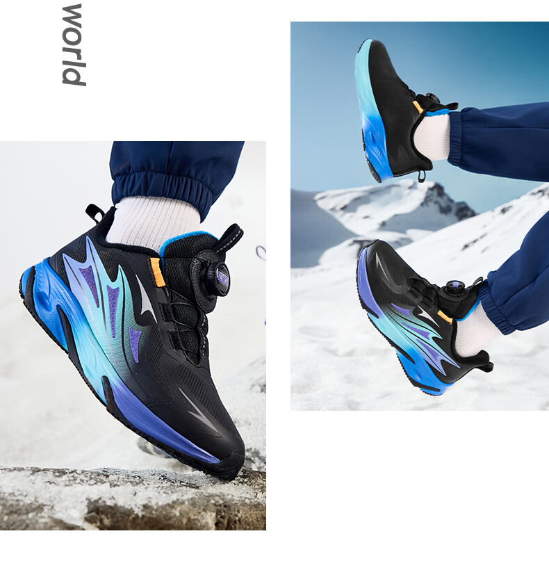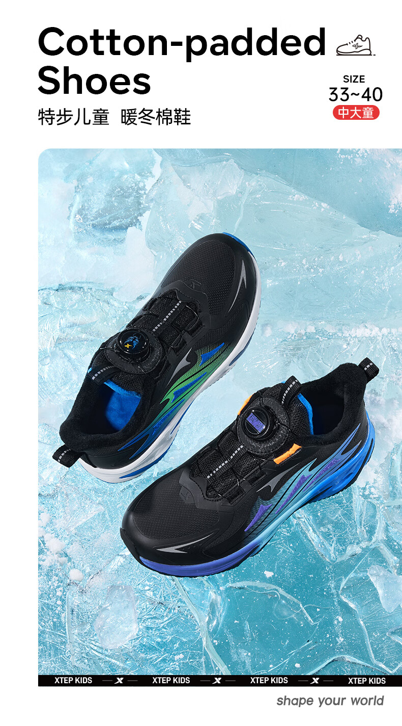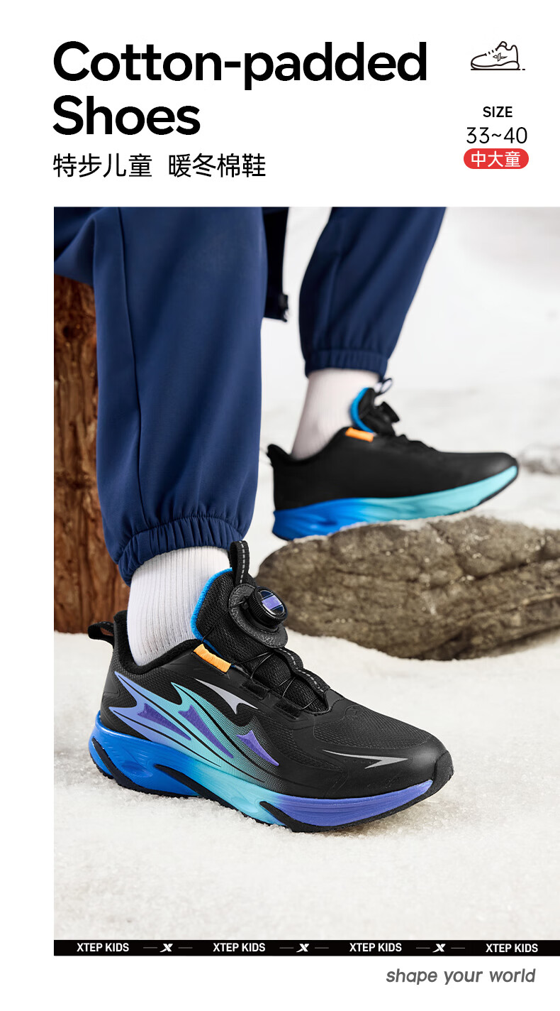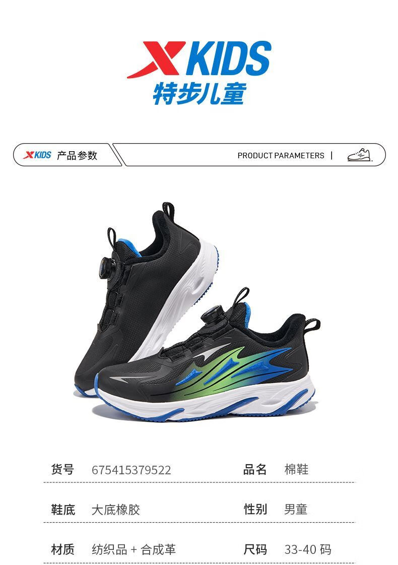 XTEP Children's Winter Low-top Knob Button Plus Velvet Warm Anti-Slip Cushioning Cotton Shoes for Boys, Middle and Large Children Sports and Leisure Black/Dark Cobalt Blue/Fluorescent Grass Green 33
