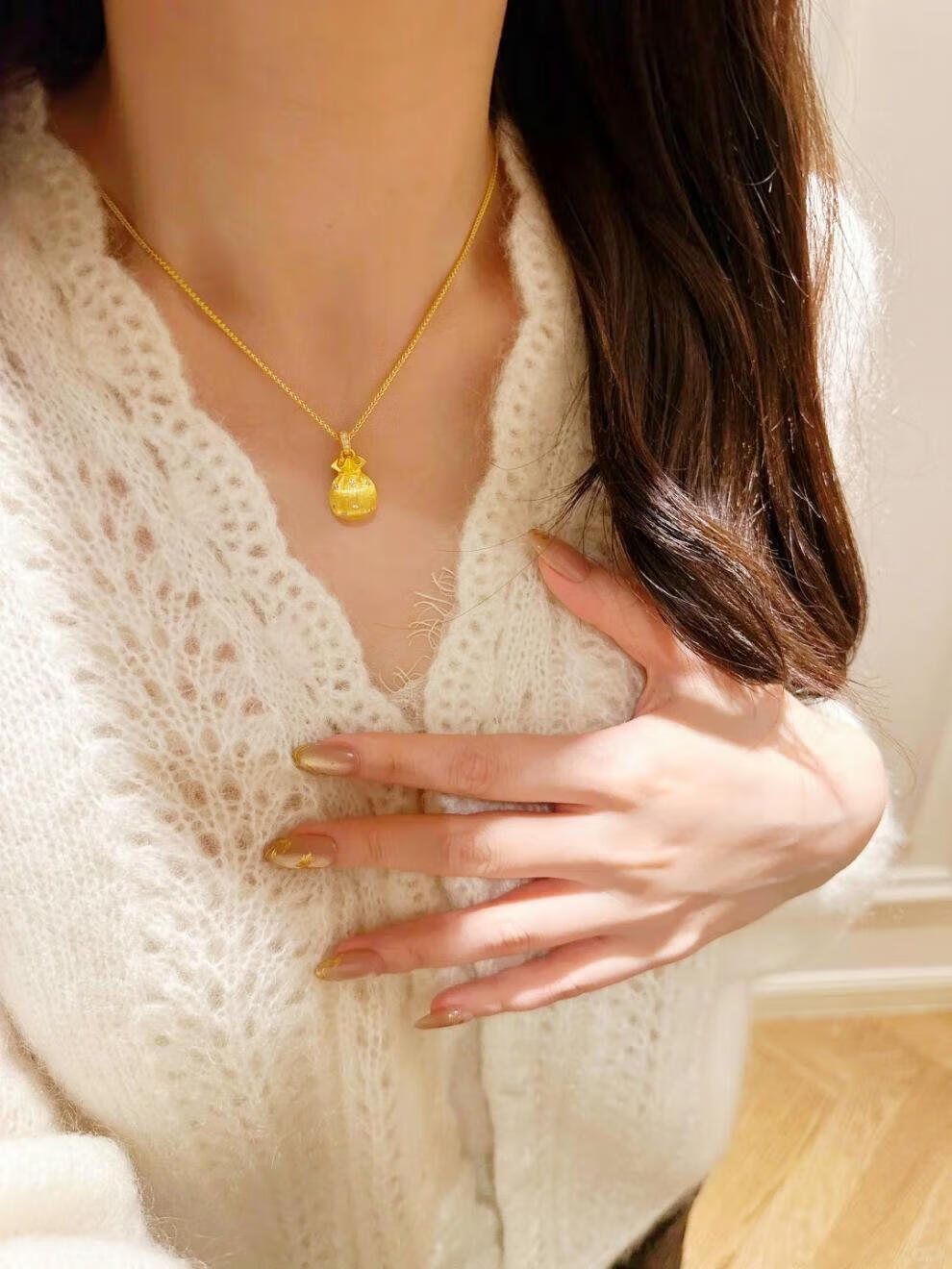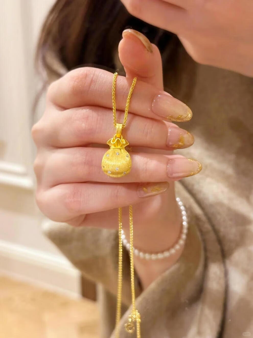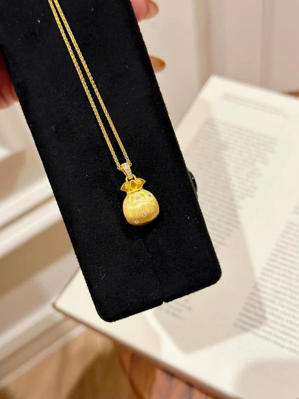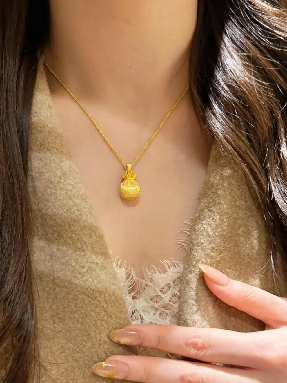 Beimixing 18K gold-filled hand-brushed lucky bag necklace gold pendant sweater chain for women Diamond-encrusted brushed lucky bag gold