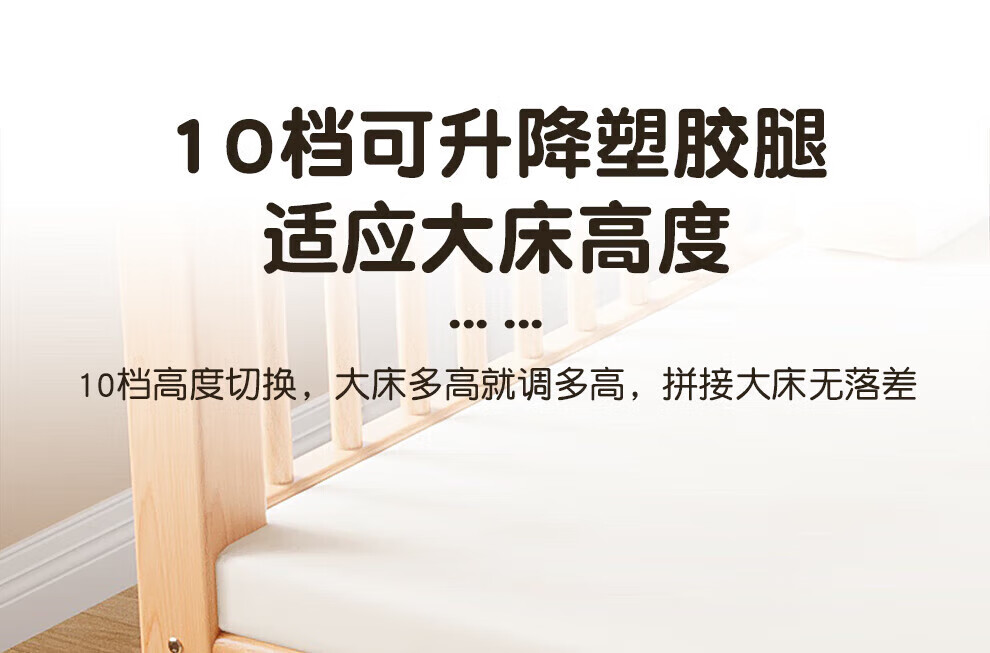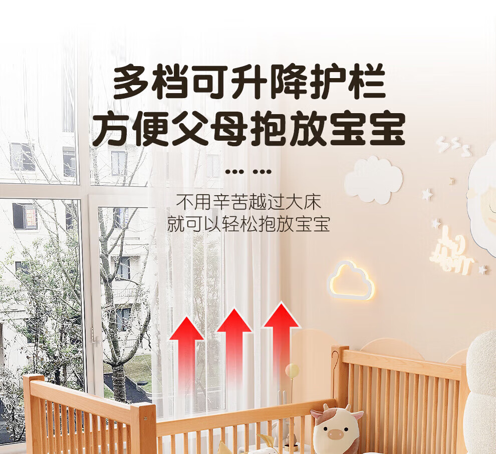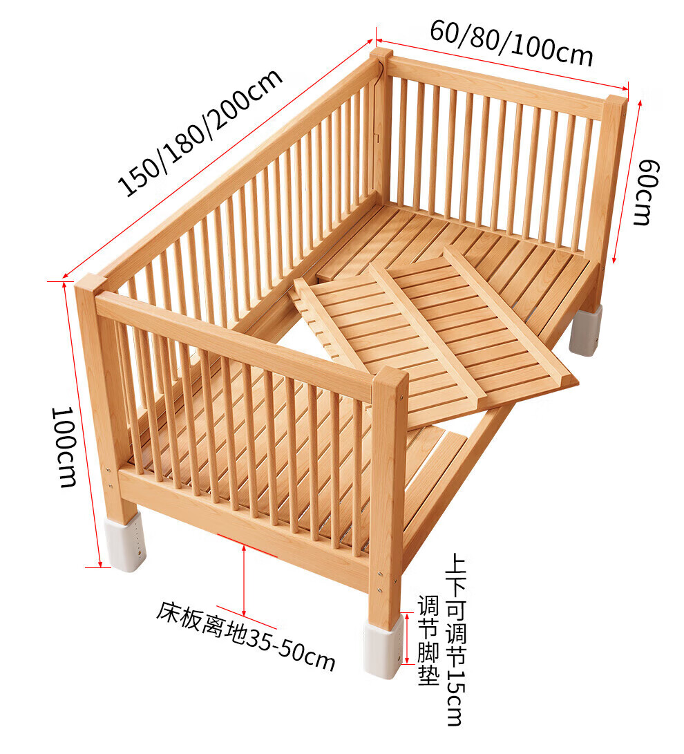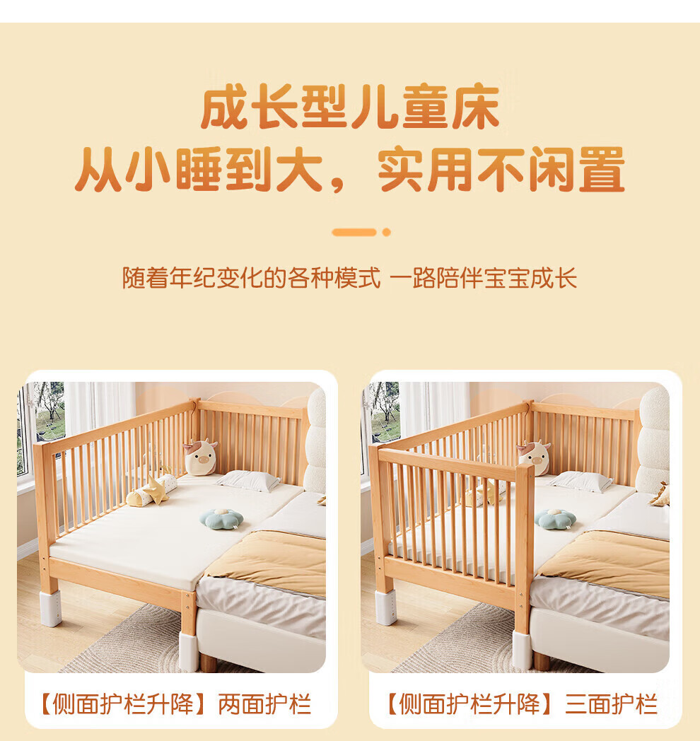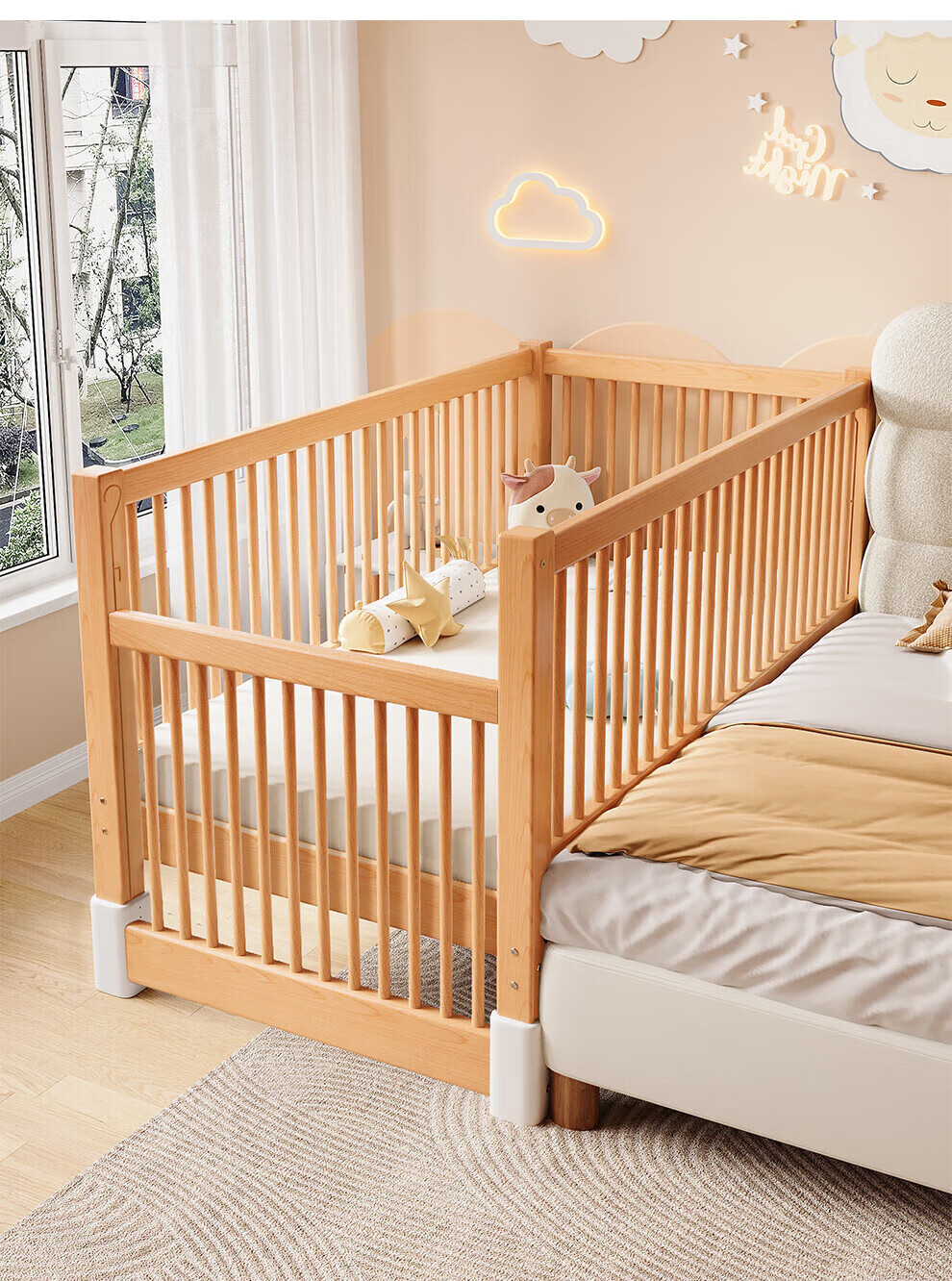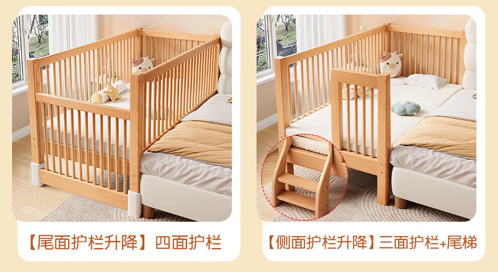 Qiuying liftable beech wood spliced bed crib widened spliced large bed children's bedside bed spliced bed with three side lifting 5cm mattress + 7A antibacterial cotton bedside can lift length 200 width 60 height 35 60 guardrails