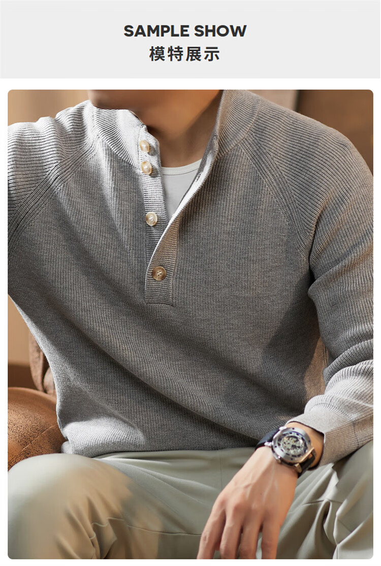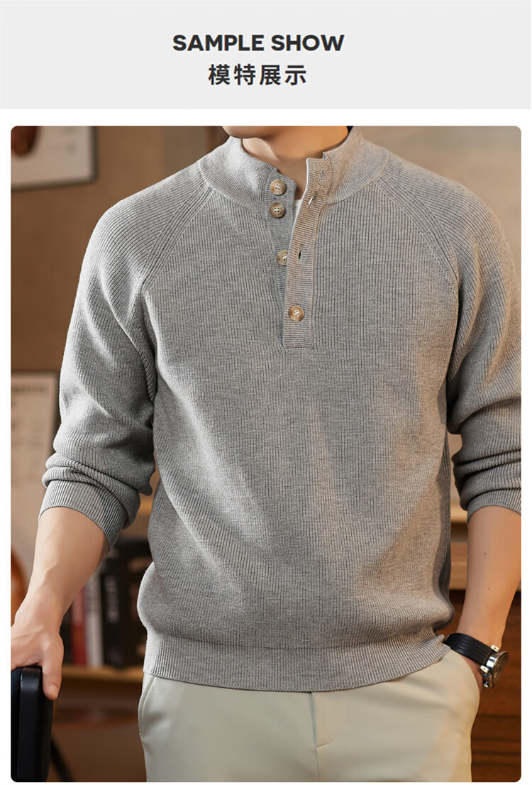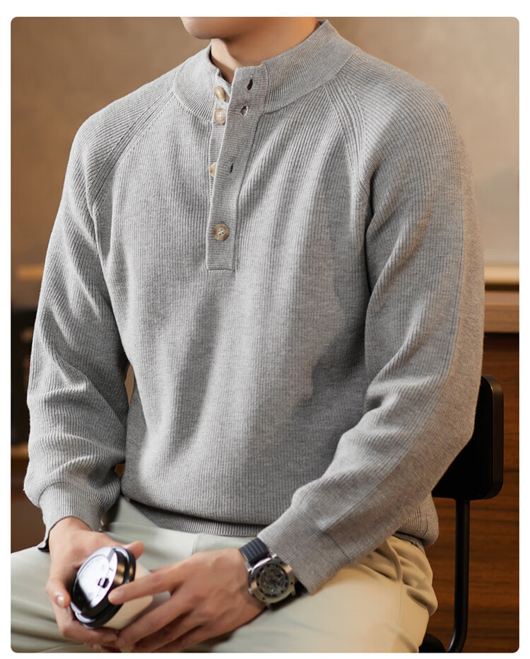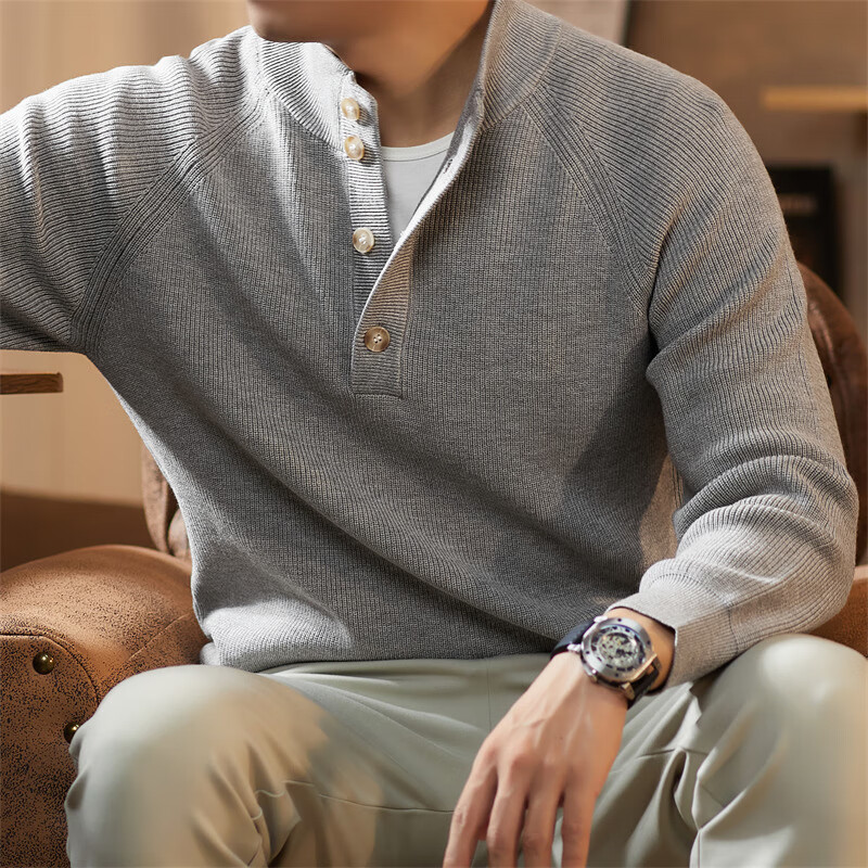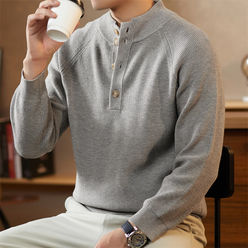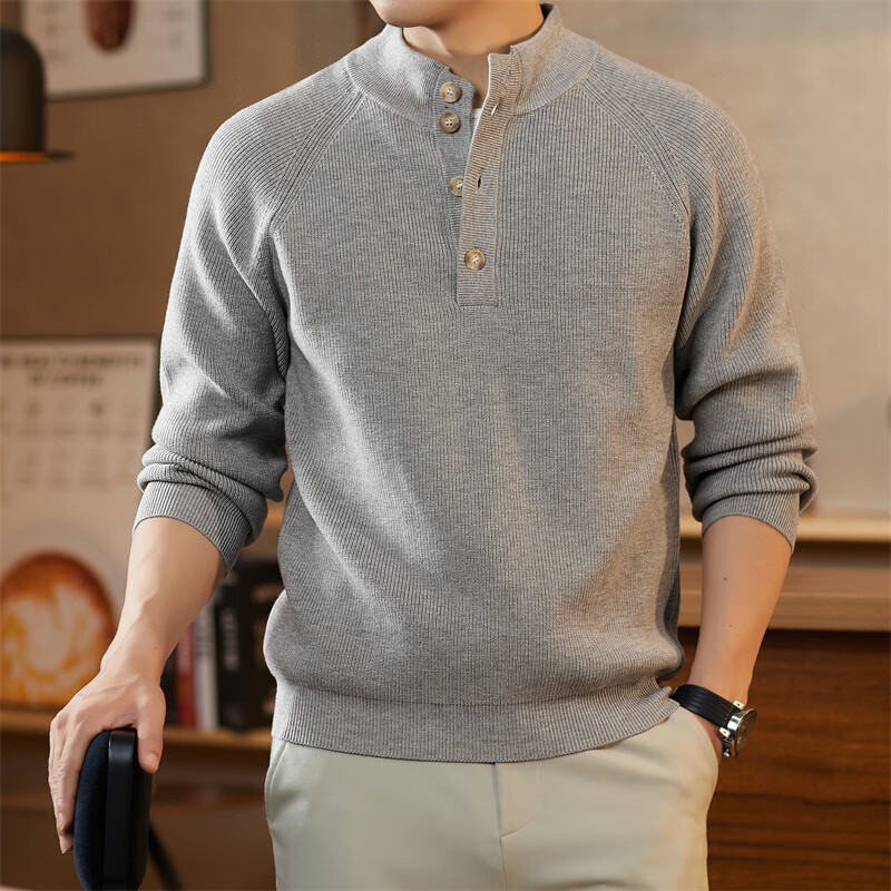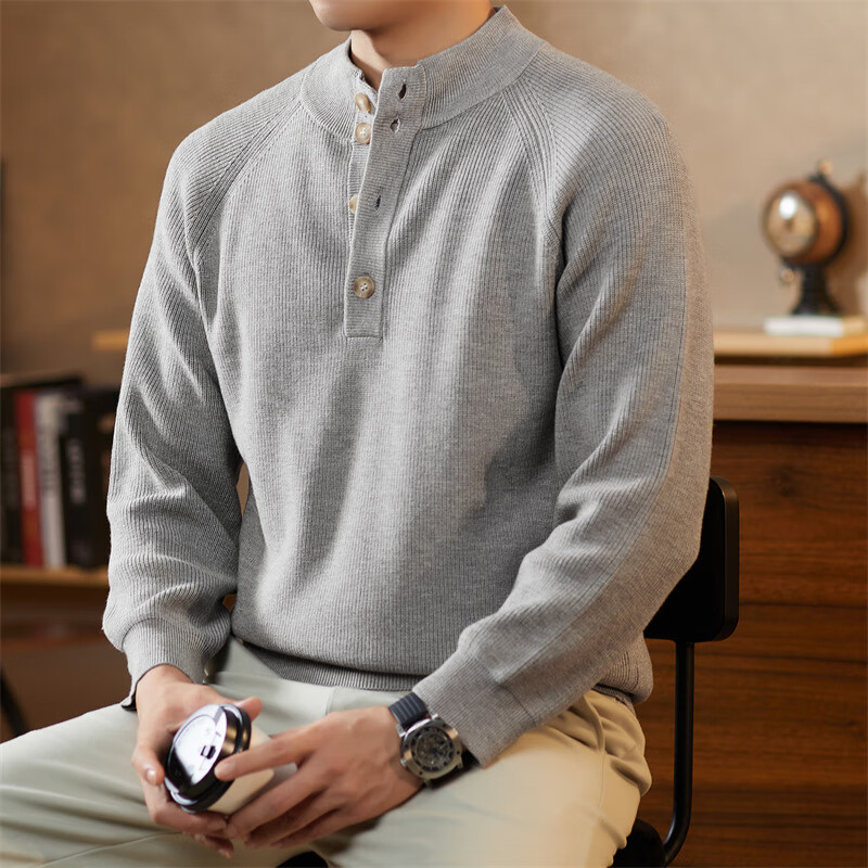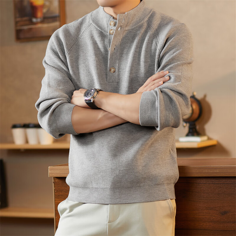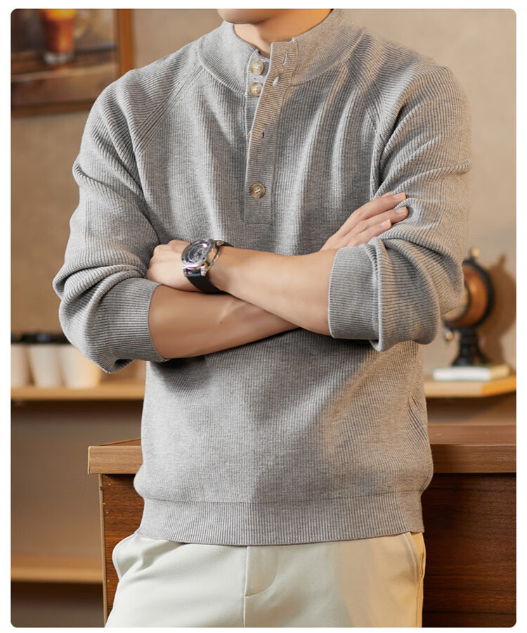 ROMON Japanese retro solid color Henry collar pullover sweater jacket for men autumn and winter new bottoming with casual sweater Gray S 165/80A