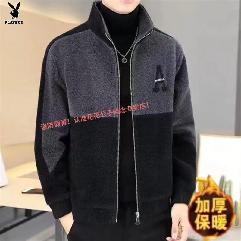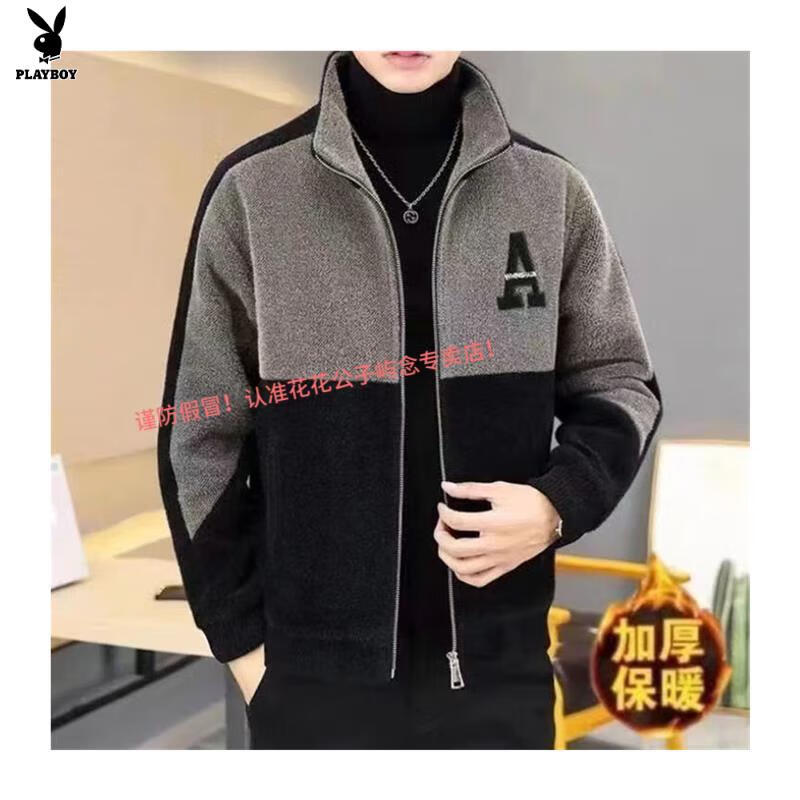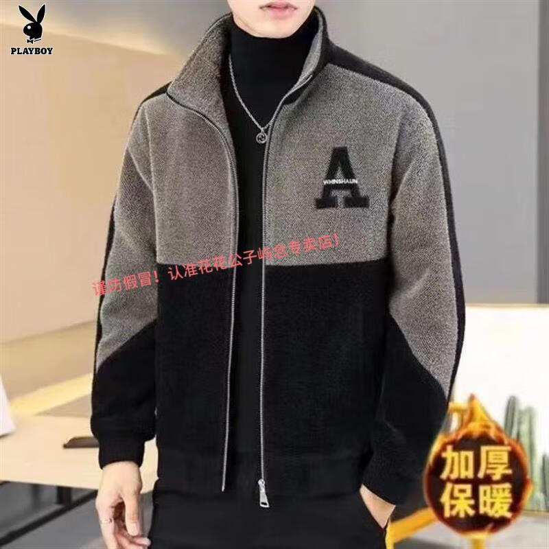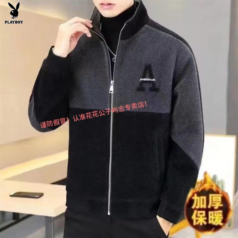 Playboy Woolen Coat Men's Short Jacket Autumn and Winter New Stand Collar Plus Velvet Embroidered Casual Jacket Woolen Windbreaker Black - Warm - Quality Guaranteed Thickened XS Small Gifts