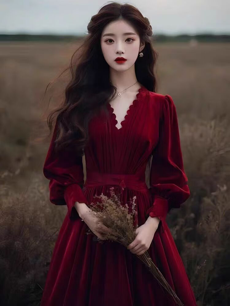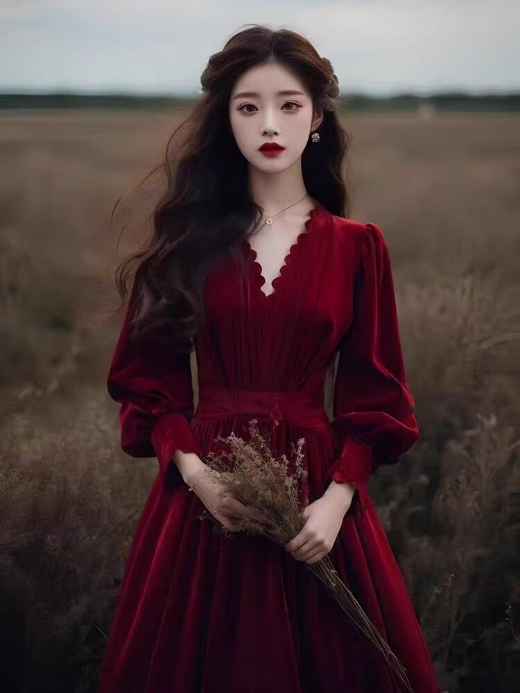 Xinyoujie 2025 velvet long-sleeved French high-end dress female bride wedding toast dress 2026 burgundy S