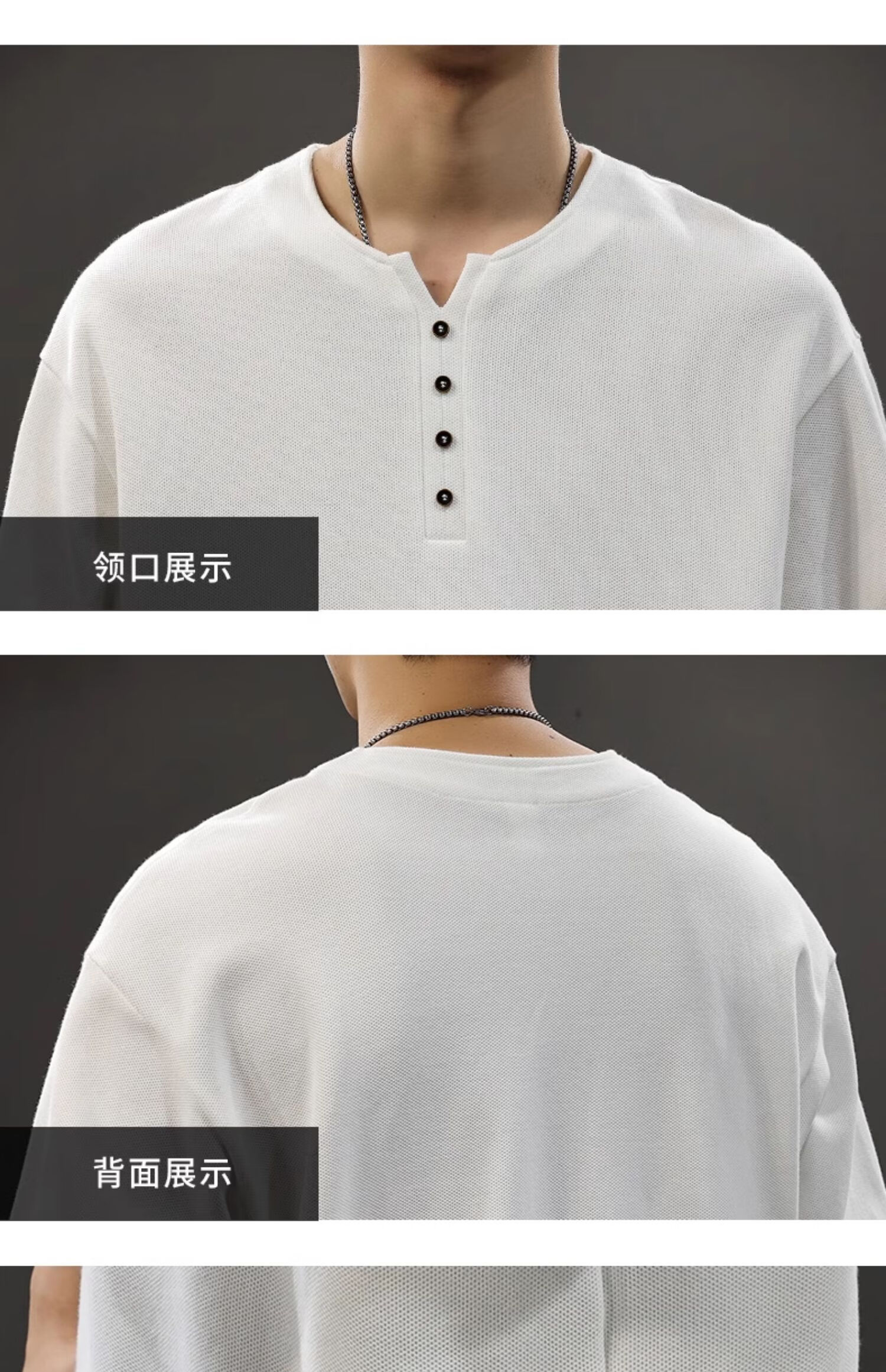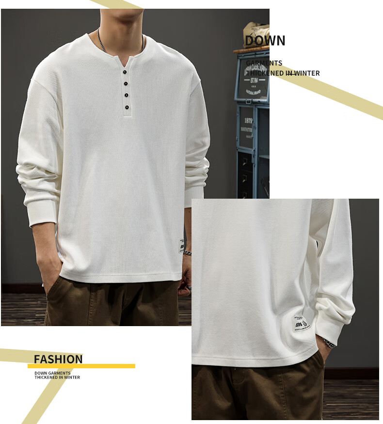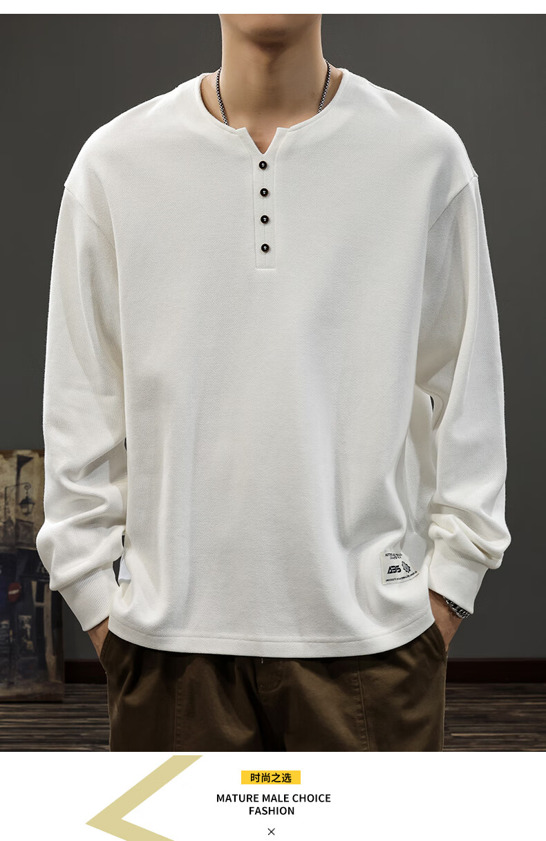 Luo Meng Spring and Autumn New 2025 Cotton Henley Collar Men's Sweater Loose Long Sleeve T-Shirt American Top White Bottoming Shirt White XL