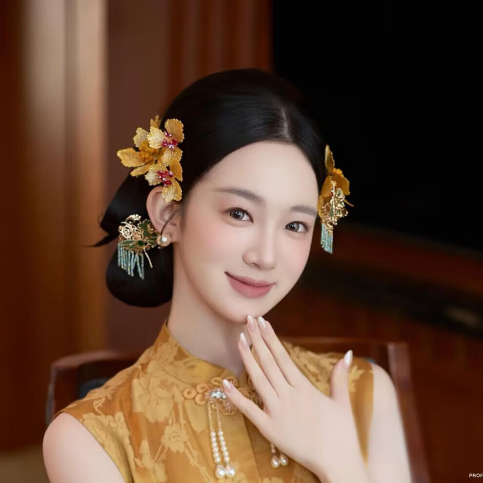 CEENIU bridal Chinese style headwear niche personalized imitation golden flower hair accessories Xiuhe suit dragon and phoenix gown morning gown cheongsam accessories pair (with clip on the back)