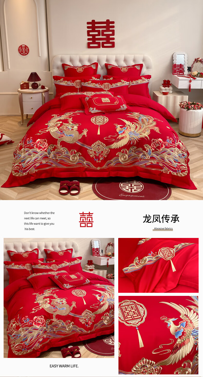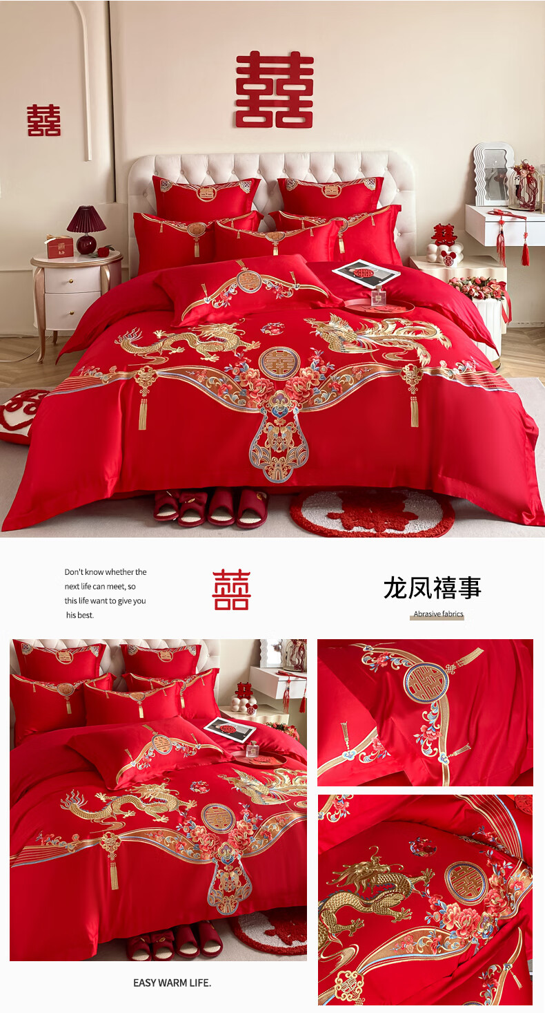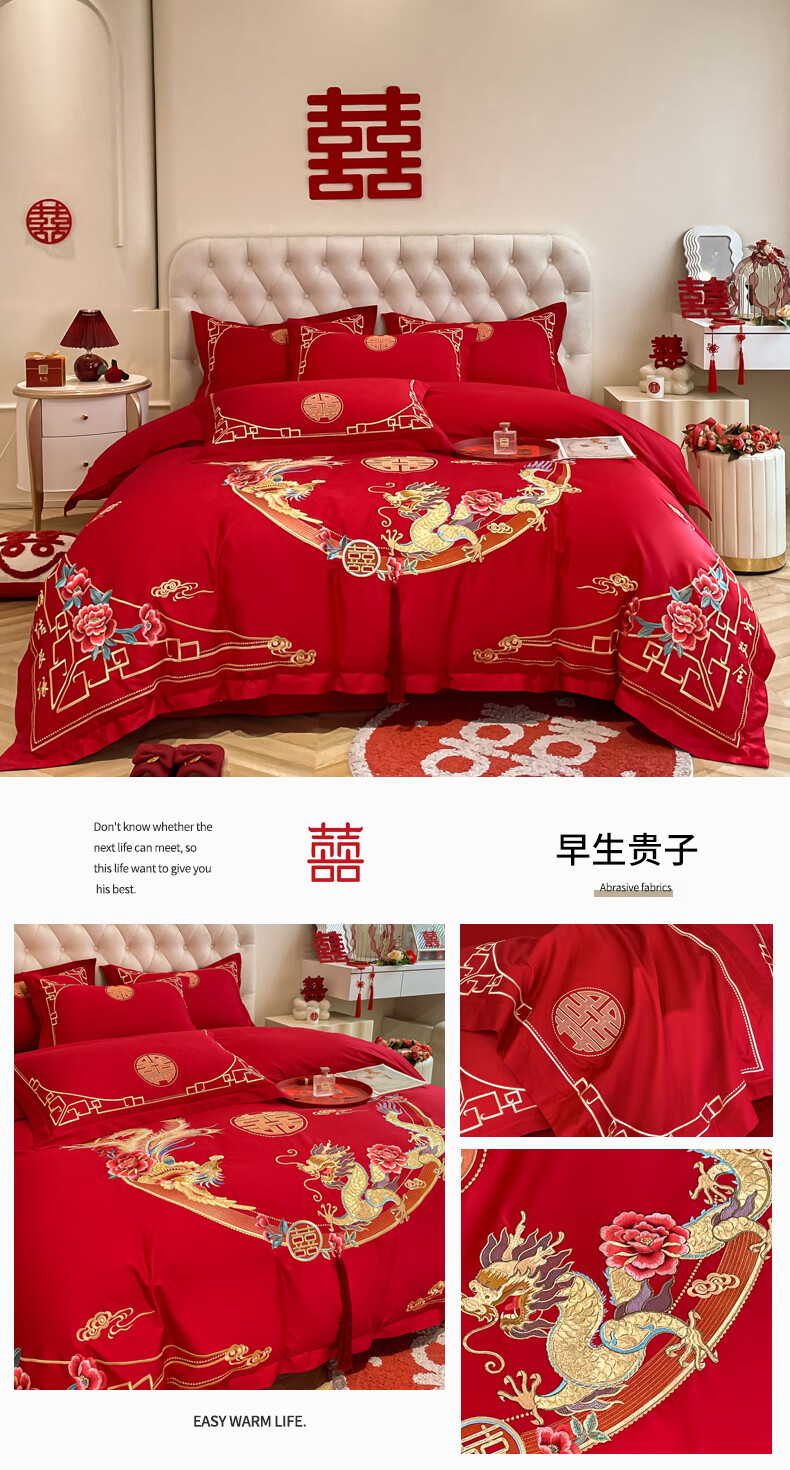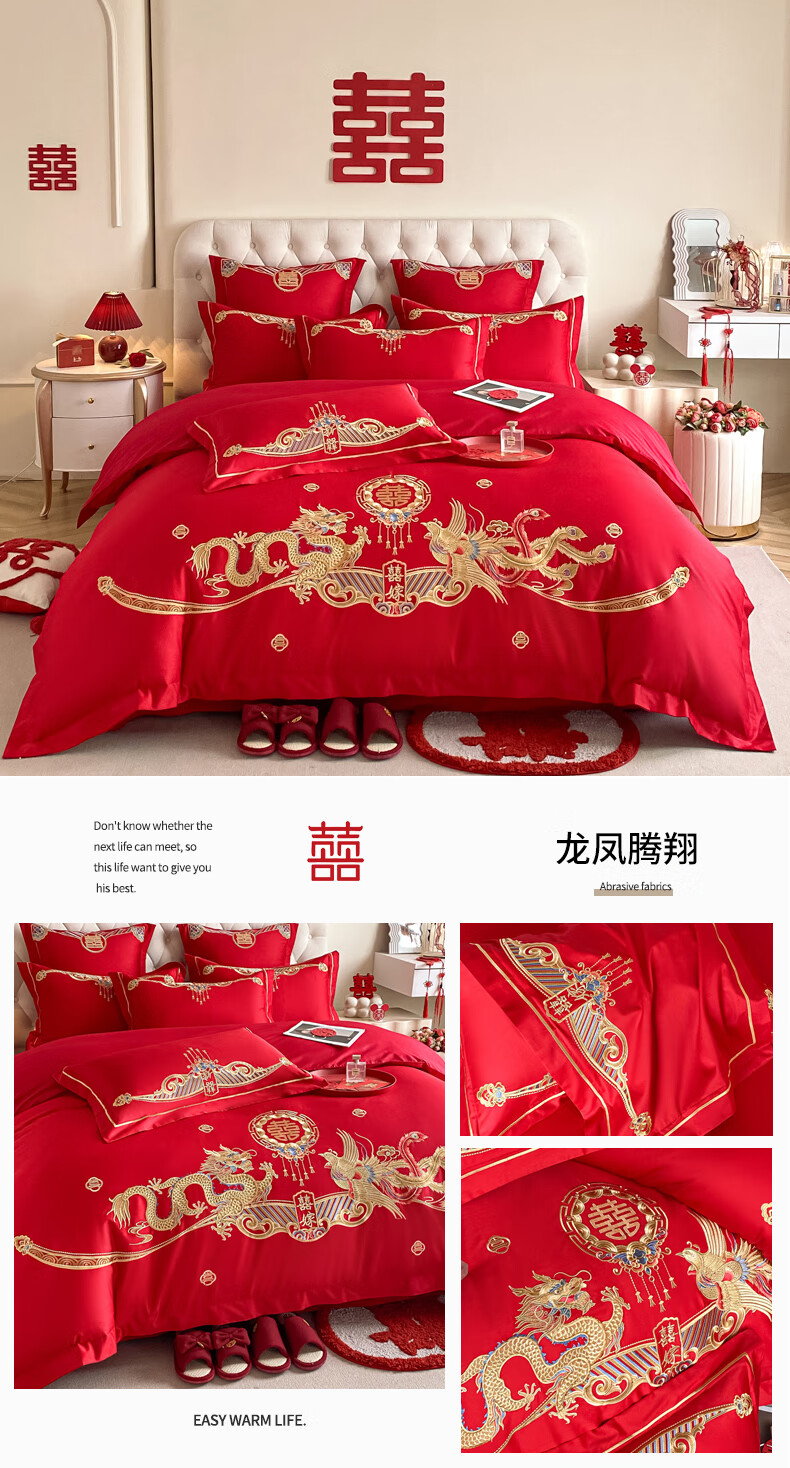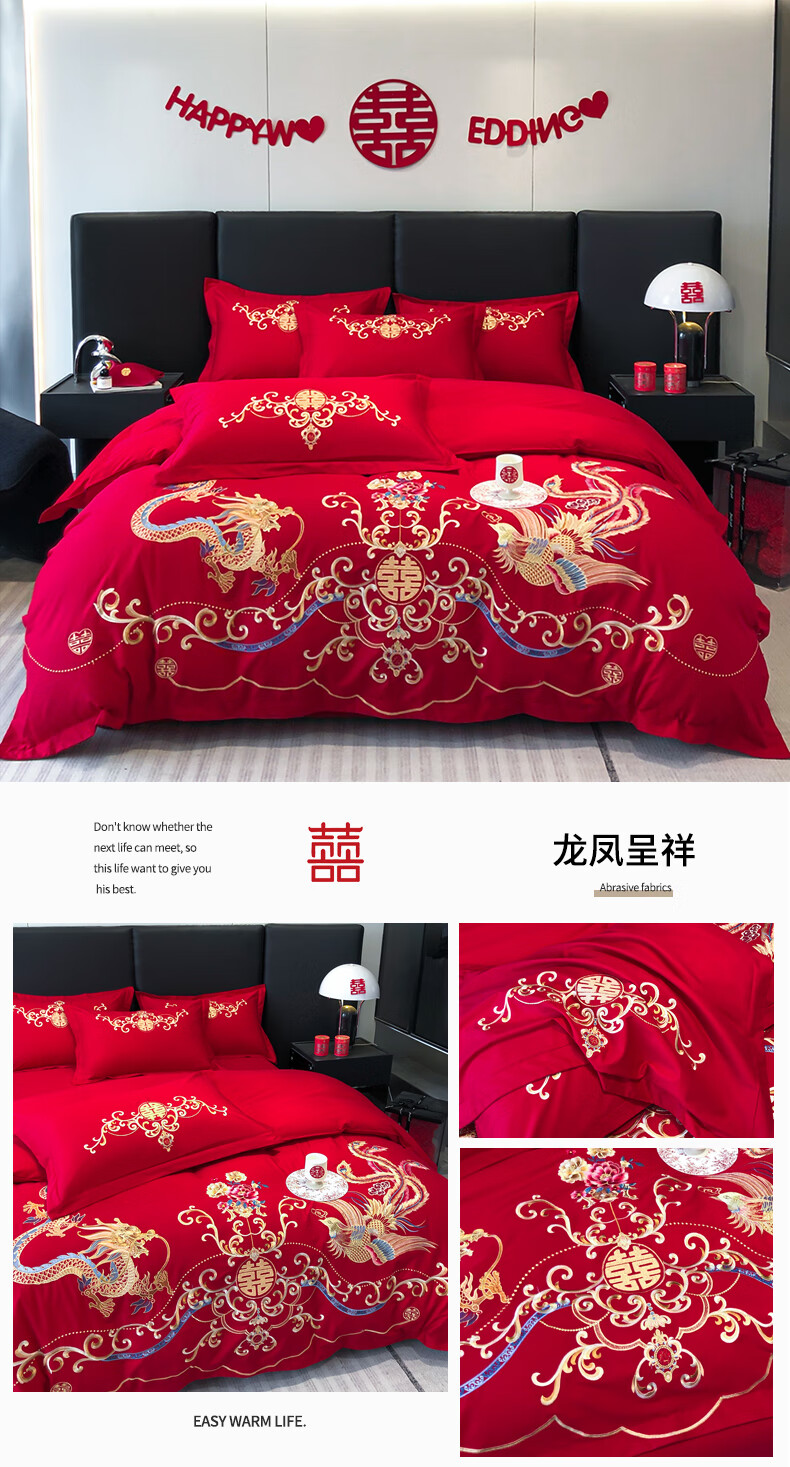 Mercury series home textile cotton wedding four-piece set big red embroidered wedding sheets bedding newlywed wedding room quilt kit dragon and phoenix dragon and phoenix Chengxiang 1.8m bed sheet four-piece set