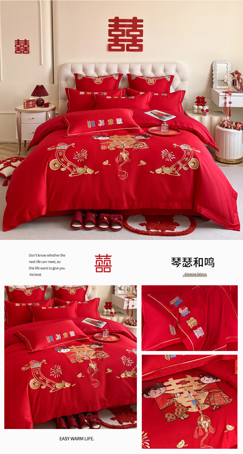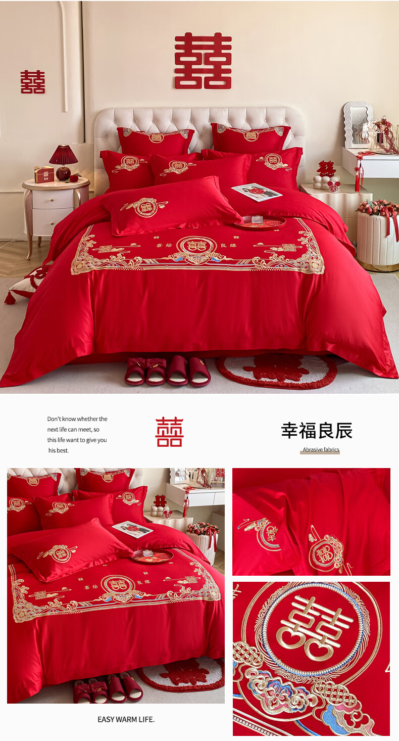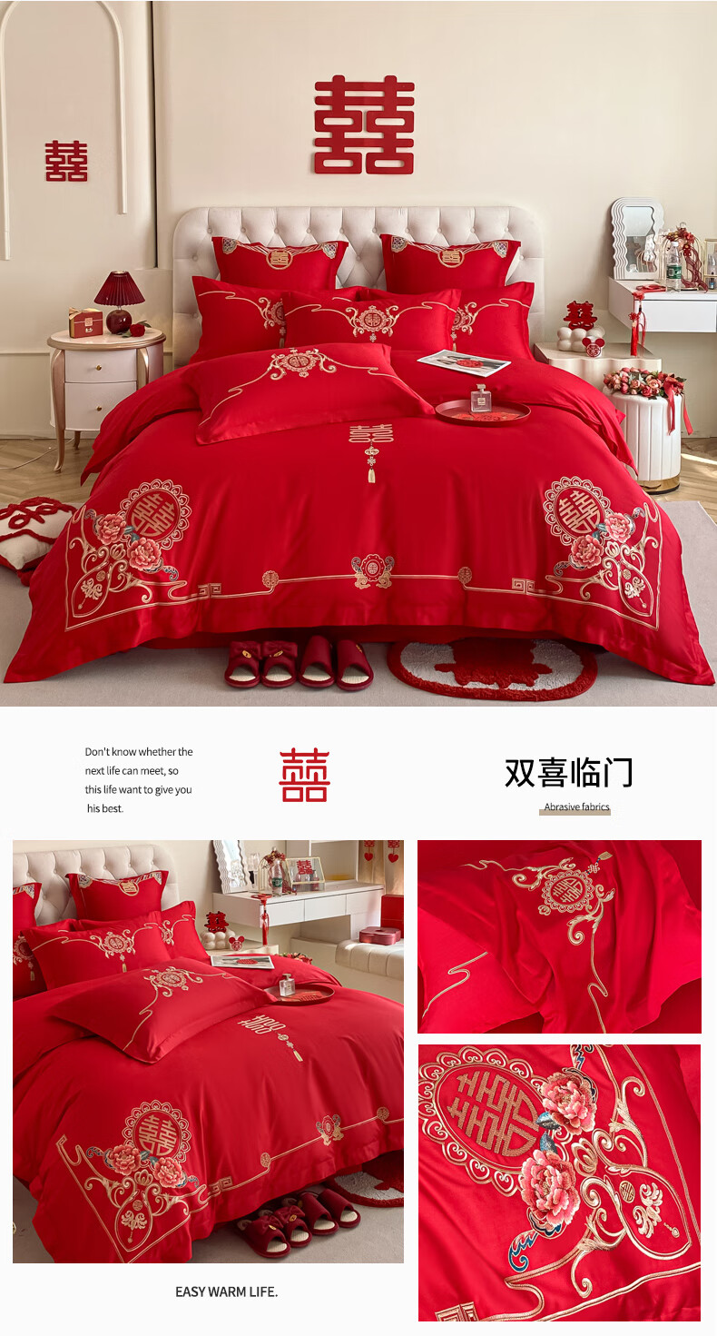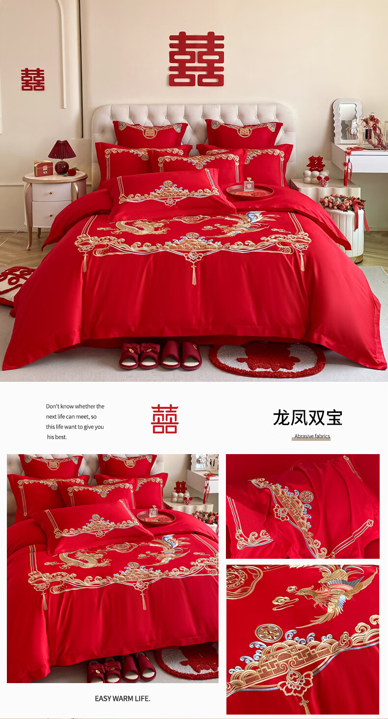 Mercury series home textile cotton wedding four-piece set big red embroidered wedding sheets bedding newlywed wedding room quilt kit dragon and phoenix dragon and phoenix Chengxiang 1.8m bed sheet four-piece set