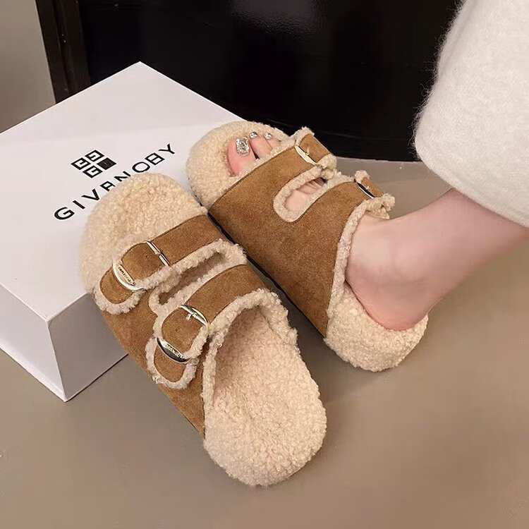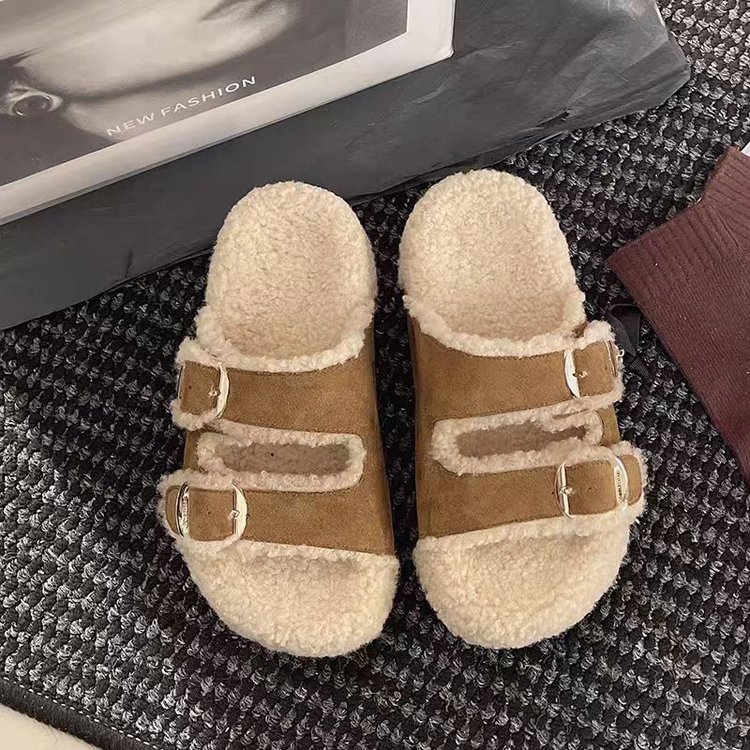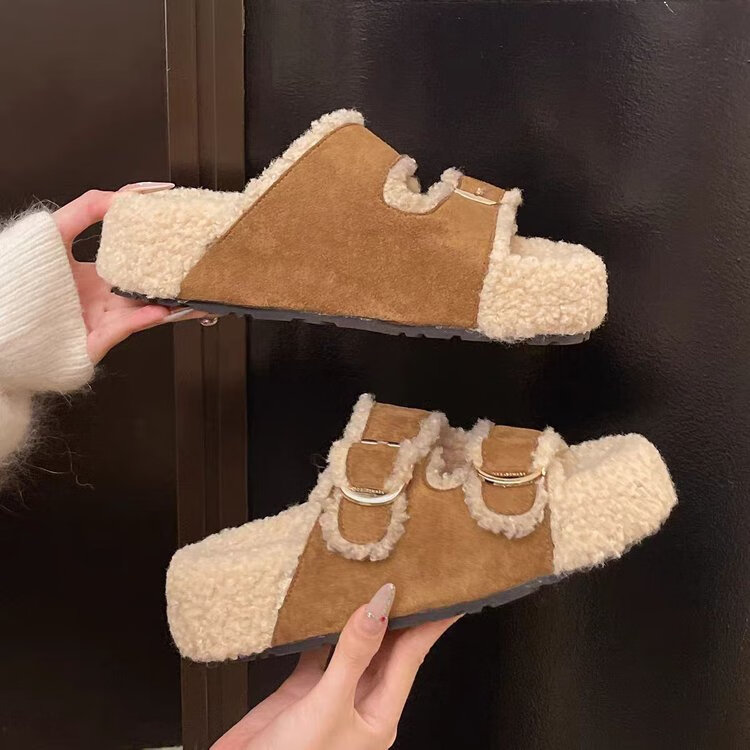 Thick-soled platform Birkenstock furry slippers for women, 2025 autumn and winter new fashion, one-word belt buckle, plush cotton slippers, camel 35