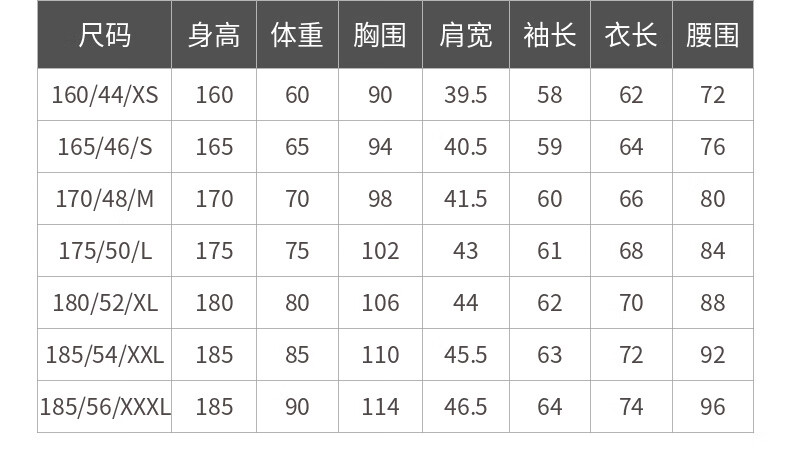 China (cm) 160-165/84-86 165-170 / 88-90 167-172 / 92-96 168-173 / 98-102 170-176 / 106-110