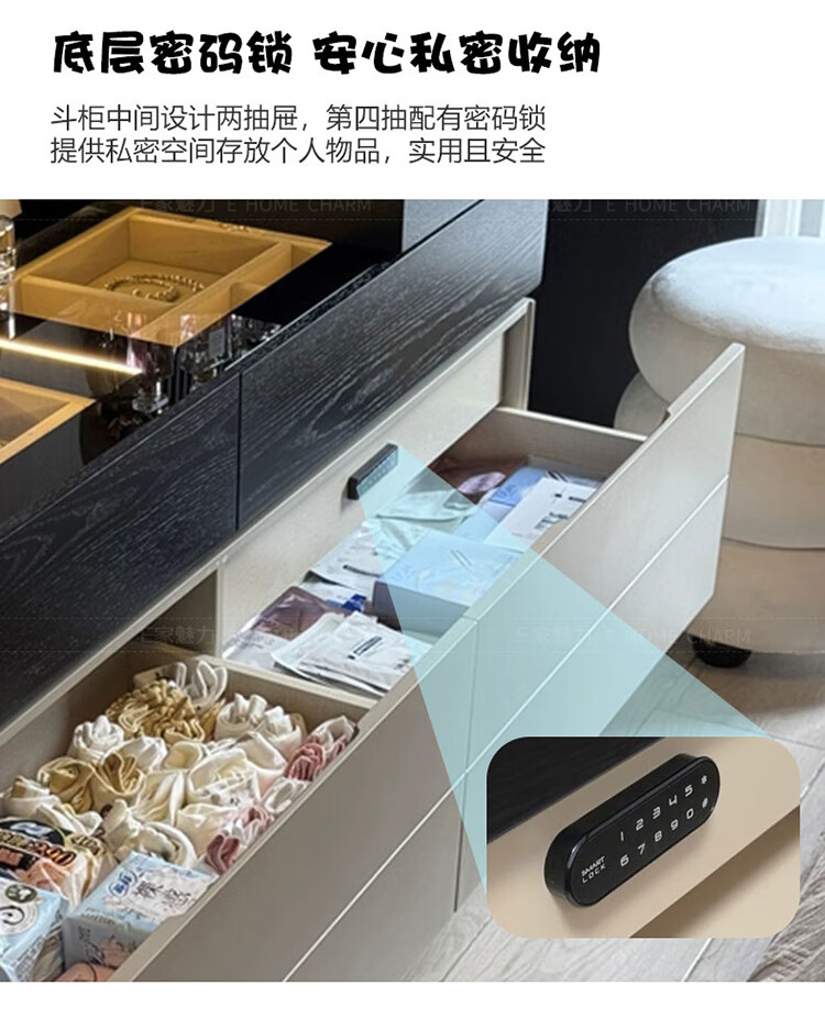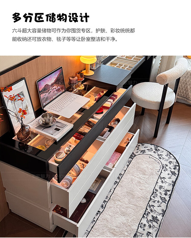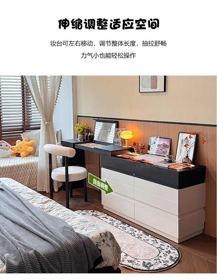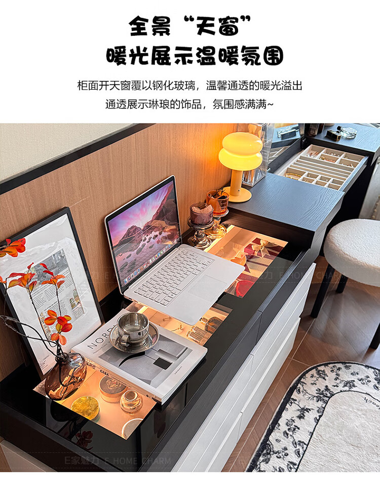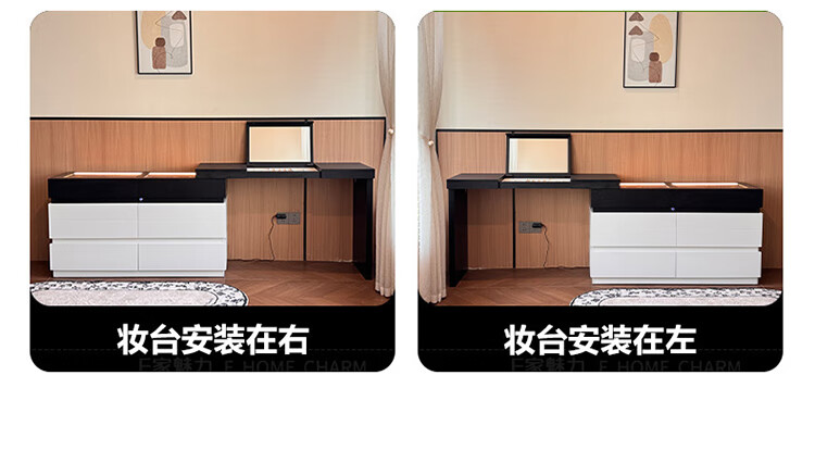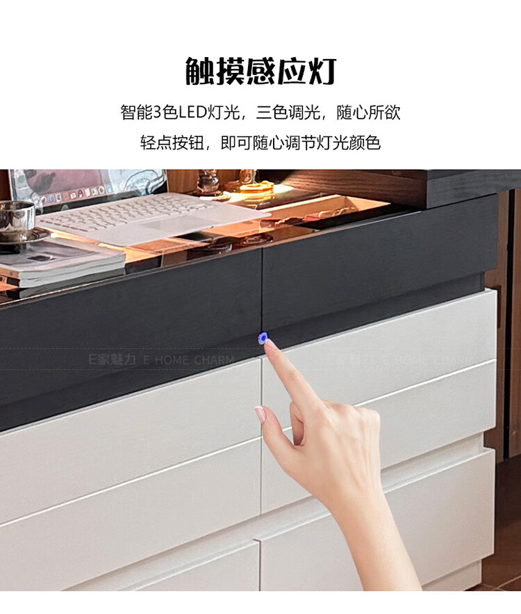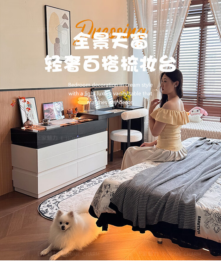 E home charm Italian light luxury flip dresser and drawer integrated bedroom bedside cabinet modern simple storage bedside cabinet dresser flip-up hidden mirror + touch sensor light warm white bull socket + concealed lock 1.2m dresser + 1.2m six drawer cabinet + makeup chair