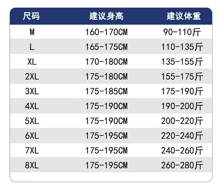 China (cm) 165 / 88-90 170 / 96-98 175 / 108-110 180 / 118-122 185 / 126-130