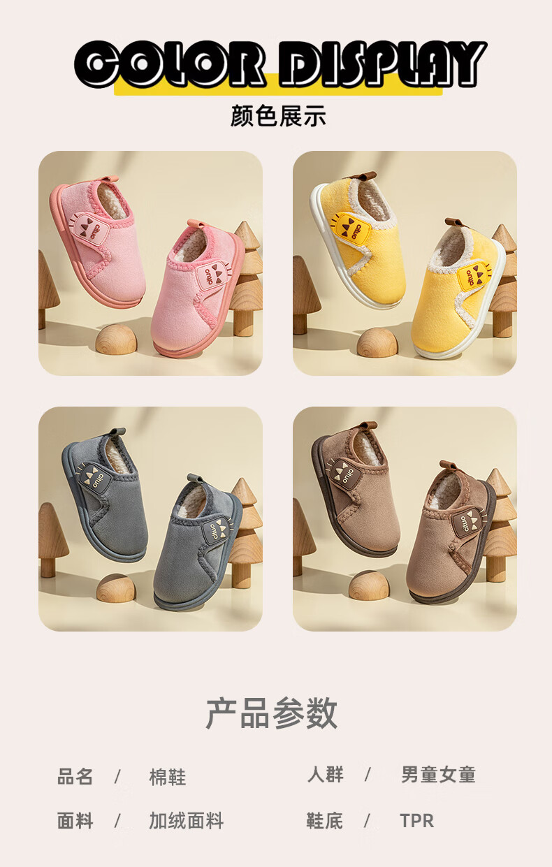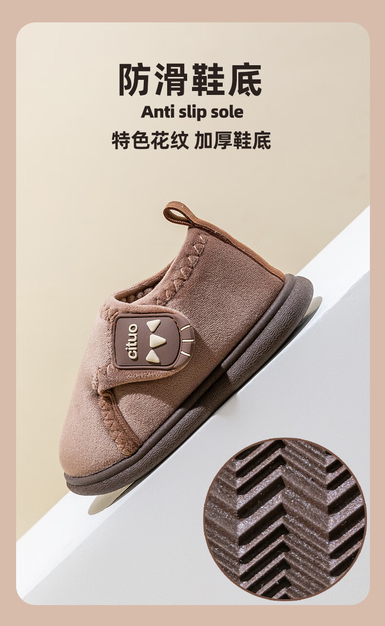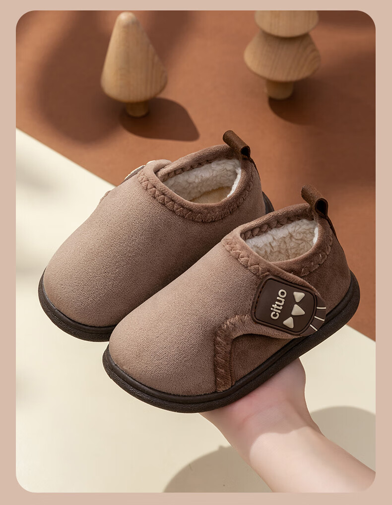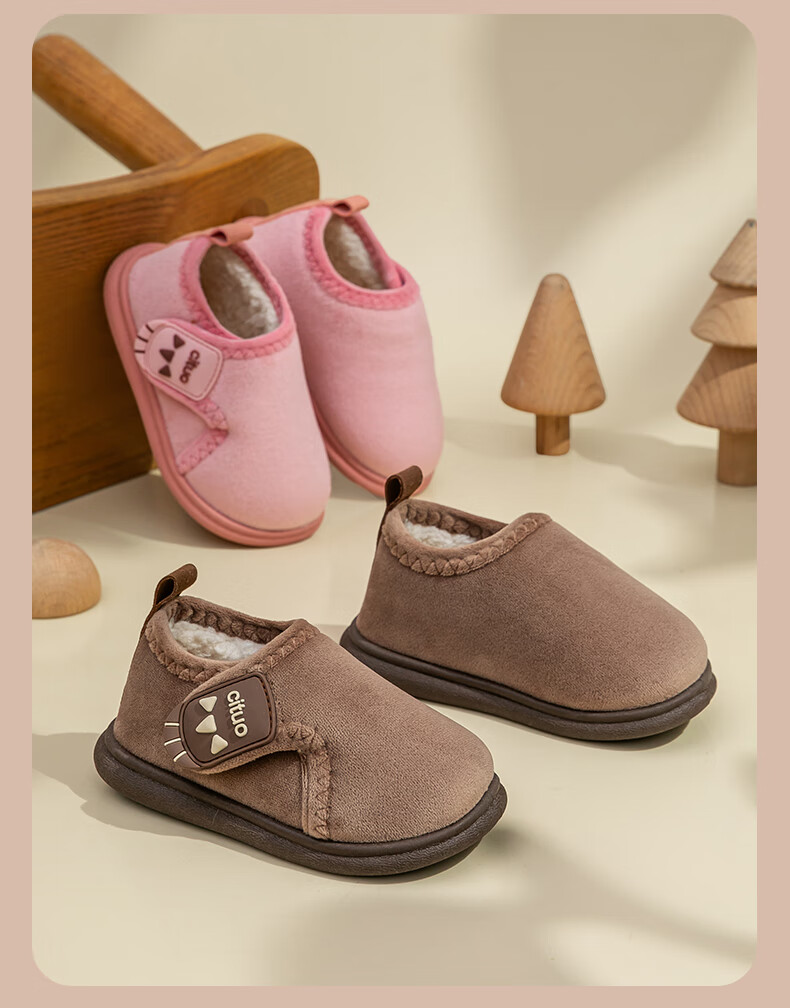 Children's cotton shoes, cute women's winter indoor and outdoor boys' bag-heeled home shoes with Velcro and velvet soft soles, non-slip cotton slippers, brown 18 180, suitable for feet length 16.9-17.8cm