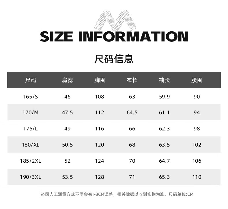 China (cm) 165 / 88-90 170 / 96-98 175 / 108-110 180 / 118-122 185 / 126-130