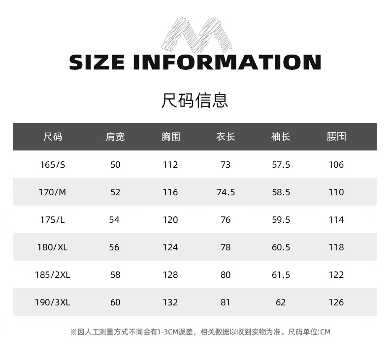 China (cm) 165 / 88-90 170 / 96-98 175 / 108-110 180 / 118-122 185 / 126-130
