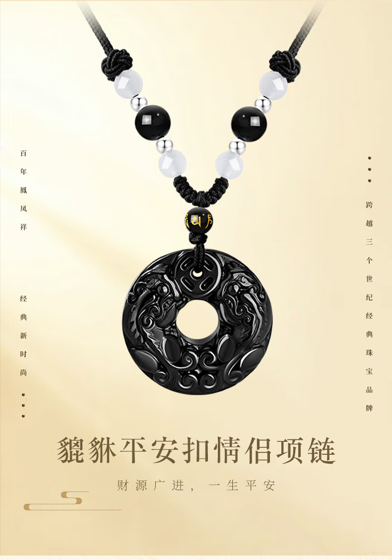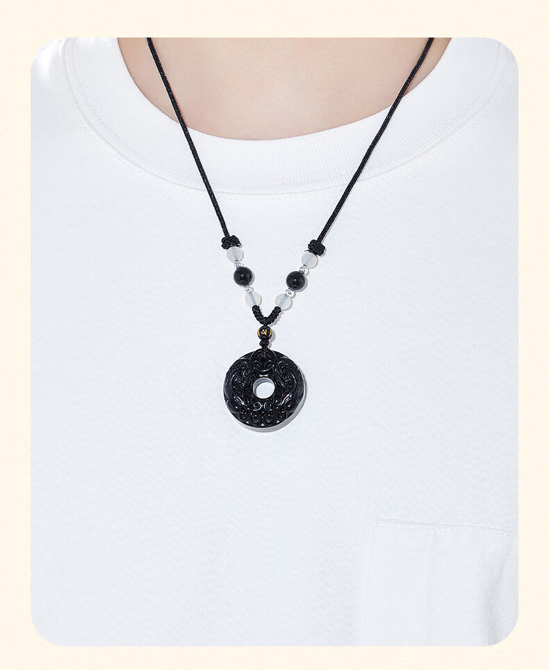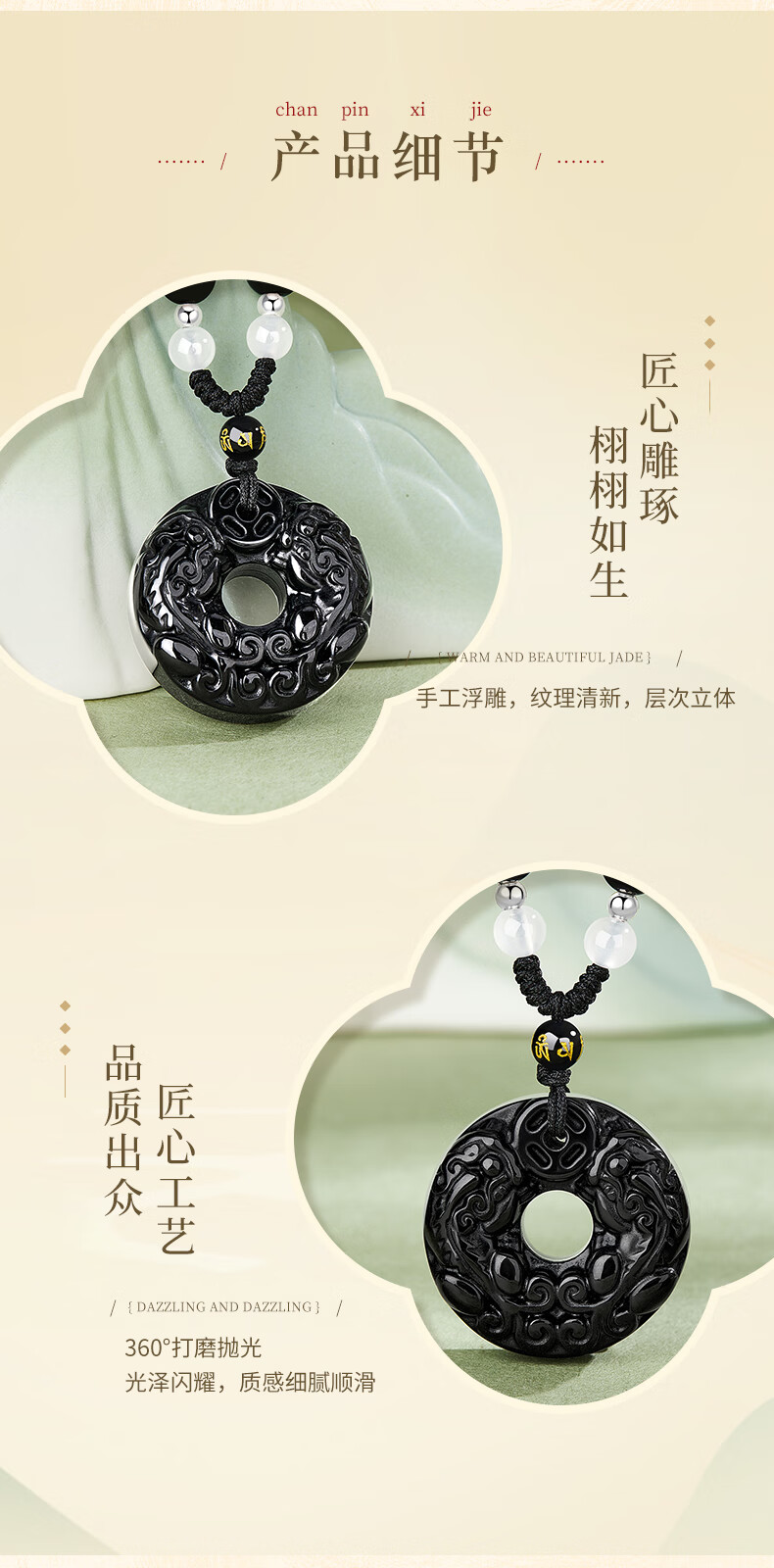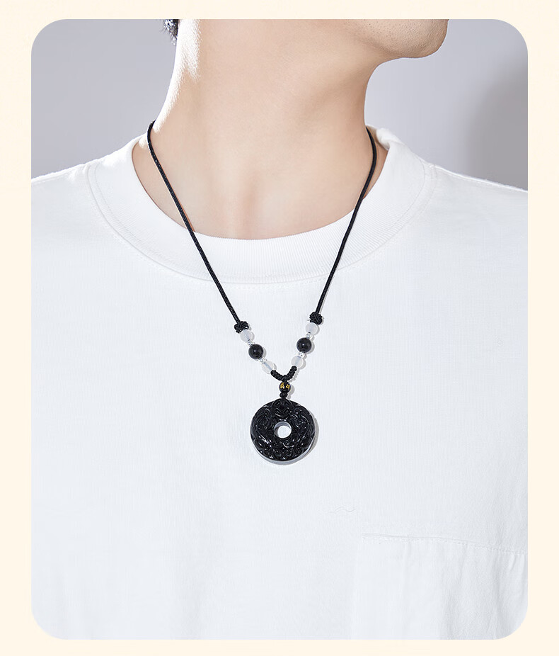 Lao Fengxiang Pixiu Obsidian Peace Buckle Silver Necklace Men's Agate Pendant Jewelry Anniversary Birthday Gift Boyfriend Husband Quality Obsidian Pixiu Peace Buckle Necklace