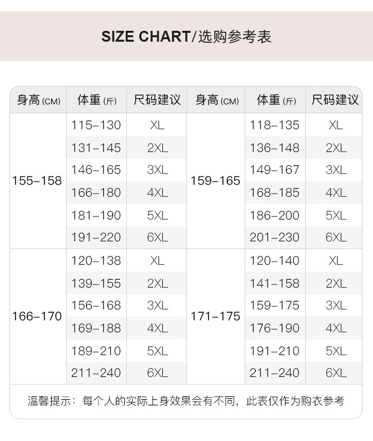 China (cm) 160-165/84-86 165-170 / 88-90 167-172 / 92-96 168-173 / 98-102 170-176 / 106-110