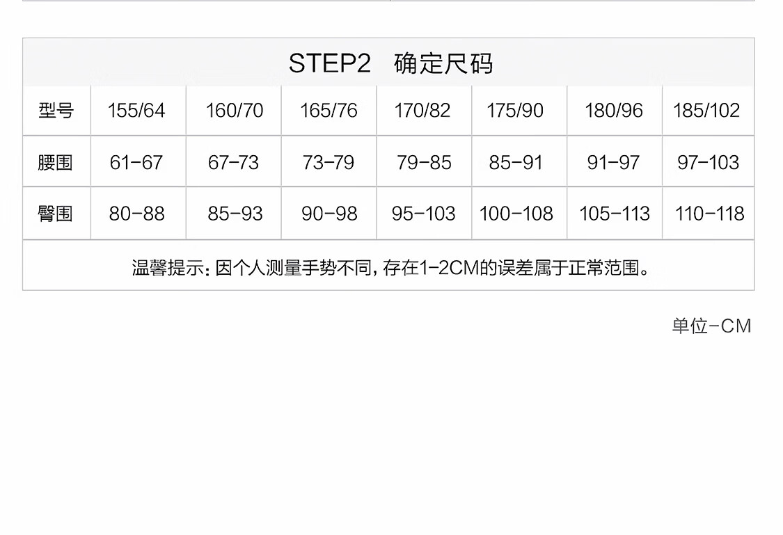 China (cm) 160-165/84-86 165-170 / 88-90 167-172 / 92-96 168-173 / 98-102 170-176 / 106-110