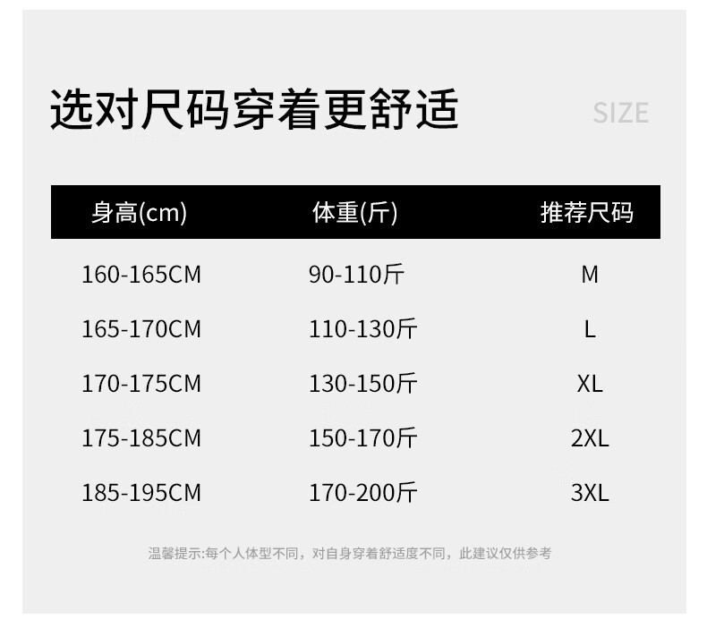 China (cm) 165 / 88-90 170 / 96-98 175 / 108-110 180 / 118-122 185 / 126-130