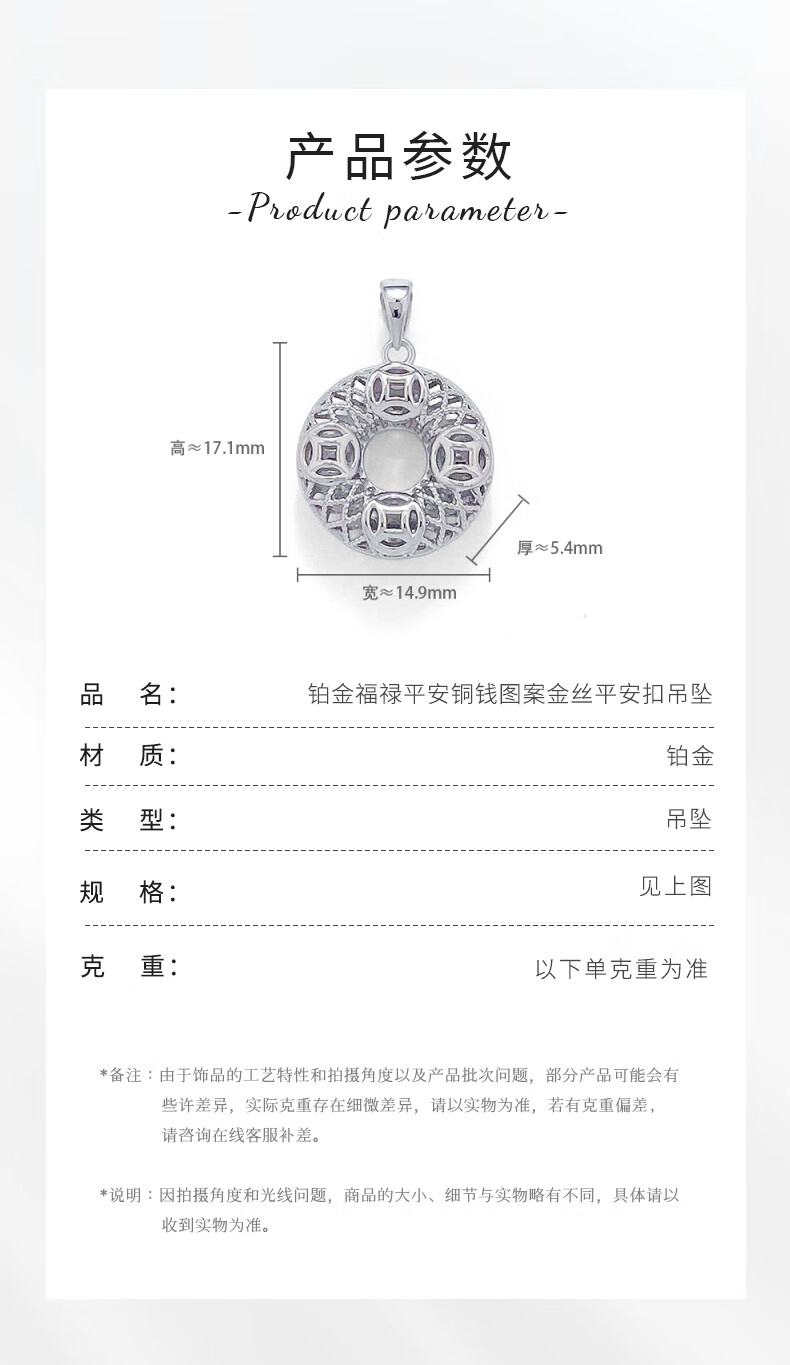 China Gold (CHINA GOLD) platinum pendant pt950 Fulu Ping An copper coin pattern gold wire Ping An buckle pendant as a gift for girlfriend and wife, about 2.7g