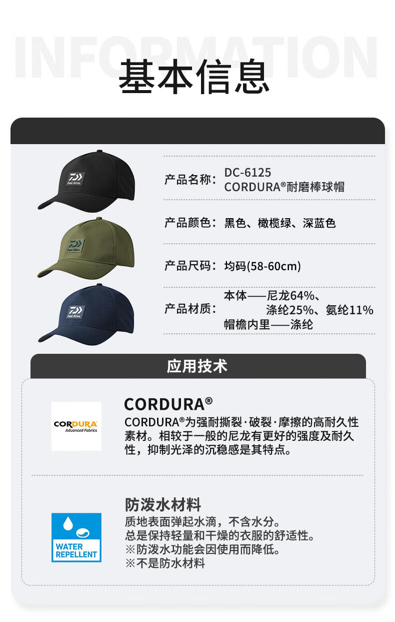 DAIWA 25 Autumn and Winter DC-6125 Water-Repellent Fishing Hat Wear-Resistant Peaked Cap Casual Sun Hat Black One Size