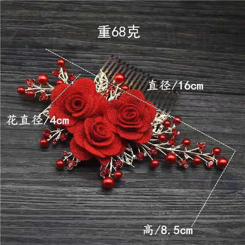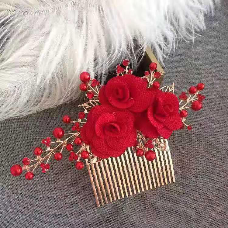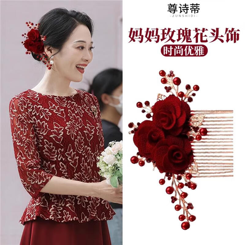 Meng Junchen Xis Schwiegermutter-Hochsteckfrisur, Hochzeit, Hochzeit, glückliche Mutter mittleren Alters, Stil, Hochzeitsbankett, Hochsteckfrisur, Haarschmuck, Hochzeitskopf, Blume, exquisites High-End-Rot